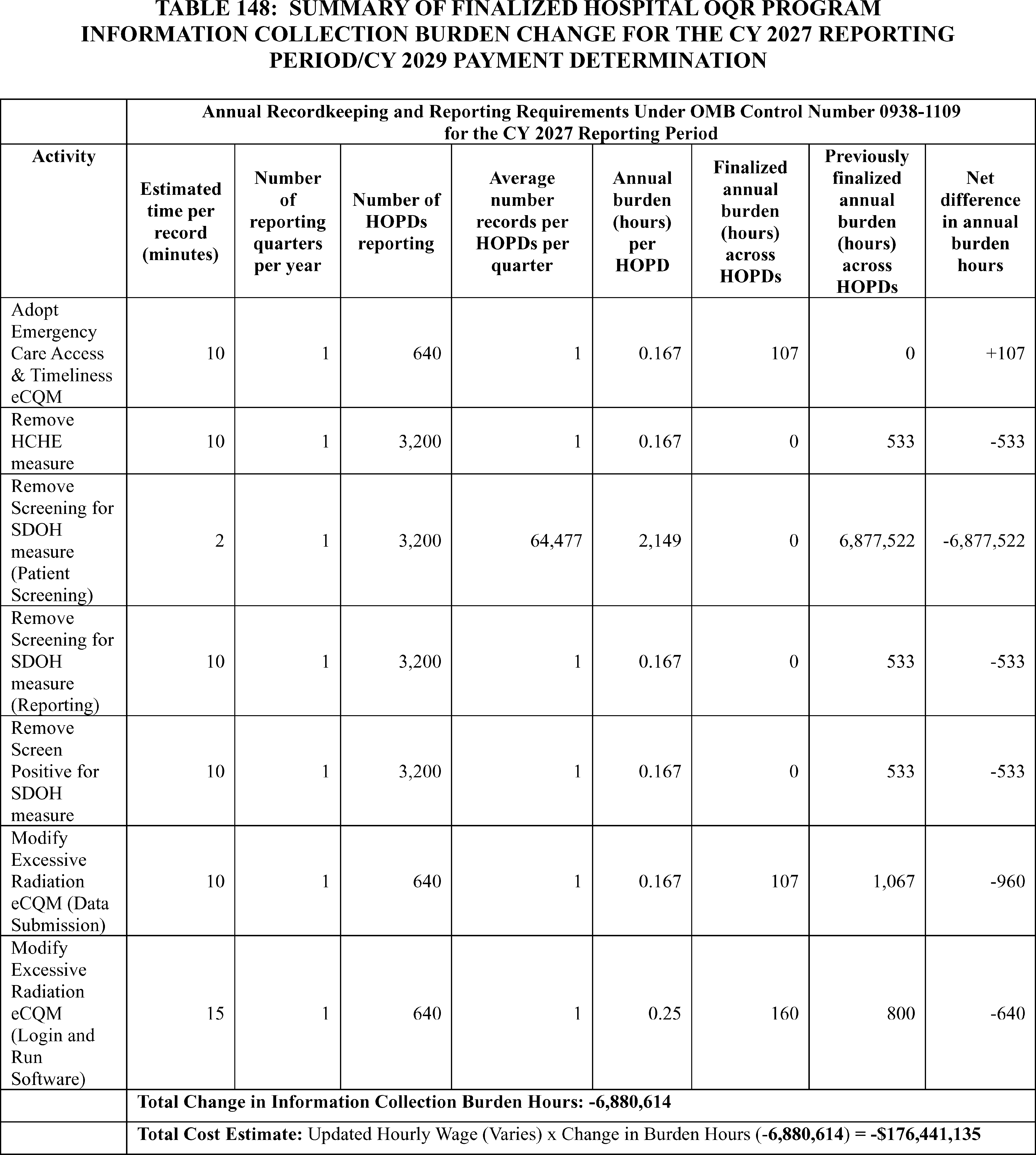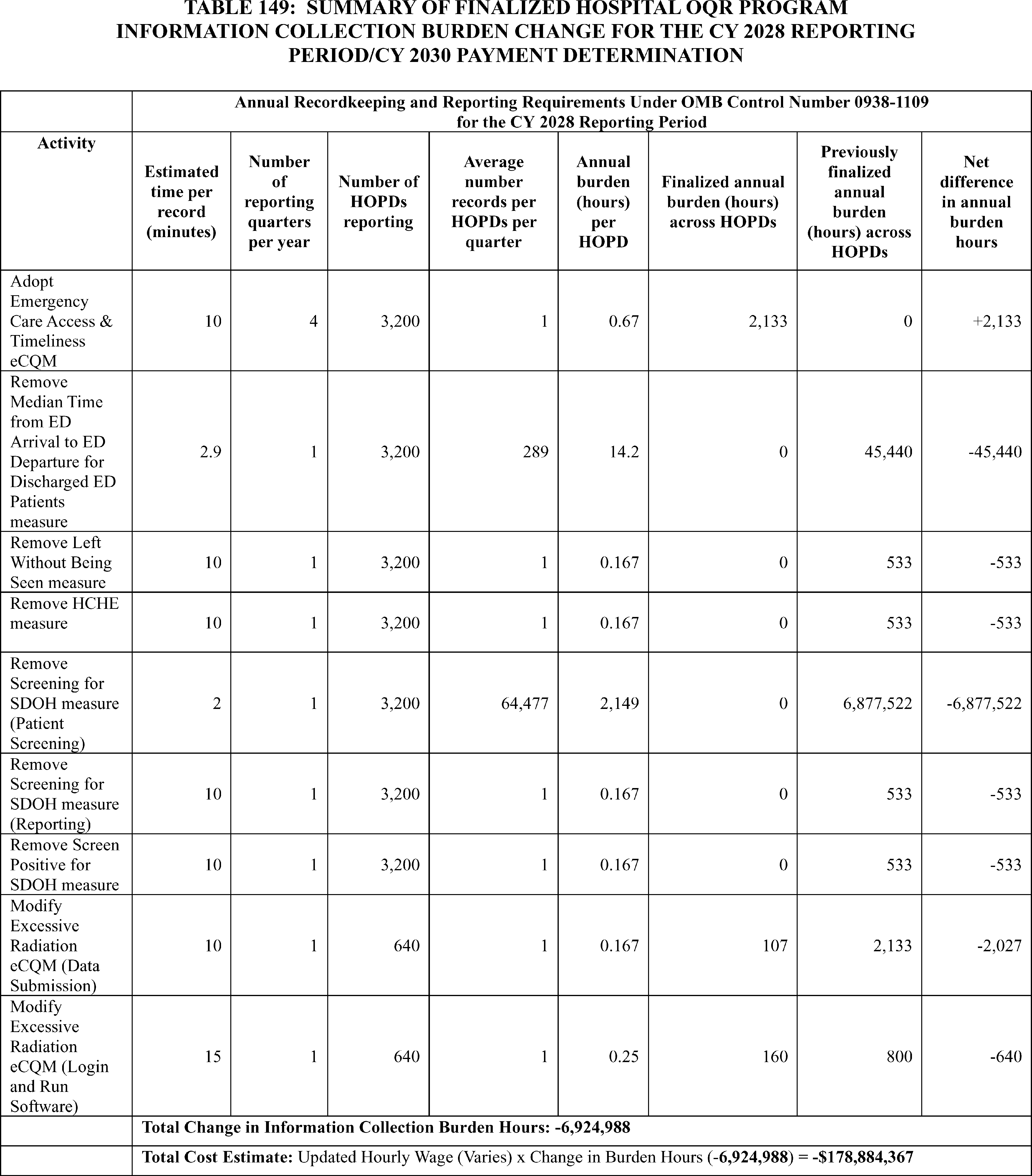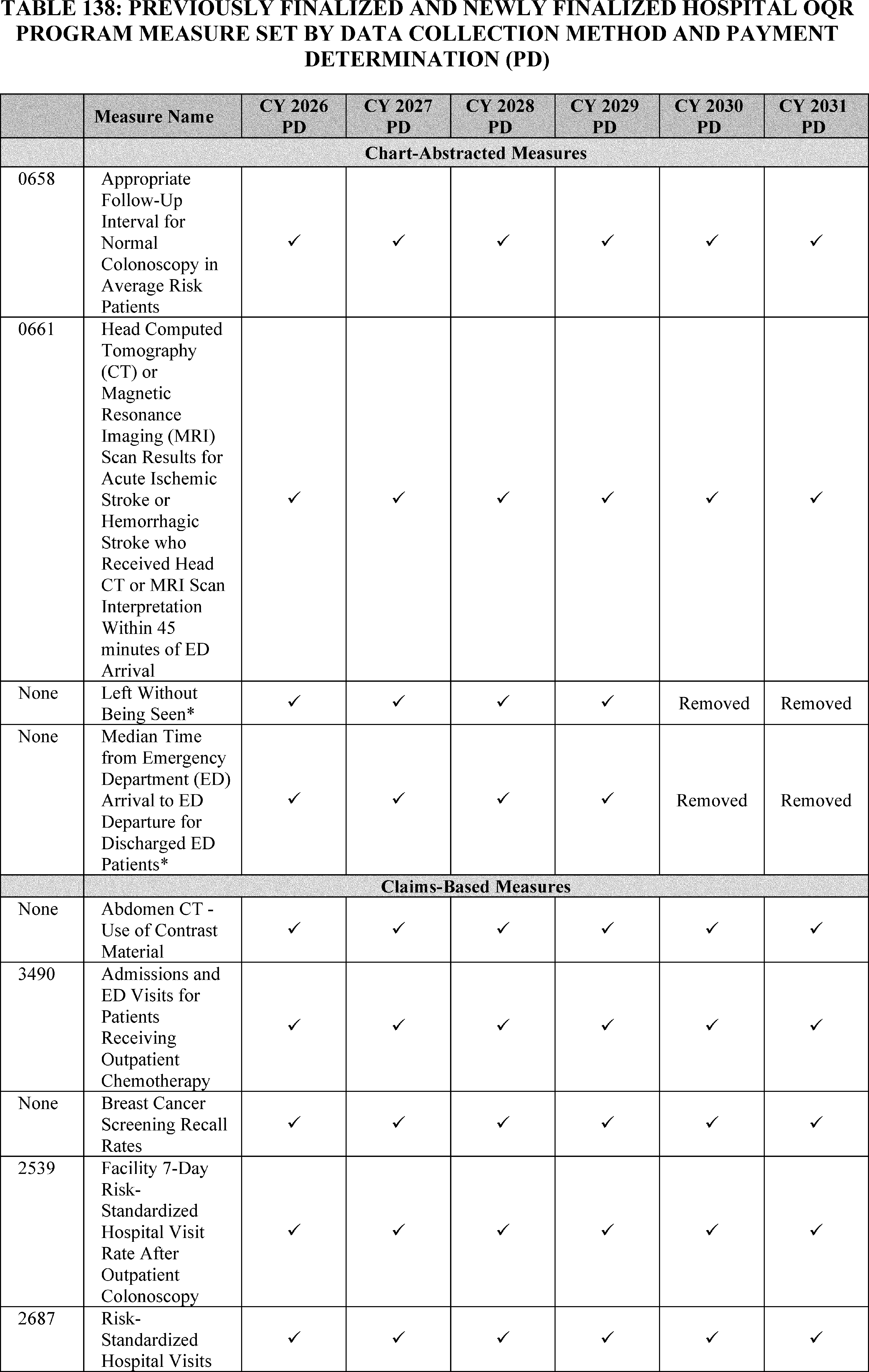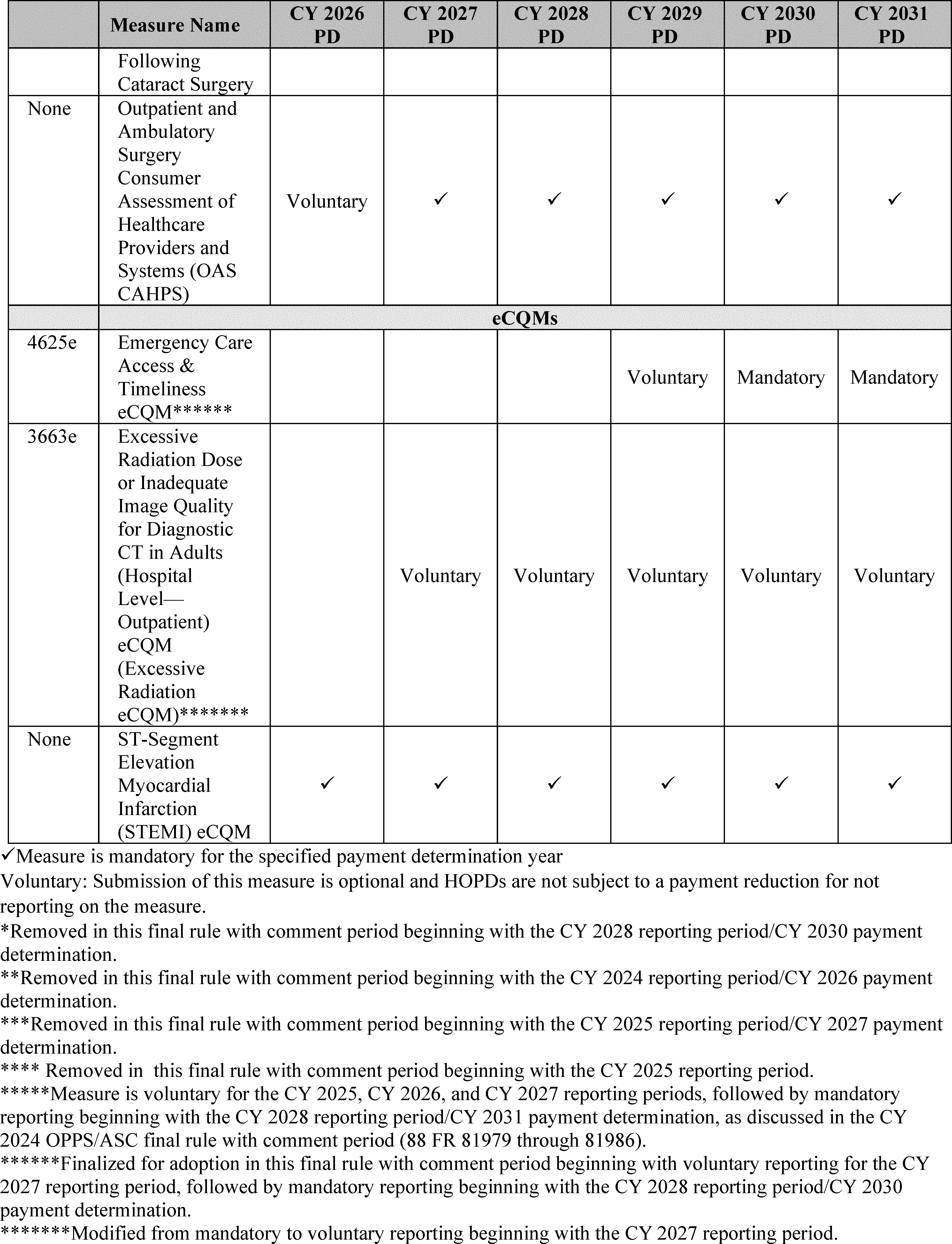 - Hospital Outpatient Quality Reporting (OQR) Program: In addition to the cross-program measure and policy updates, we are finalizing: (1) adoption of the Emergency Care Access & Timeliness eCQM with 1 year of voluntary reporting for the CY 2027 reporting period followed by mandatory reporting for the CY 2028 reporting period/CY 2030 payment determination and subsequent years; (2) removal of the Median Time from Emergency Department (ED) Arrival to ED Departure for Discharged ED Patients and the Left Without Being Seen measures beginning with the CY 2028 reporting period/2030 payment determination; and (3) modification of the Excessive Radiation Dose or Inadequate Image Quality for Diagnostic Computed Tomography (CT) in Adults (Hospital Level—Outpatient) measure (Excessive Radiation eCQM) from mandatory reporting beginning with the CY 2027 reporting period to continue voluntary reporting in the CY 2027 reporting period and subsequent years.