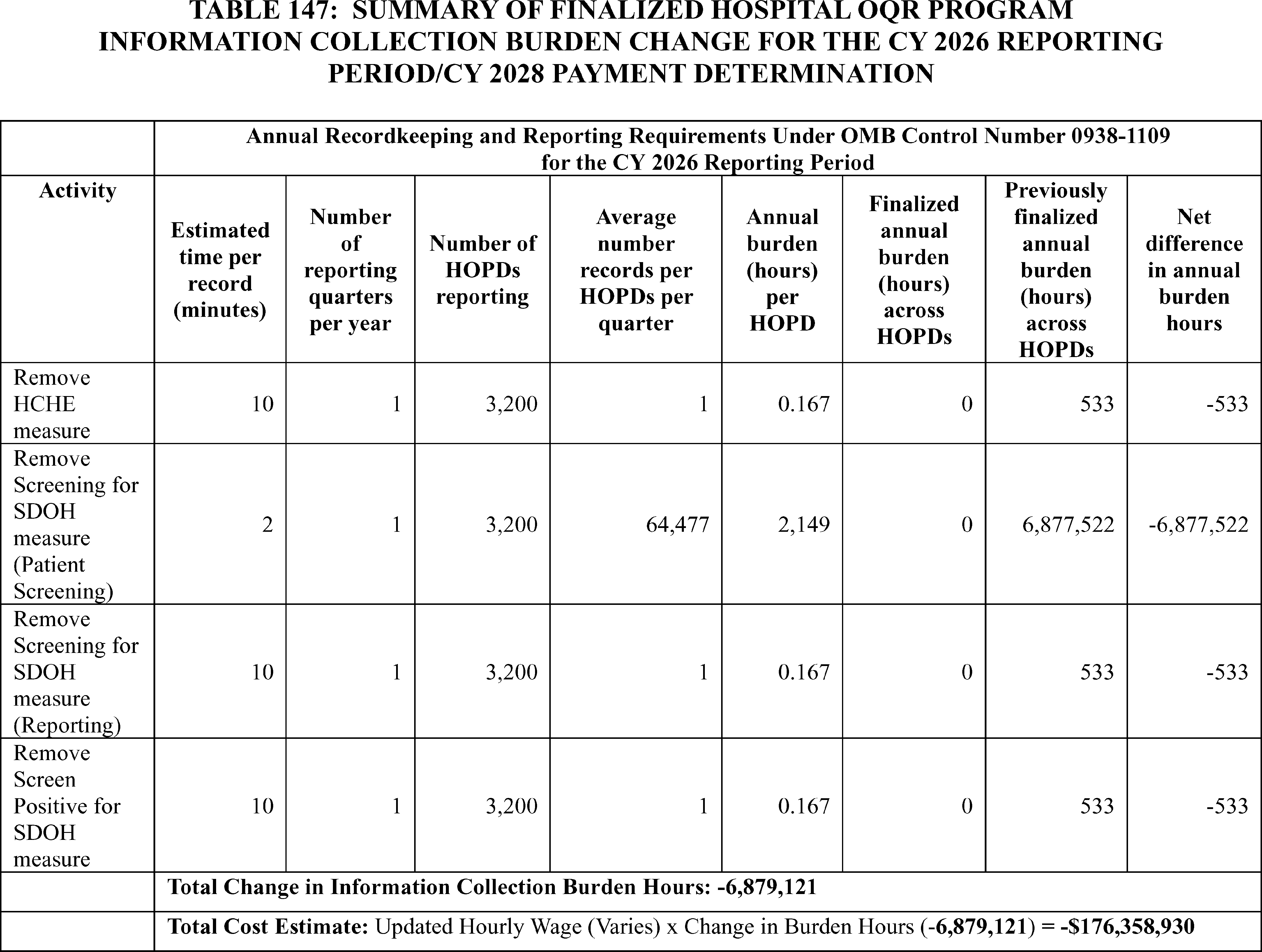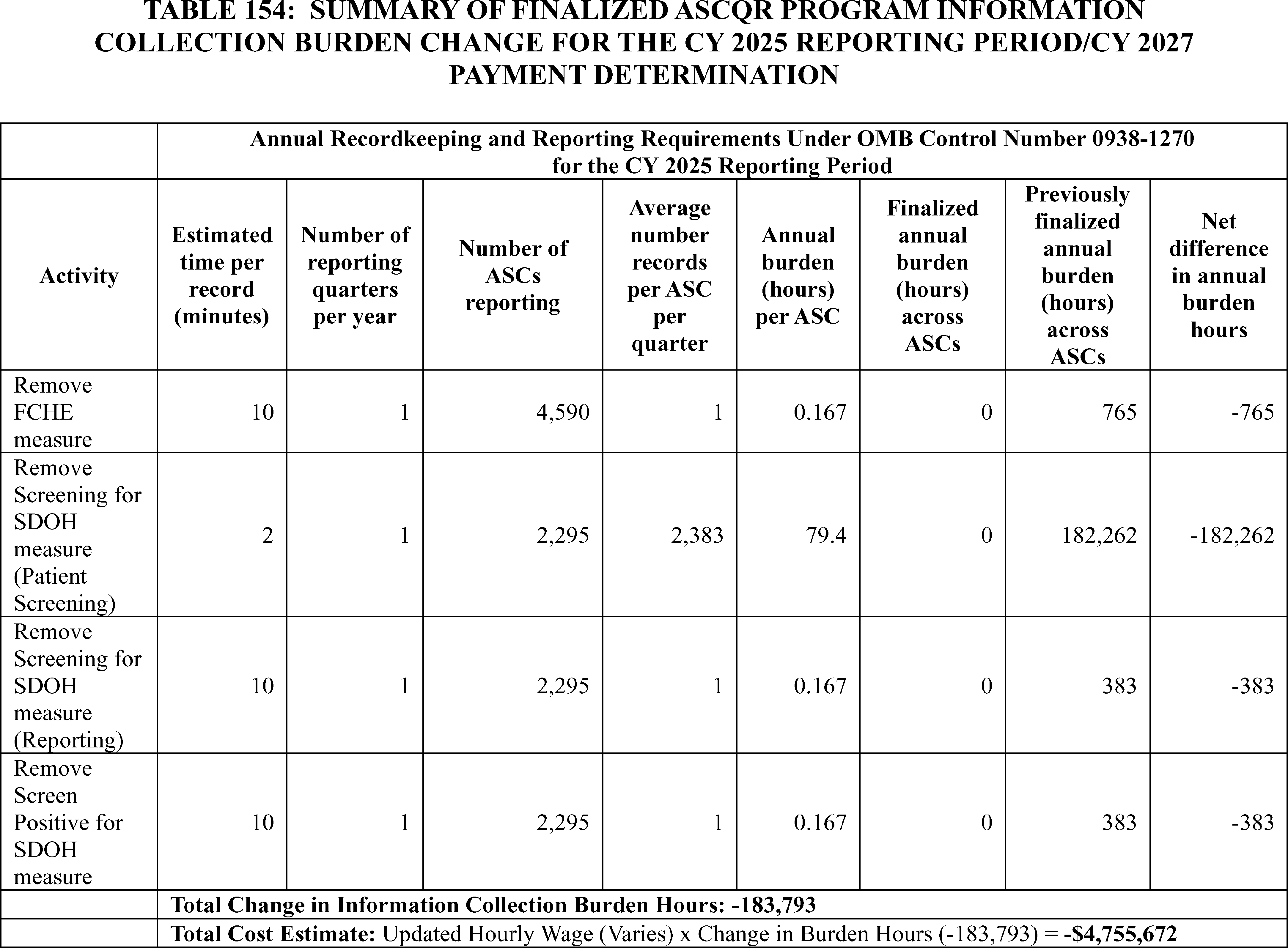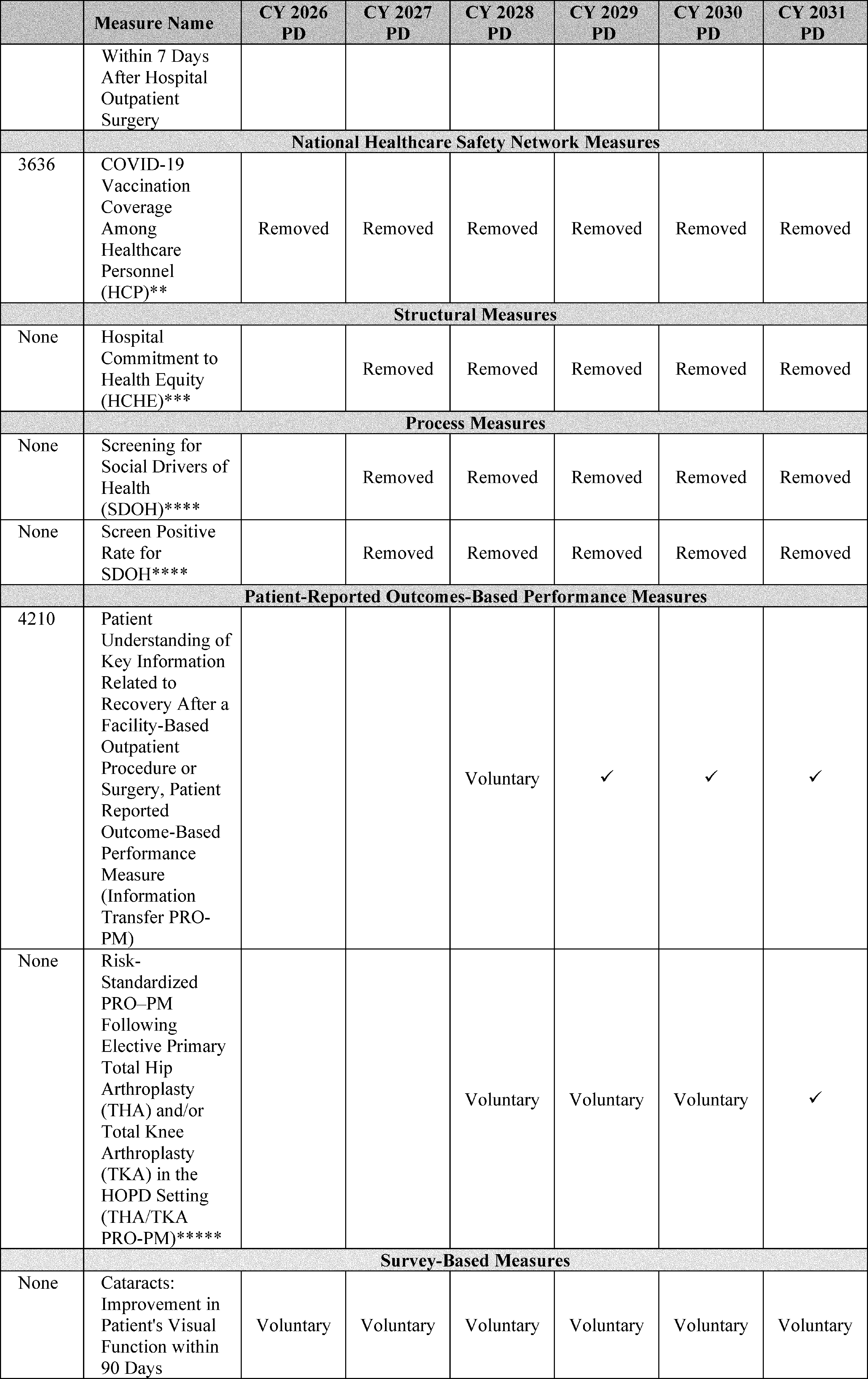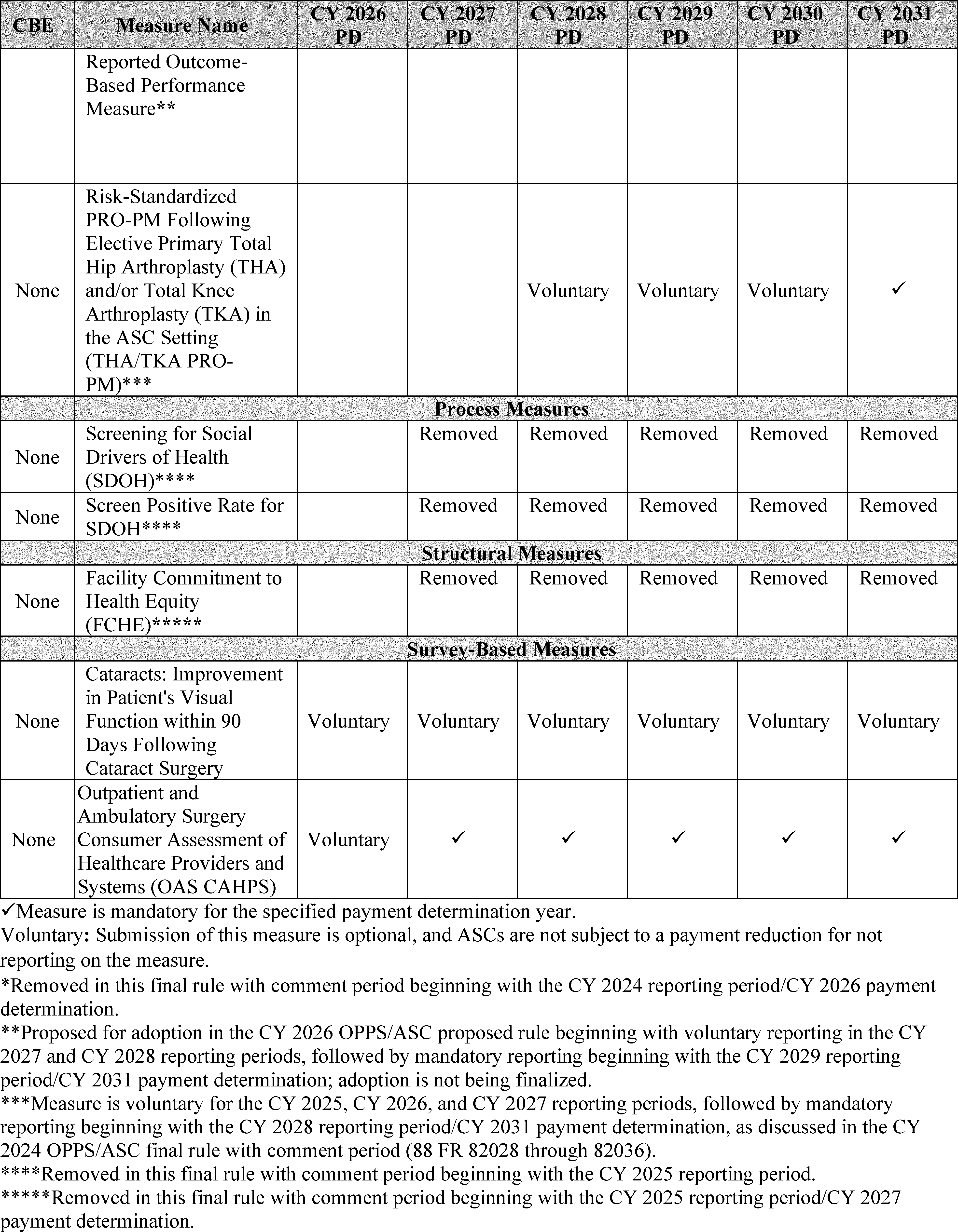 - Cross-Program Updates for the Hospital Outpatient Quality Reporting (OQR), Rural Emergency Hospital Quality Reporting (REHQR), and Ambulatory Surgical Center Quality Reporting (ASCQR) Programs: We are finalizing the removal of: (1) the COVID-19 Vaccination Coverage Among Healthcare Personnel (HCP) measure from the Hospital OQR and ASCQR Program measure sets beginning with the CY 2024 reporting period/CY 2026 payment determination; (2) the Hospital Commitment to Health Equity (HCHE) measure from the Hospital OQR and REHQR Program measure sets, and the Facility Commitment to Health Equity (FCHE) measure from the ASCQR Program measure set beginning with the CY 2025 reporting period/CY 2027 payment or program determination; and (3) the Screening for Social Drivers of Health (SDOH) measure and the Screen Positive Rate for SDOH measure from the Hospital OQR, REHQR, and ASCQR Program measure sets beginning with the CY 2025 reporting period. Additionally, we received comments regarding measure concepts related to well-being and nutrition for future consideration in the Hospital OQR, REHQR, and ASCQR Programs. We are finalizing our proposal to update and codify the Extraordinary Circumstance Exception (ECE) policy to clarify that CMS has the discretion to grant an extension in response to an ECE request for the Hospital OQR, REHQR, and ASCQR Programs.