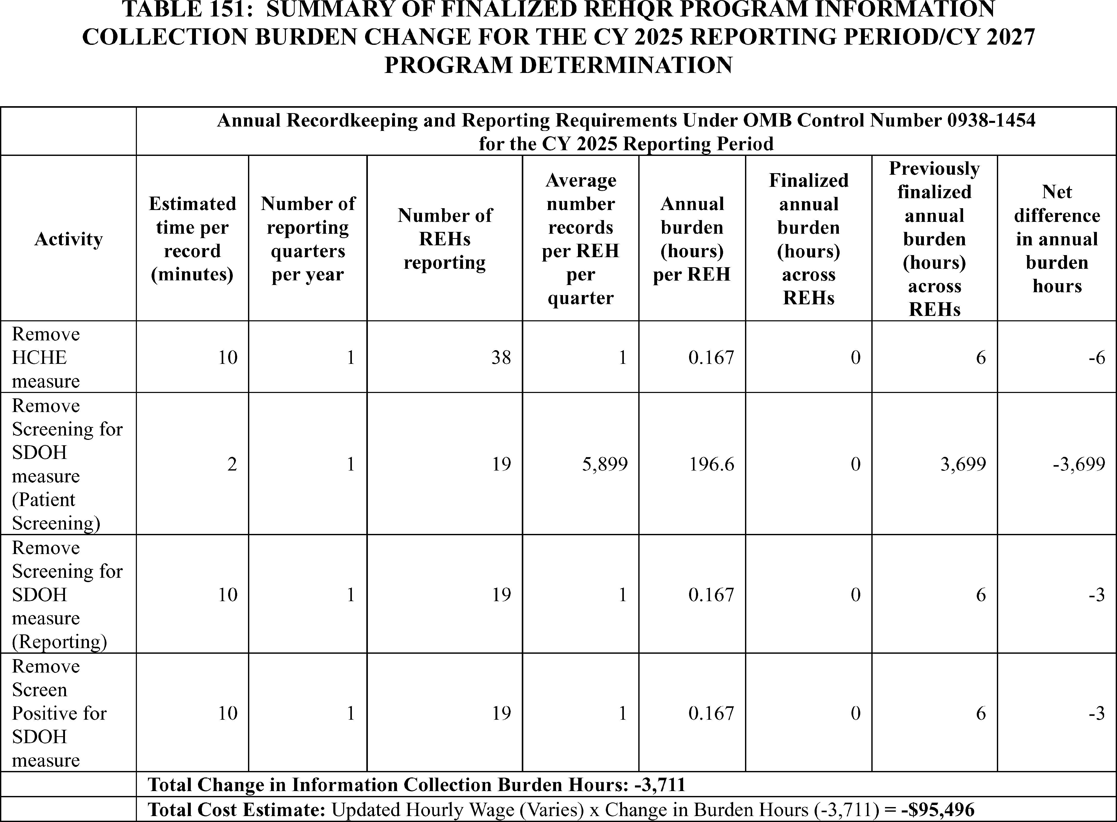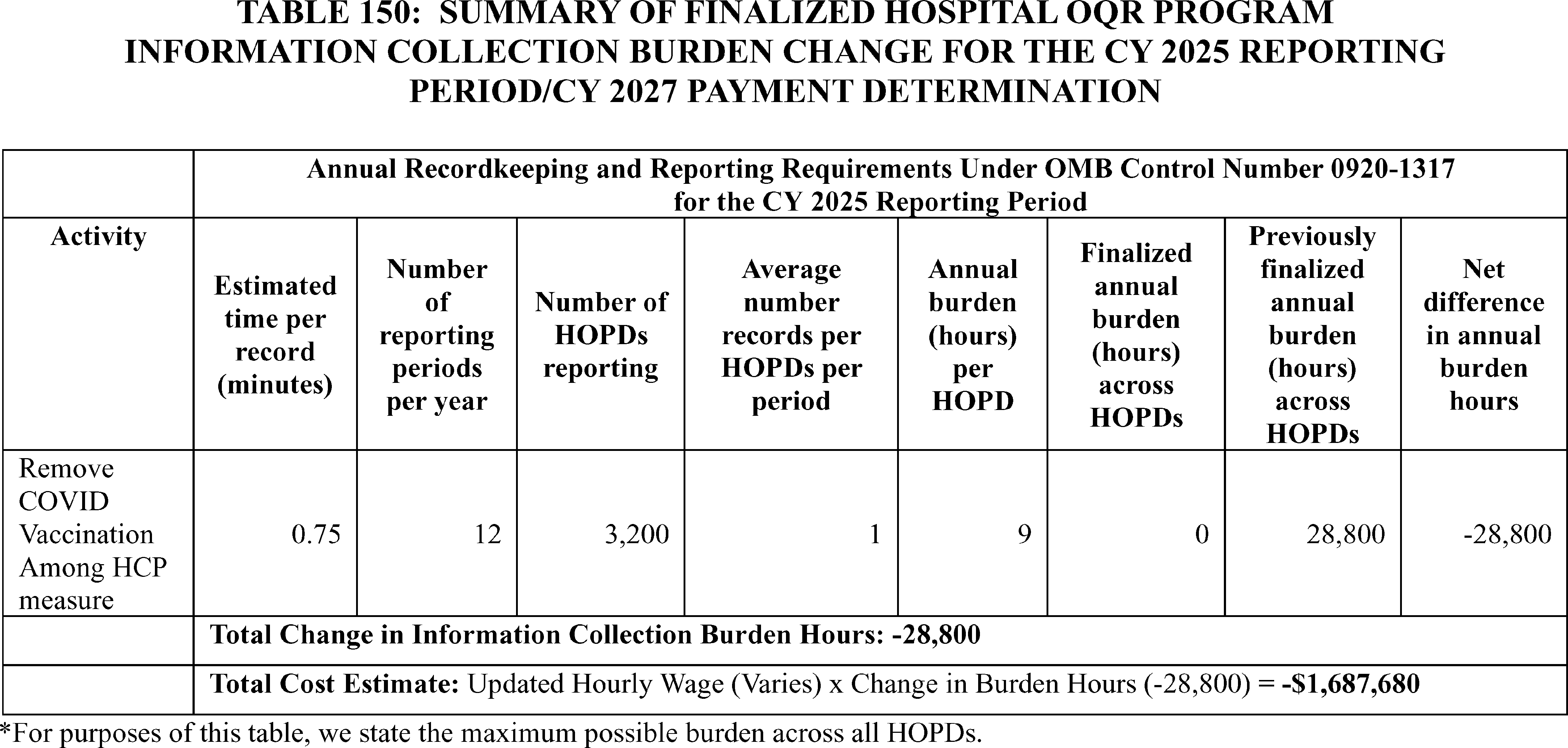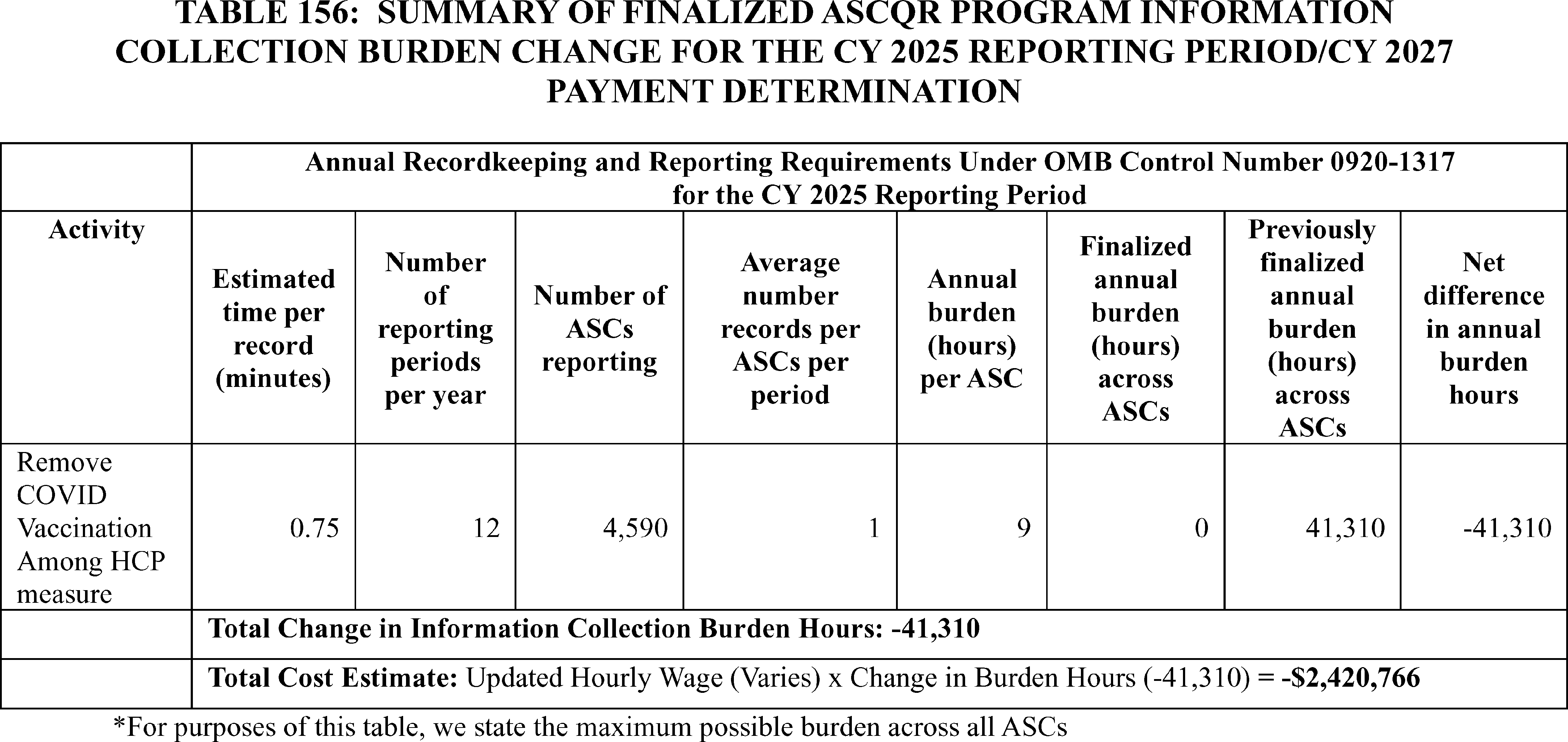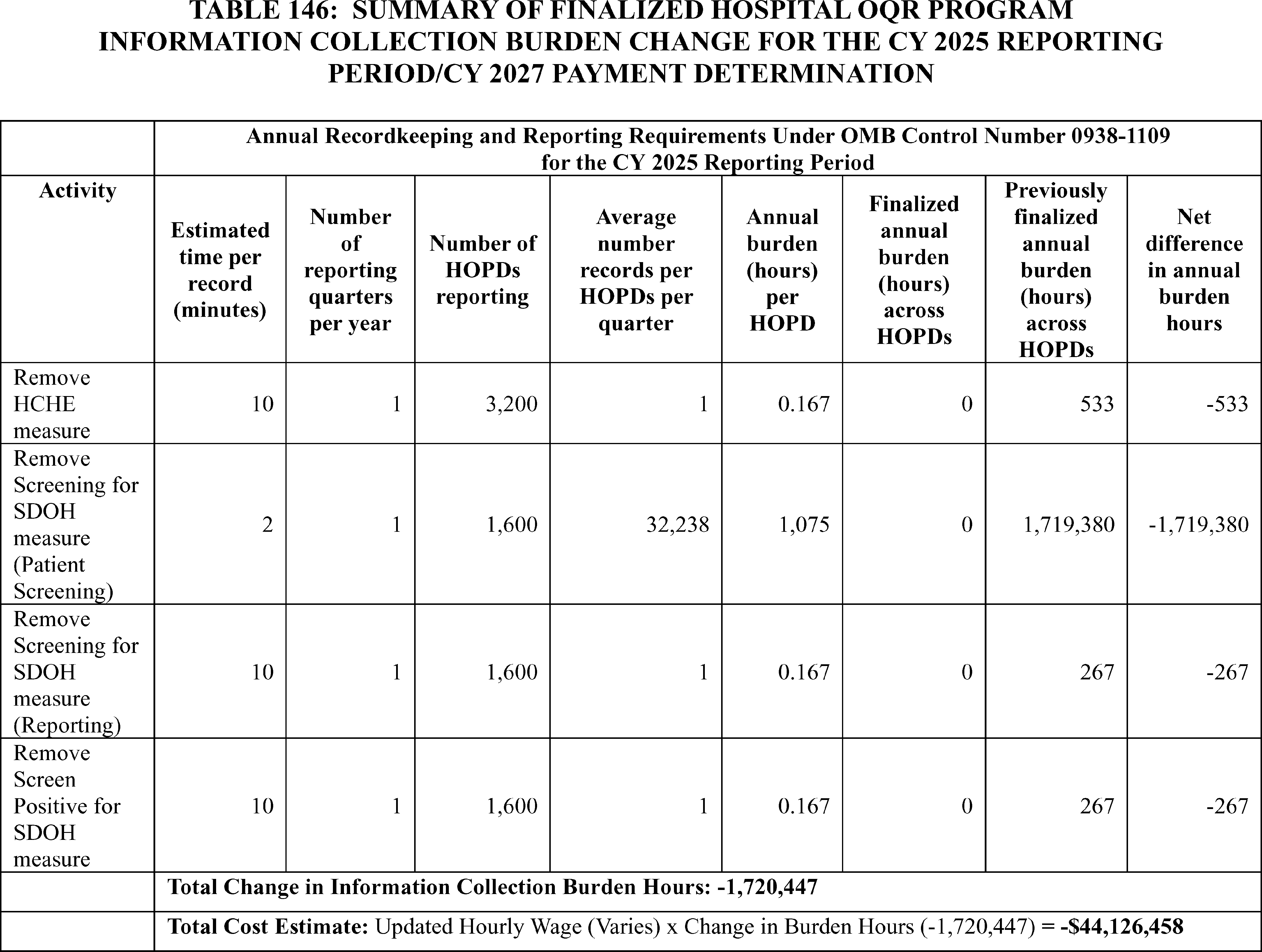 - Cross-Program Updates for the Hospital Outpatient Quality Reporting (OQR), Rural Emergency Hospital Quality Reporting (REHQR), and Ambulatory Surgical Center Quality Reporting (ASCQR) Programs: We are finalizing the removal of: (1) the COVID-19 Vaccination Coverage Among Healthcare Personnel (HCP) measure from the Hospital OQR and ASCQR Program measure sets beginning with the CY 2024 reporting period/CY 2026 payment determination; (2) the Hospital Commitment to Health Equity (HCHE) measure from the Hospital OQR and REHQR Program measure sets, and the Facility Commitment to Health Equity (FCHE) measure from the ASCQR Program measure set beginning with the CY 2025 reporting period/CY 2027 payment or program determination; and (3) the Screening for Social Drivers of Health (SDOH) measure and the Screen Positive Rate for SDOH measure from the Hospital OQR, REHQR, and ASCQR Program measure sets beginning with the CY 2025 reporting period. Additionally, we received comments regarding measure concepts related to well-being and nutrition for future consideration in the Hospital OQR, REHQR, and ASCQR Programs. We are finalizing our proposal to update and codify the Extraordinary Circumstance Exception (ECE) policy to clarify that CMS has the discretion to grant an extension in response to an ECE request for the Hospital OQR, REHQR, and ASCQR Programs.