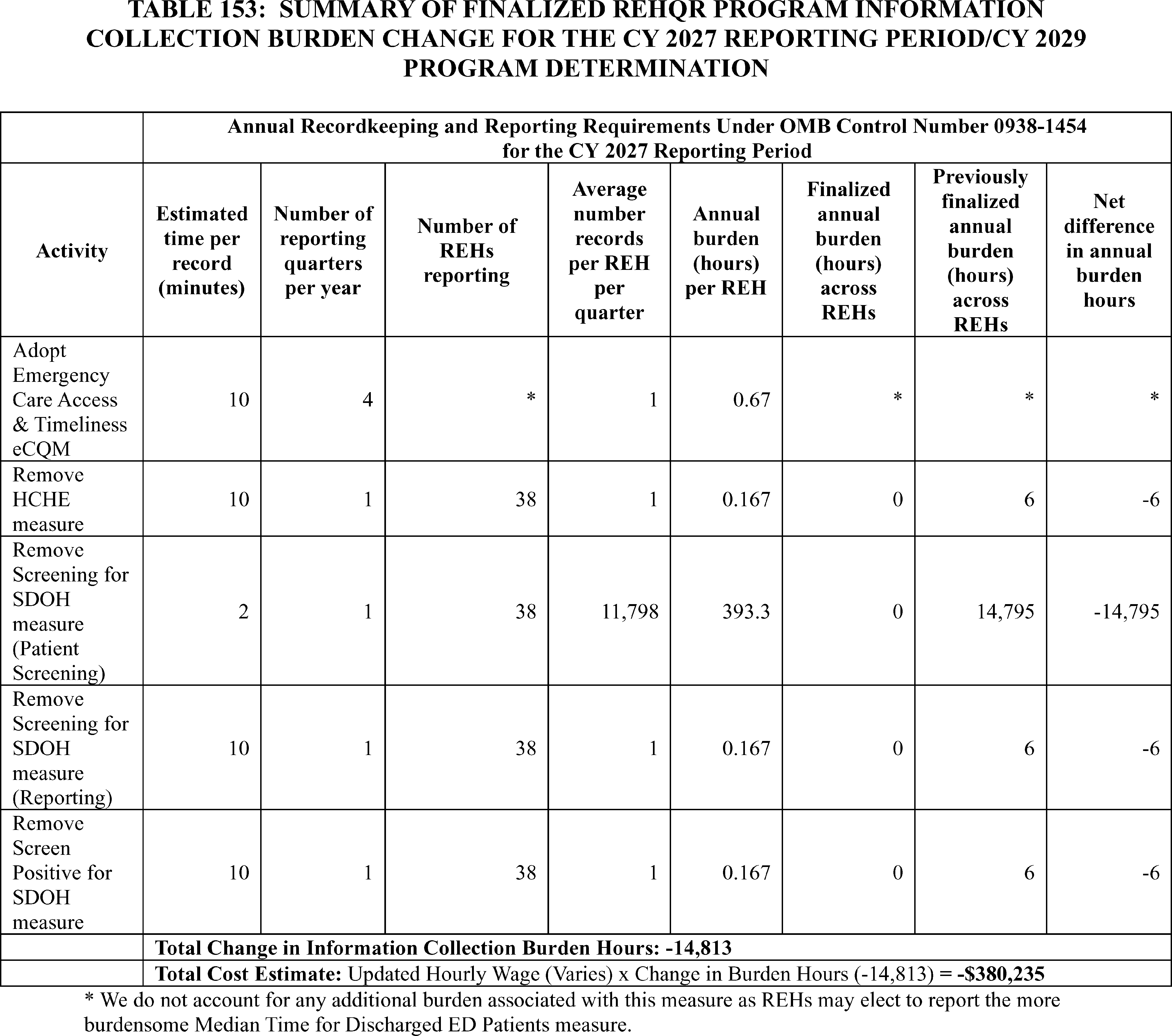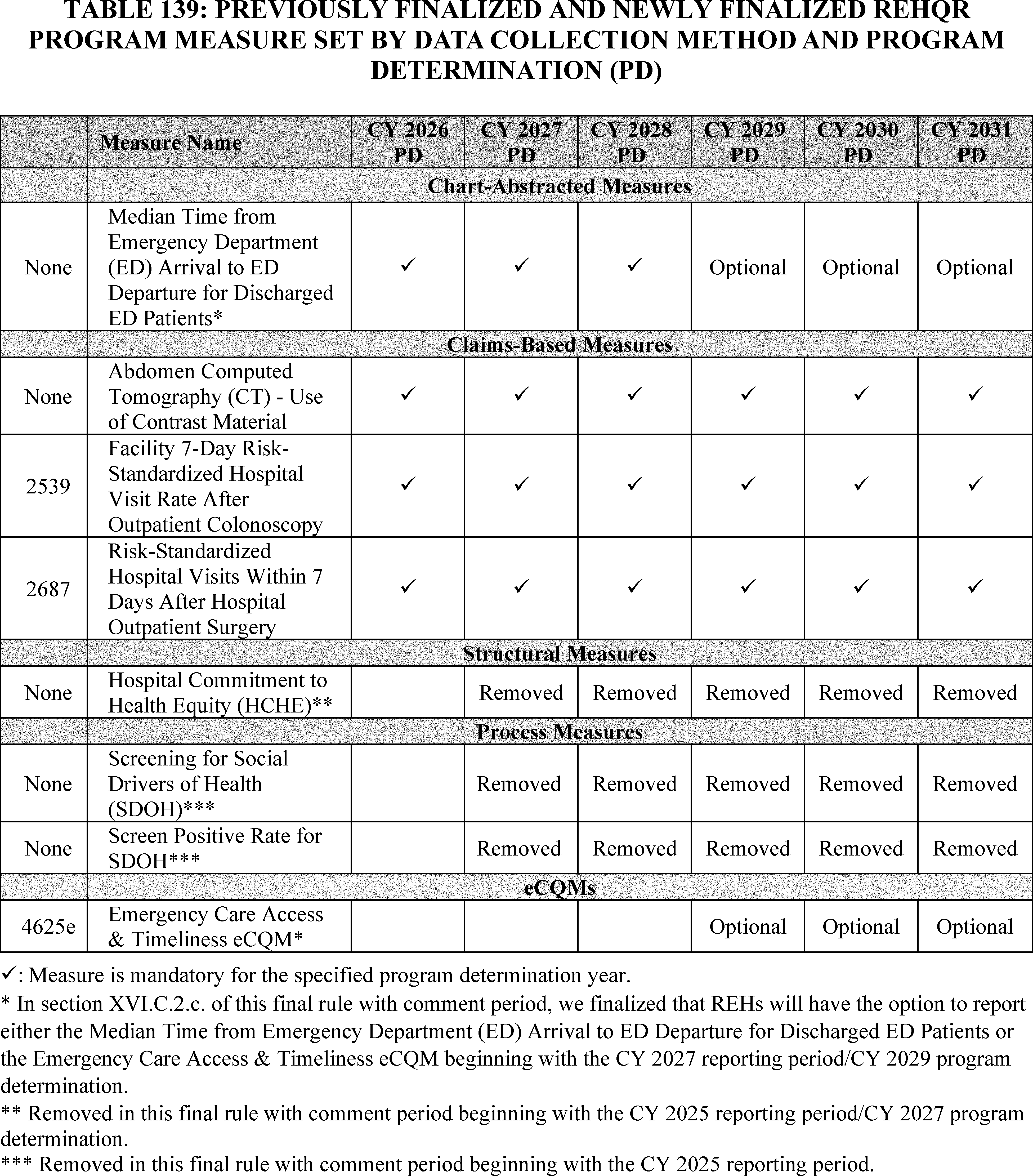 - Rural Emergency Hospital Quality Reporting (REHQR) Program: In addition to the cross-program measure and policy updates, we are finalizing the: (1) adoption of the Emergency Care Access & Timeliness eCQM beginning with the CY 2027 reporting period/CY 2029 program determination; and (2) related eCQM data submission and reporting requirements, including that REHs will be provided the option of reporting either the Emergency Care Access and Timeliness eCQM or the Median Time from Emergency Department (ED) Arrival to ED Departure for Discharged ED Patients measure beginning with the CY 2027 reporting period/CY 2029 program determination.
