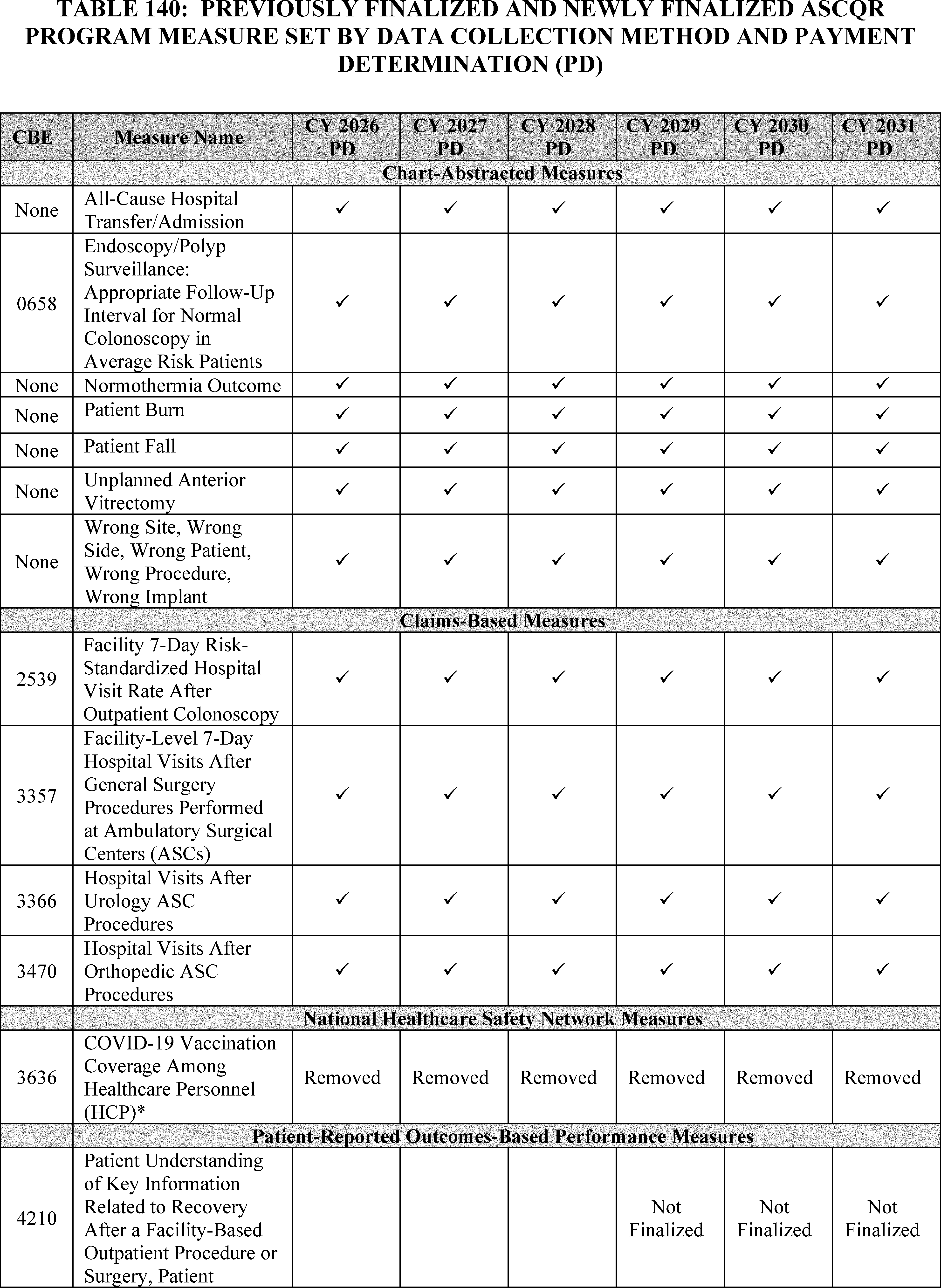 - Ambulatory Surgical Center Quality Reporting (ASCQR) Program: We are not finalizing the adoption of the Patient Understanding of Key Information Related to Recovery After a Facility-Based Outpatient Procedure or Surgery, Patient Reported Outcome-Based Performance Measure (Information Transfer PRO-PM) at this time.