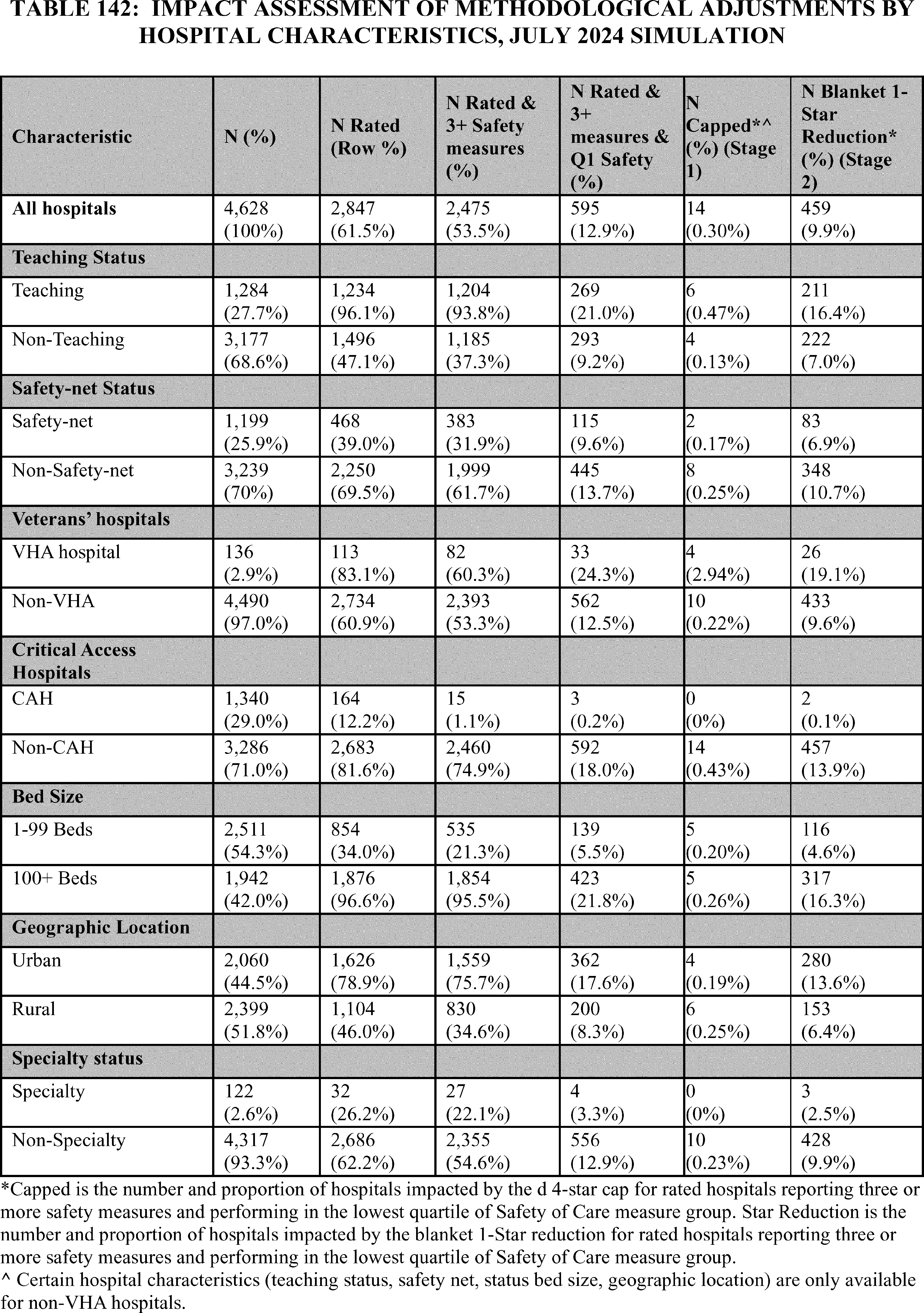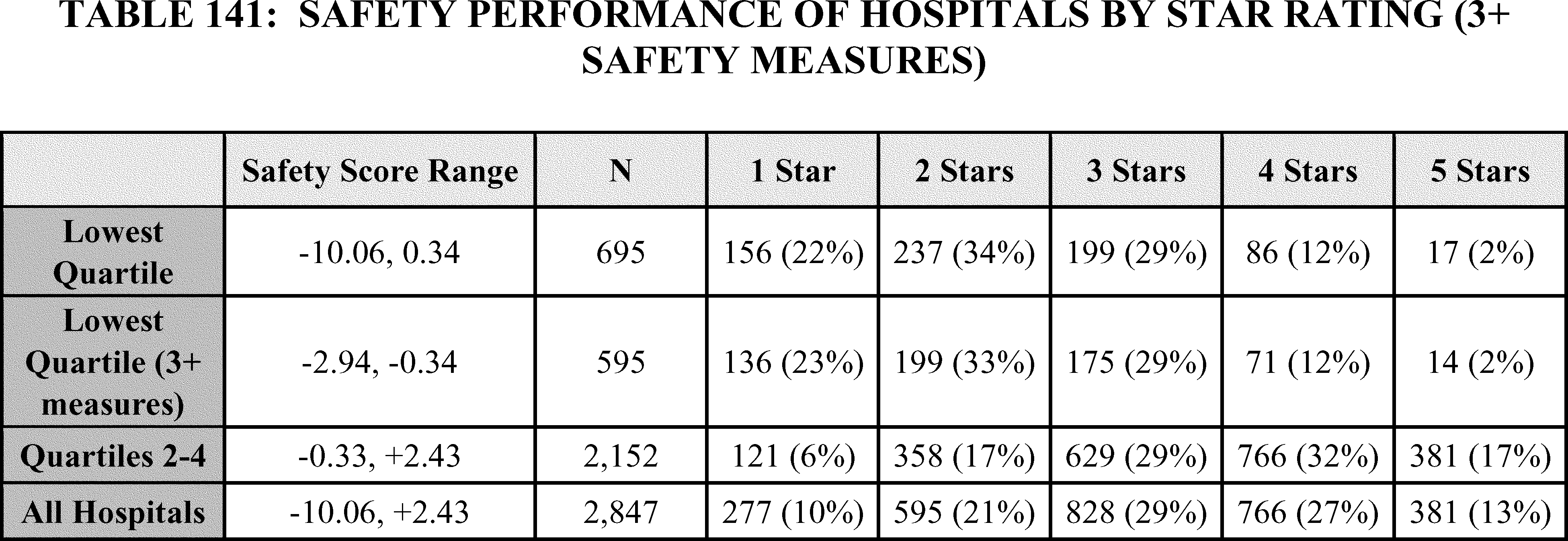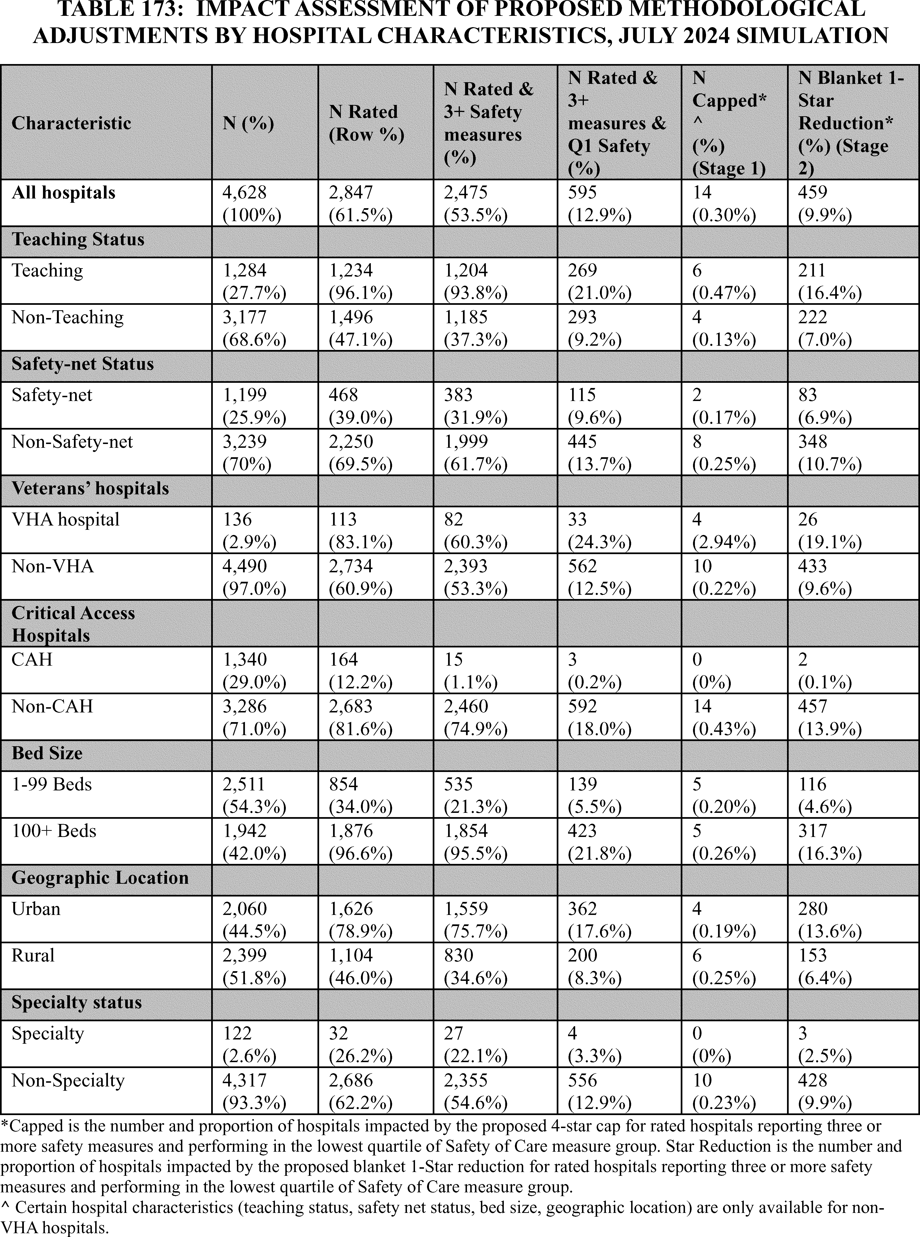 - Overall Hospital Quality Star Rating Modification to Emphasize the Safety of Care Measure Group: We proposed to update the methodology that will be used to calculate the Overall Hospital Quality Star Rating through implementation of a 2-stage methodologic update. We are finalizing our proposed updates to the methodology to emphasize the ( printed page 53451) importance of the Safety of Care measure group, particularly to address the issue of hospitals receiving a high Star Rating despite performing in the lowest quartile of the Safety of Care measure group. The first-stage methodology update is a narrow but focused transitional step that limits hospitals to a maximum of four out of five stars (based on at least three Safety of Care measure scores) if they performed in the lowest quartile of the Safety of Care measure group in the 2026 Overall Hospital Quality Star Rating. The second stage of the methodology update replaces the first stage update and reduces the Star Rating of any hospital in the lowest quartile of Safety of Care (based on at least three Safety of Care measure scores) by one star, to a minimum 1-star rating for the 2027 Overall Hospital Quality Star Rating and later years. These changes will prioritize safety for both patients and healthcare workers and reflect CMS' fundamental commitment to ensuring high-quality, safe care as a central component of health system performance.