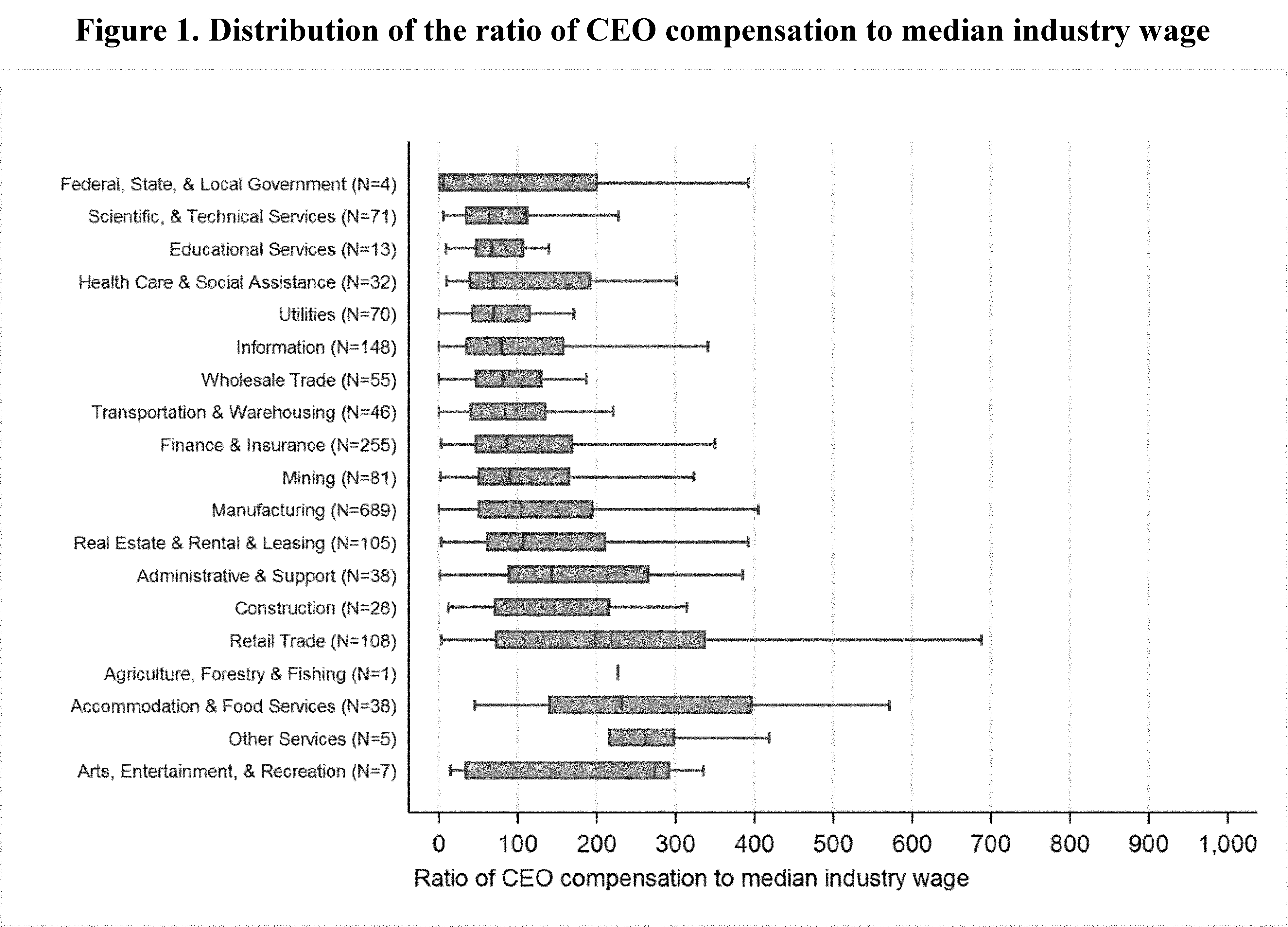 Back to Citation674. Our analysis excludes the Motor Vehicle Manufacturing and Postal Service industries from our sample because, for these industries, mean wage was lower than median wage in dollar terms, appearing to contradict our lognormal distributional assumption.