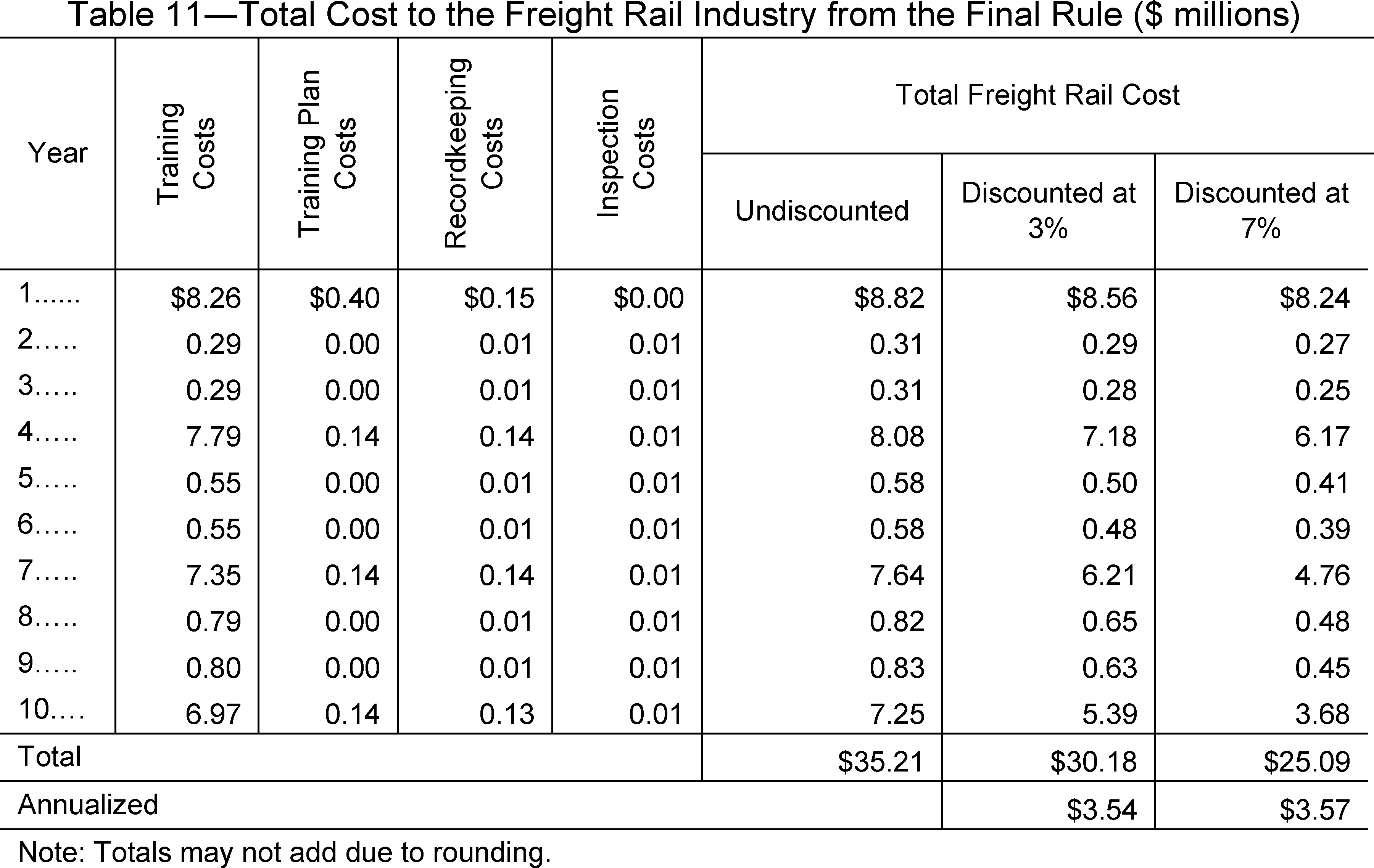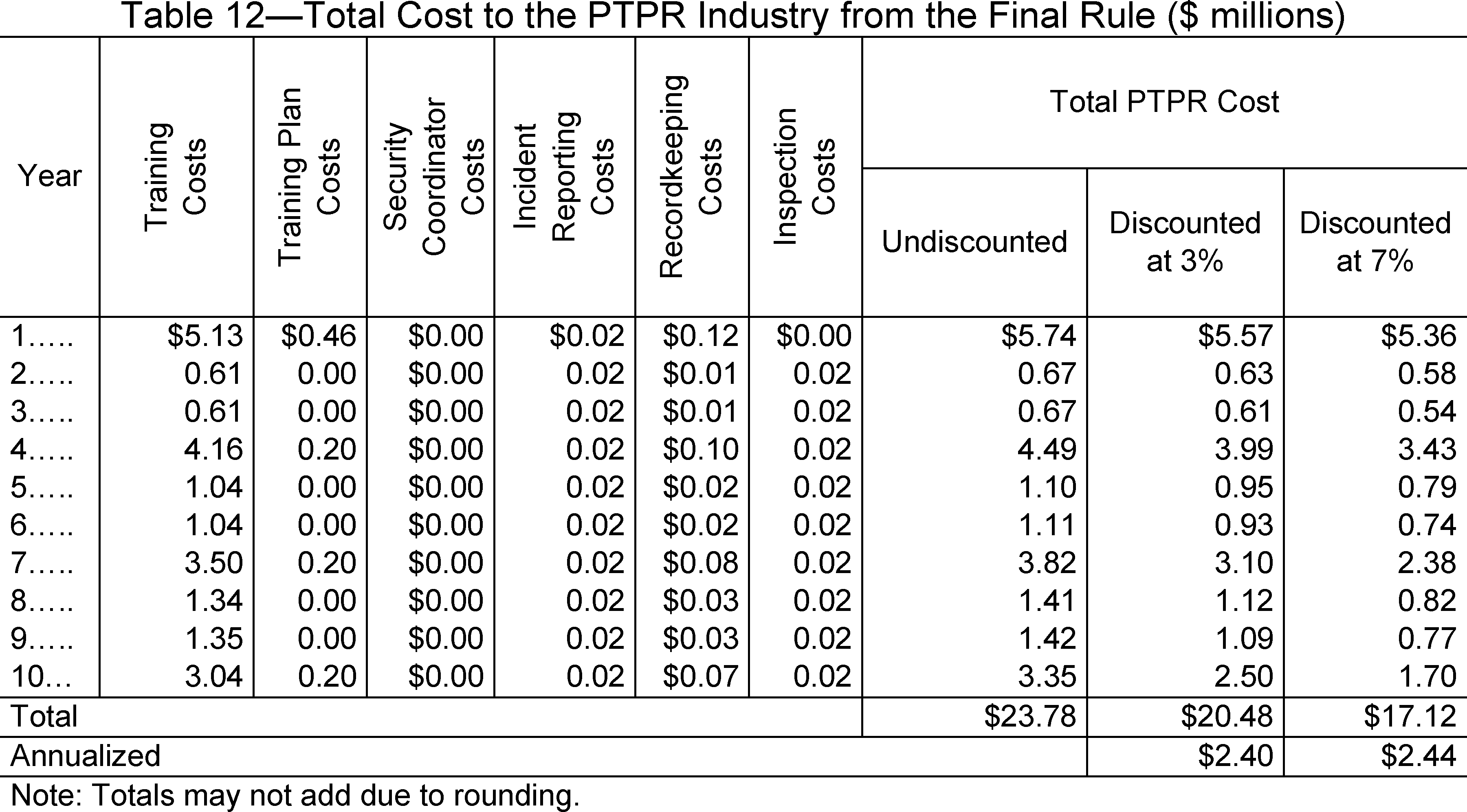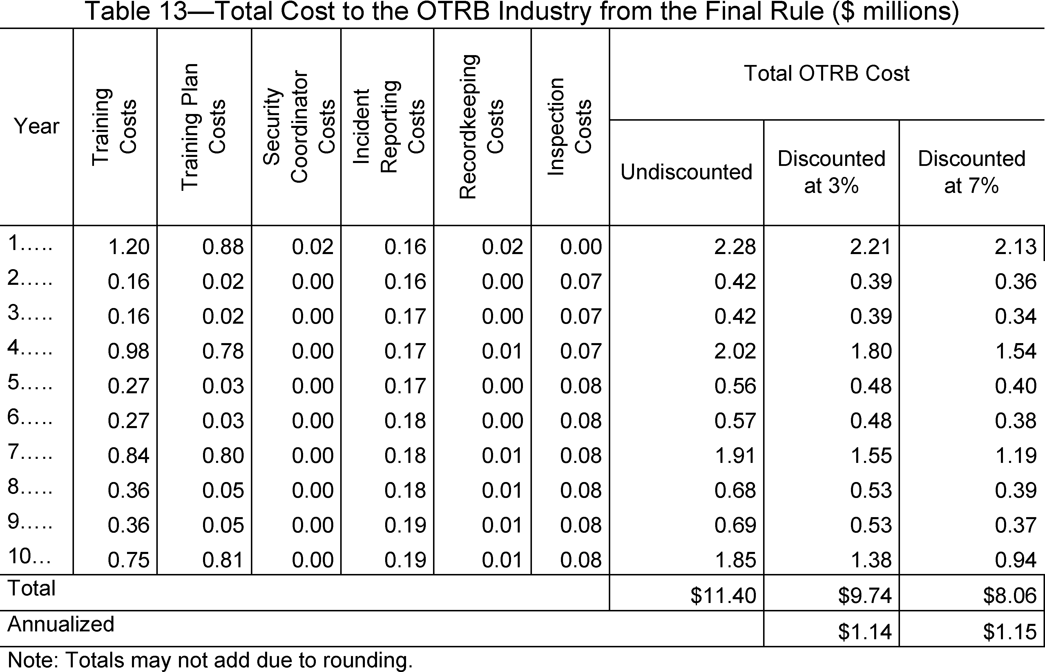 Back to Citation135. As previously noted, see section VII.C.4. of the preamble to this final rule, TSA proposed an annual recurrent training requirement in the NPRM. See also 81 FR at 91348. For the NPRM, TSA also considered an alternative to “train security-sensitive employees once every three years using TSA-provided materials. Id. at 91379. In response to comments, TSA is adopting a three-year recurrent training cycle for purposes of the final rule, making the annual recurrent training requirement the alternative considered for purposes of the alternatives analysis.