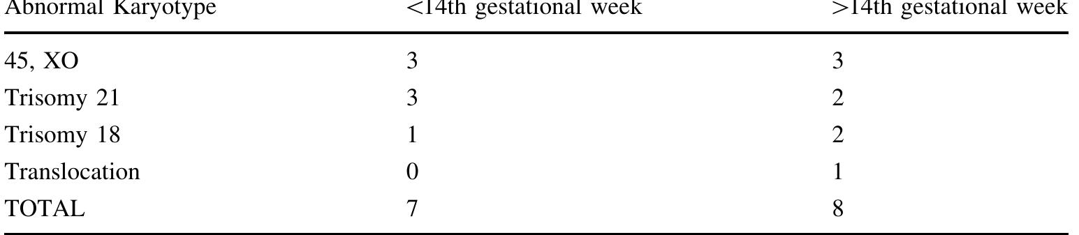 Purpose Cystic hygroma (CH) is a fetal sonographic finding with an incidence of 1%. Chromosomal a... more Purpose Cystic hygroma (CH) is a fetal sonographic finding with an incidence of 1%. Chromosomal abnormalities and structural malformations are commonly related with CH. We aimed to describe our experience and determine the association between diagnosis of CH and adverse pregnancy outcome. Methods We retrospectively reviewed data of prenatal CH diagnoses over a ten-year period. Cases were evaluated for maternal age, gestational week at CH diagnosis, invasive procedure, karyotype result, associated abnormality and perinatal outcome. We categorized cases into two groups to understand the impact of maternal age on perinatal outcomes, and the cutoff was 35 years old. Results Totally 28 individuals were enrolled in the study. The median maternal age at birth was 27.5 years old, and 7 patients were over 35 years old. Karyotype results were available for all individuals, and 15 had an abnormal chromosome (53.5%). Five fetuses had structural abnormalities, and they were all observed within patients under 35 years old. Healthy fetuses (without any problem at antenatal screening and birth) were found to be only 14.3% in advanced maternal age (AMA) group and 33.3% in young mothers. Conclusions Women with AMA and CH had a higher risk of having a baby with a chromosomal abnormality, as compared with younger women.