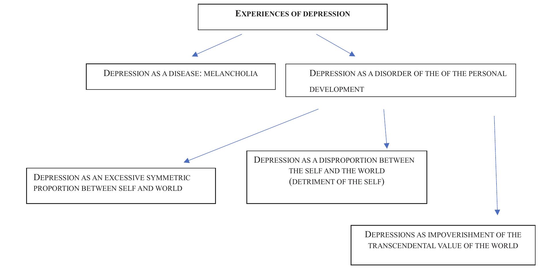 This article aims to offer clinical descriptions and philosophical interpretations of the ontolog... more This article aims to offer clinical descriptions and philosophical interpretations of the ontological nature of depressive experiences trying to address issues related to the contemporary diagnostic paradigm and valuesbased practices which shape clinical decisions. At the core of this contribution there is the idea that the variety of depressive experiences might be understood acknowledging the qualitative difference in the ontology underlying each form of depression. We argue that there is a fundamental difference between melancholia as a disease and those melancholic traits which characterizes human existence as such: while the former indicates a qualitative alteration of the global human experience, constituting psychopathological experience, the latter describes a style of disproportion of existence not pathological per se at all. Moreover, we defend the hypothesis that melancholia (in a medical sense) is a distinct unity of mental alteration, and should not be conflated with the multivarious kind of experiences merged under the name of depression, the variety of which may be understood as disorders of the personal development. It is in this context that the leading element of anthropological disproportions impact the role of pre-reflective and transcendental structures, polarizing the self and the world in a three-way topography: 1. depression as an excessive symmetric proportion between self and world; 2. depression as a disproportion between the self and the world (detriment of the self); 3. depressions as impoverishment of the transcendental value of the world.