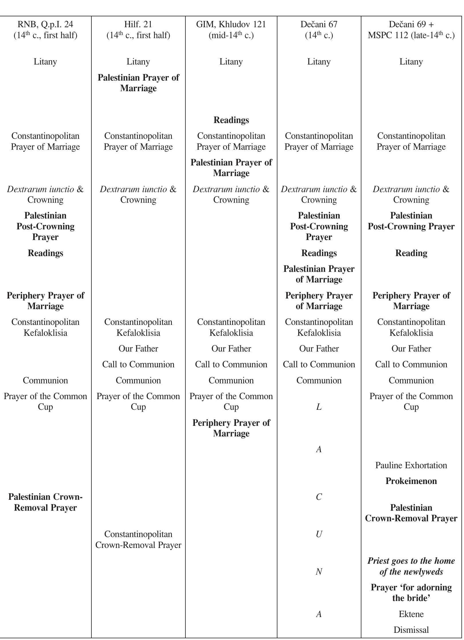 redactions of the Constantinopolitan nuptial rites of Engagement and Marriage. In addition to copying the marriage practices of the tradition of the Byzantine capital, the euchology also includes local marriage rites celebrated at the nuptial bedchamber. These nuptial-chamber blessings have been overlooked or misinterpreted by Byzantine liturgiologists. This article dispels the misunderstandings surrounding these prayers, places them in their historical context, and shows how these prayers from the Byzantine periphery came to influence the development of the Byzantine Rite of Marriage as we know it today."
