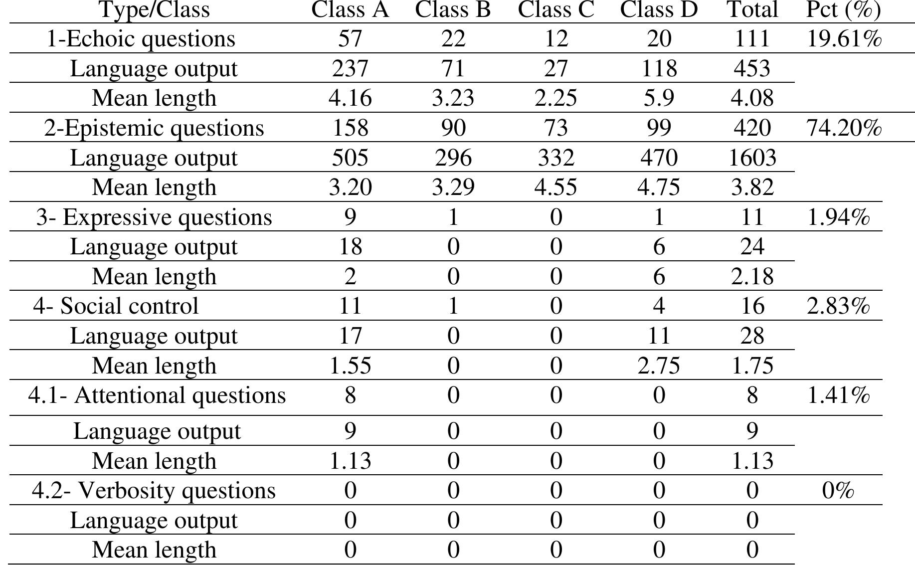 This research explores the functions of questions used by EFL teachers and the impact they have o... more This research explores the functions of questions used by EFL teachers and the impact they have on students’ oral production. The main aim is to examine the distribution of questioning techniques and the length of language output elicited by each category. The study will fill the research gap, in the local context, regarding the effects of functional questions on the length of students’ responses. The following main question is sought to be answered: What is the epistemic category of questions that can prompt students to produce more extended language output in EFL? The study involves descriptive correlational research that makes use of a quantitative method for answering the research questions. It implements Long and Sato’s (1984) taxonomy (based on Kearsley, 1976) for the categorization of functional questions. The database of this study included 566 questions, of which 420 were epistemic and 111 were echoic in function. The data collection procedure took place at the departments ...