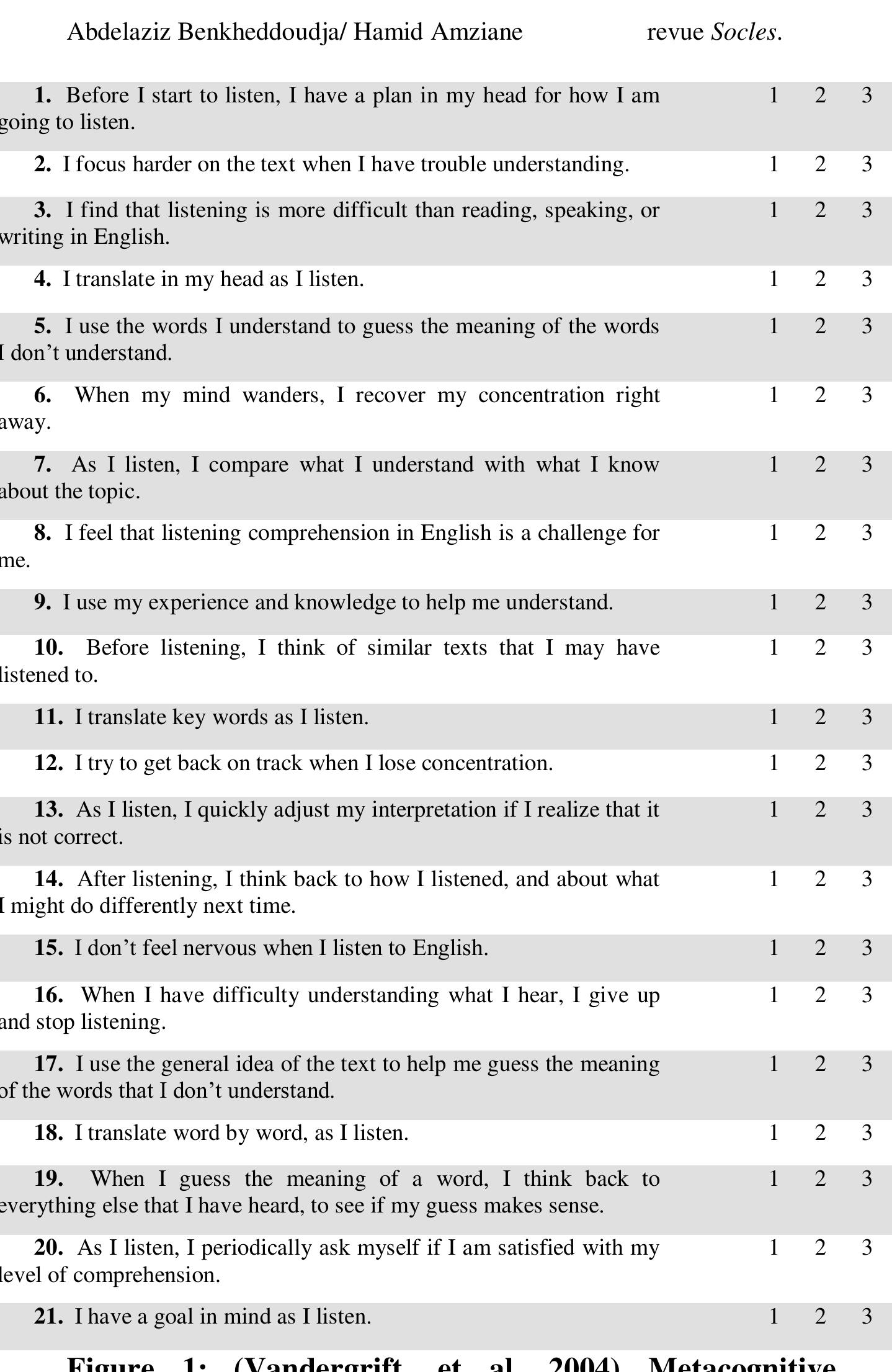 Listening is an active and complex process that plays a significant role in foreign language lear... more Listening is an active and complex process that plays a significant role in foreign language learning. Strategy training has been shown to have a major effect on diverse aspects of English as a foreign language. This paper reports on an investigation of the listening strategy training, particularly metacognitive strategy training among 50 Algerian Pre-service Teachers who learn English as a foreign language and its impact on their listening comprehension performance and their metacognitive strategies awareness. Results of this quasiexperimental study revealed significant improvement in the listening comprehension ability and considerable increase in the metacognitive awareness of the experimental group in comparison to the control group.