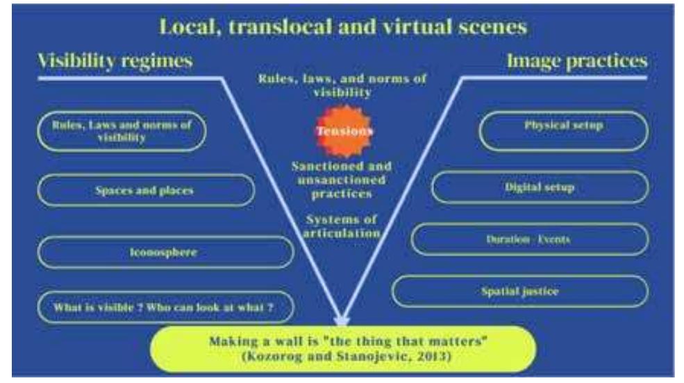 identify key actors, to describe the physical and digital visual practices, and to reveal the different systems of articulation implied in the visibility of Arabic calligraffiti. My results include a summary and discussion of the visibility of Arabic calligraffiti, the modulation of practices and the characteristics of its visual mise en scène. The scholarly contribution of this thesis is both theoretical and ethnographic. My analytical framework allows us to better understand the political implications of Arabic calligraffiti. My ethnographic study broadens and clarifies this framework, introducing new methods of visual analysis. My objective is to conceptually and ethnographically explore the ambiguity created both by the effervescence of local, translocal and digital visual scenes and by the visibility of Arab-Western tensions.
