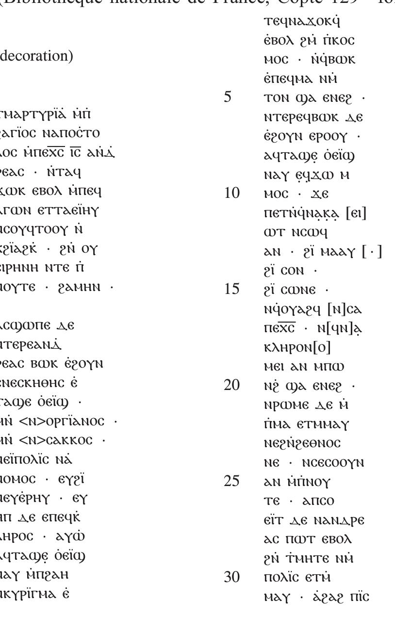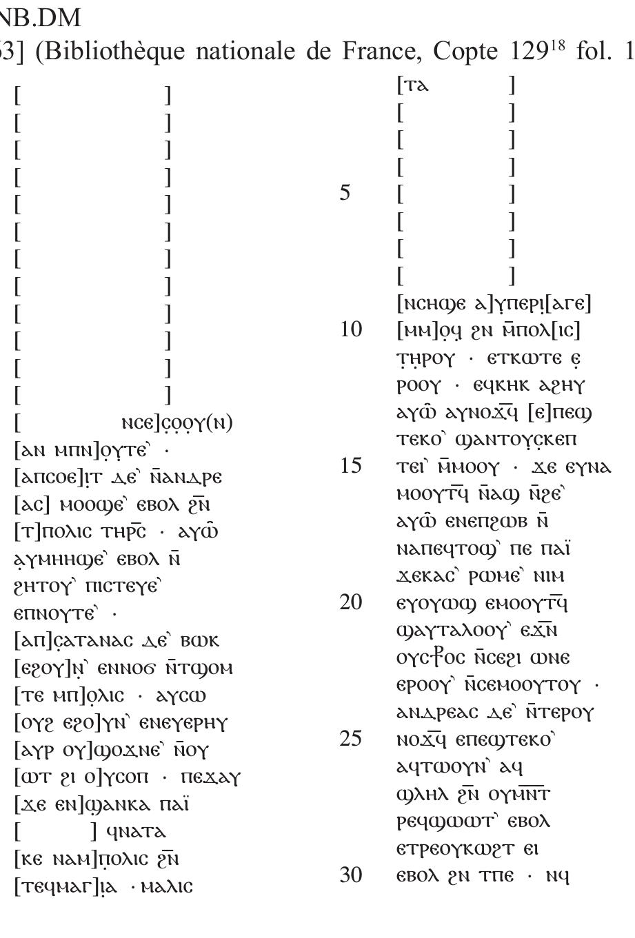 This article provides the editio princeps of the two parchment leaves housed at the Bibliothèque ... more This article provides the editio princeps of the two parchment leaves housed at the Bibliothèque nationale de France in Paris - viz., Copte 129.18 fol. 88 and Copte 129.18 fol. 160 - which belong respectively to White Monastery codices MONB.GQ and MONB.DM. The leaves together witness the Coptic Martyrdom of Andrew (CANT 235), an Egyptian text that has little to do with the better-known Greek martyrdom of the apostle (CANT 225). In the introduction, the author discusses the sources and date of the text, as well as the connection of Andrew with the motif of fire. The author argues that the text was composed for liturgical purposes and that the shorter version of the Coptic Martyrdom of Andrew (represented by the two Coptic witnesses) is original, while the longer one (attested in Arabic and Ethiopic) is the result of a later redaction. The introduction is followed by a diplomatic edition of the Coptic fragments and an English translation.