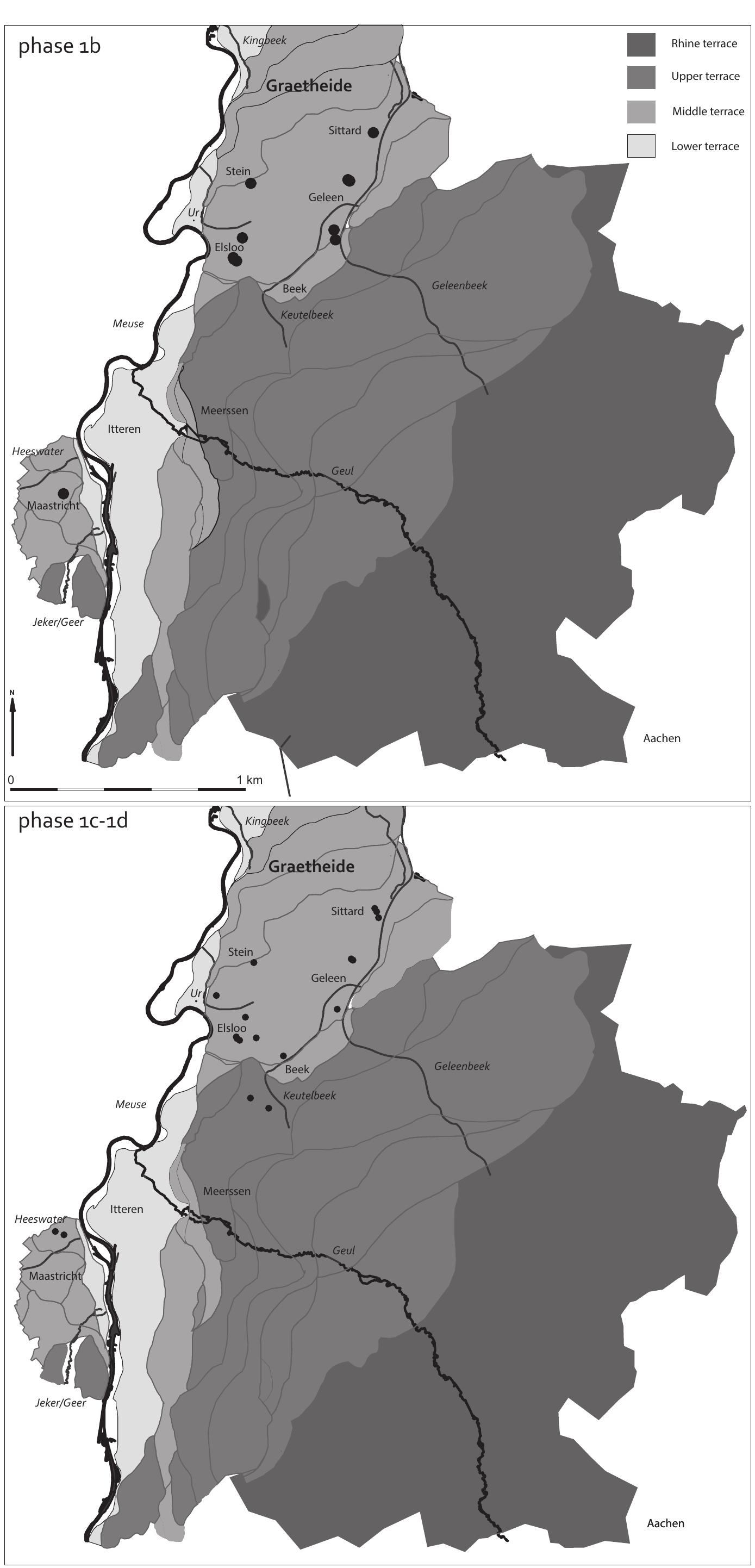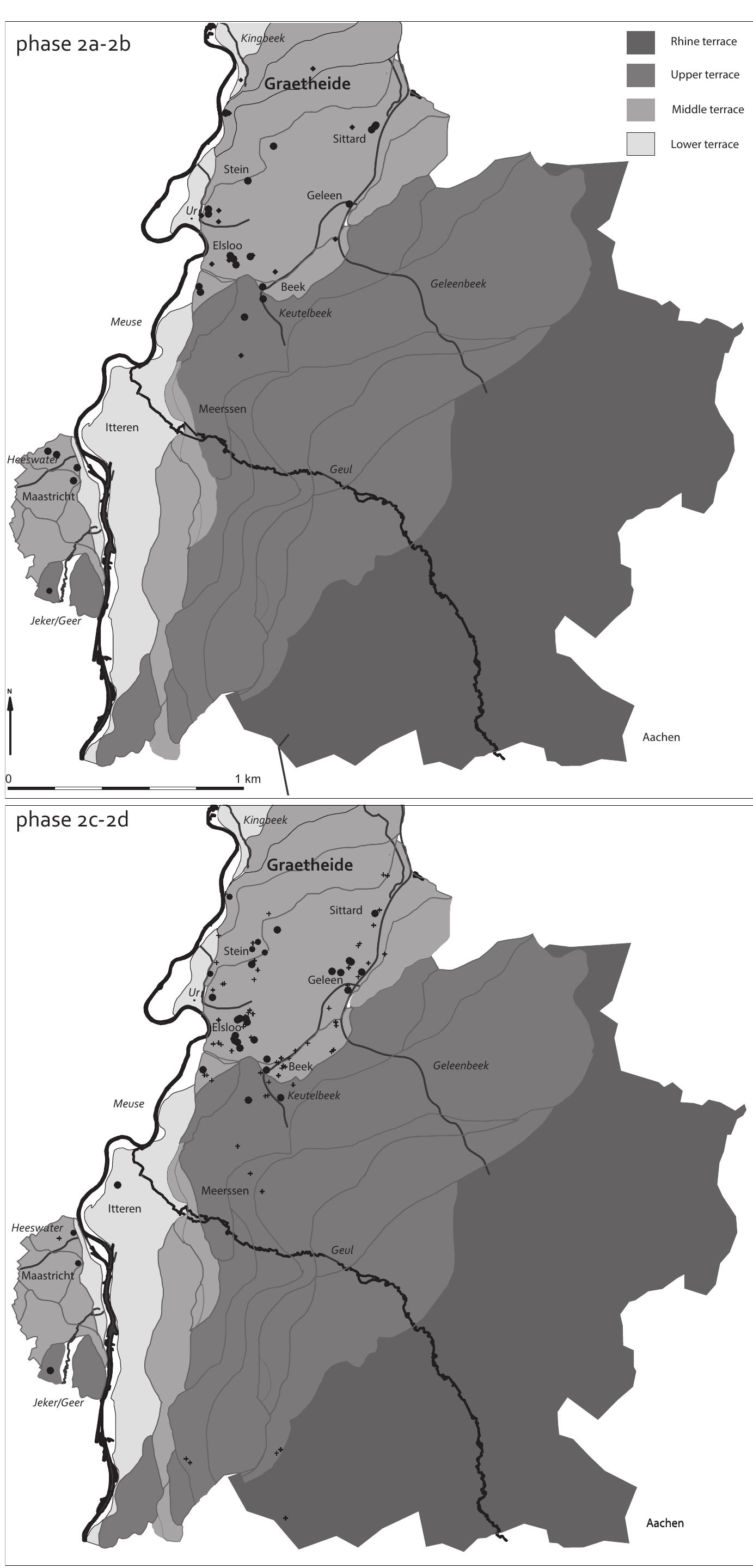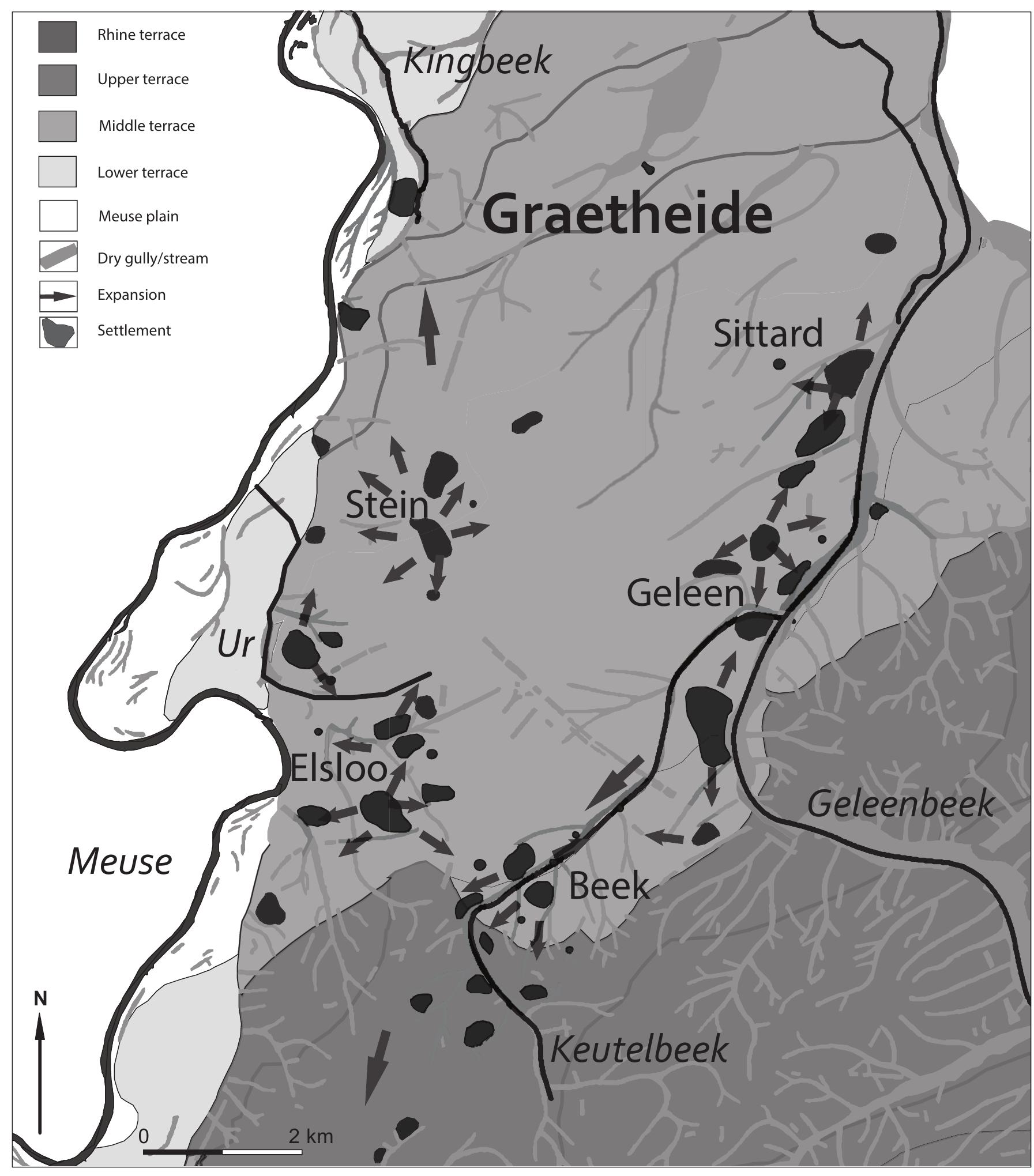 Research in this region, the Graetheide cluster, has long been characterized by excavations of Elsloo, Geleen and Sittard. Apart from these well known settlements, more sites on both sides of the river Meuse have been excavated over the past century. They show, that in this differentiated landscape other locations than originally presumed have been selected, tested and used for settlement. This observation leads to different kinds of questions: How could they cultivate locations on the Lower or High Meuse Terrace, without the need for digging deep wells or fear of floods? What are their motivations for exploring new locations? Does a different site location also imply that they abandoned their traditional approach to settlement patterning and structure? Chronology of these sites is therefore a key factor.