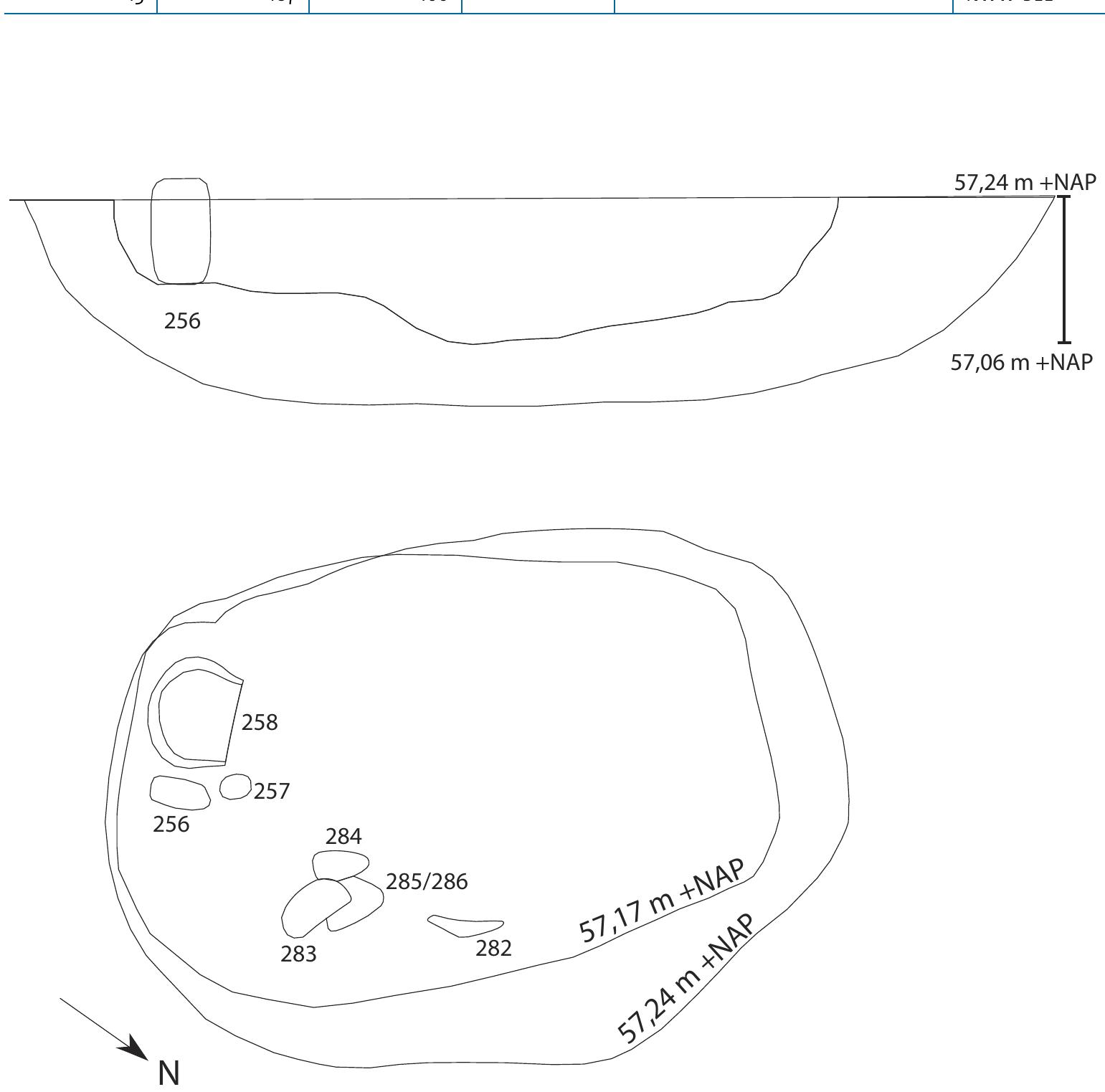 meet in totaal ongeveer 6 bij 6 m, waaraan nog een 2 m lange, smalle en ondiepe uitloop (mogelijk een erosiegeultje) verbonden is, en bestaat uit een buitenkuil die relatief snel na het uitgraven is dichtgegooid. Na opvulling van de buitenkuil zijn waarschijnlijk twee, mogelijk drie plekken opengebleven, hoewel die ook naderhand uitgegraven zouden kunnen zijn. De grootste van deze die lepelvormig is, meet ca. 3,3 x 1,8 m en vertoont met name in de onderste regionen een redelijk houtskoolrijke vulling. Ca. 5-10 cm boven de bodem van de kuil, die een iets aopende bodem vertoont, bevindt zich een schervenpakket dat in een rechthoekige concentratie lijkt te liggen. Het aardewerk is niet als complete potten maar als scherven op de grond terecht gekomen. Tussen en direct boven het aardewerk werd ook het grootste deel van het houtskool verzameld welke ter datering zijn aangeboden. De dateringen vallen in de tweede helft van de Steingroep. De functie van de kuilen blijft helaas onduidelijk.