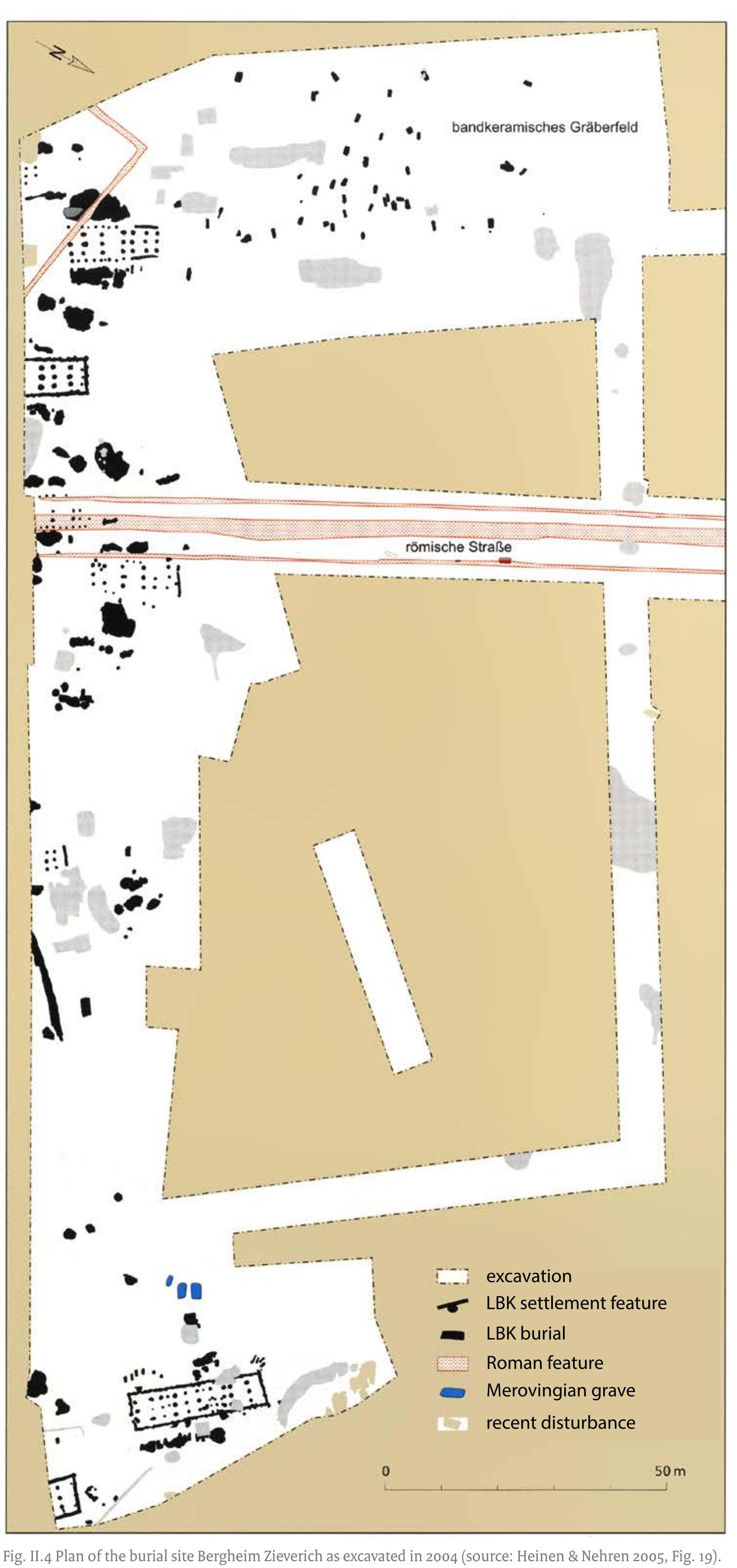 In total 3.5 ha were excavated, revealing the outlines of a small Bandkeramik village, encompassing at least 29 house yards. Based on the pottery chronology it is thought