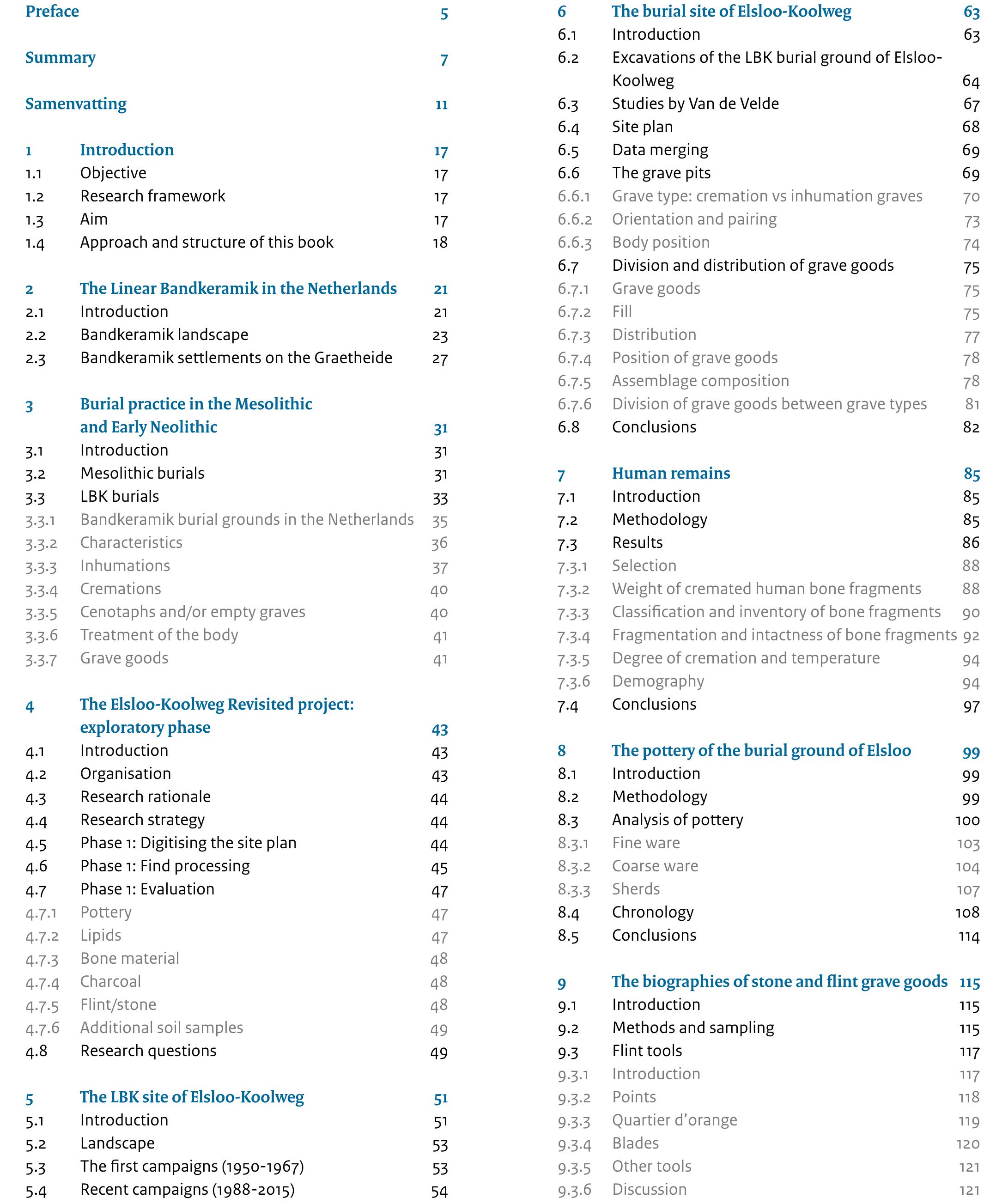 In deze publicatie wordt de rijke onderzoeksgeschiedenis besproken en verslag gedaan van de opgravingen van veertien bandkeramische vindplaatsen in de Graetheideregio alsmede het gebied ten noorden van Maastricht. De (her)analyses van de geselecteerde onderzoeken worden per vindplaats gepresenteerd en in een synthetiserend kader geplaatst. De aandacht gaat daarbij uit naar: nederzettingsstructuur en landschappelijke inkadering (Van Wijk & Amkreutz), de chronologie van het bandkeramisch aardewerk (Van de Velde), het vuursteengebruik en de -herkomst (De Grooth), de stenen werktuigen (Verbaas), het non-bandkeramisch aardewerk (Brounen), het gebruik van oker (Wijnen), en de bandkeramische cultuurgewassen (Bakels).