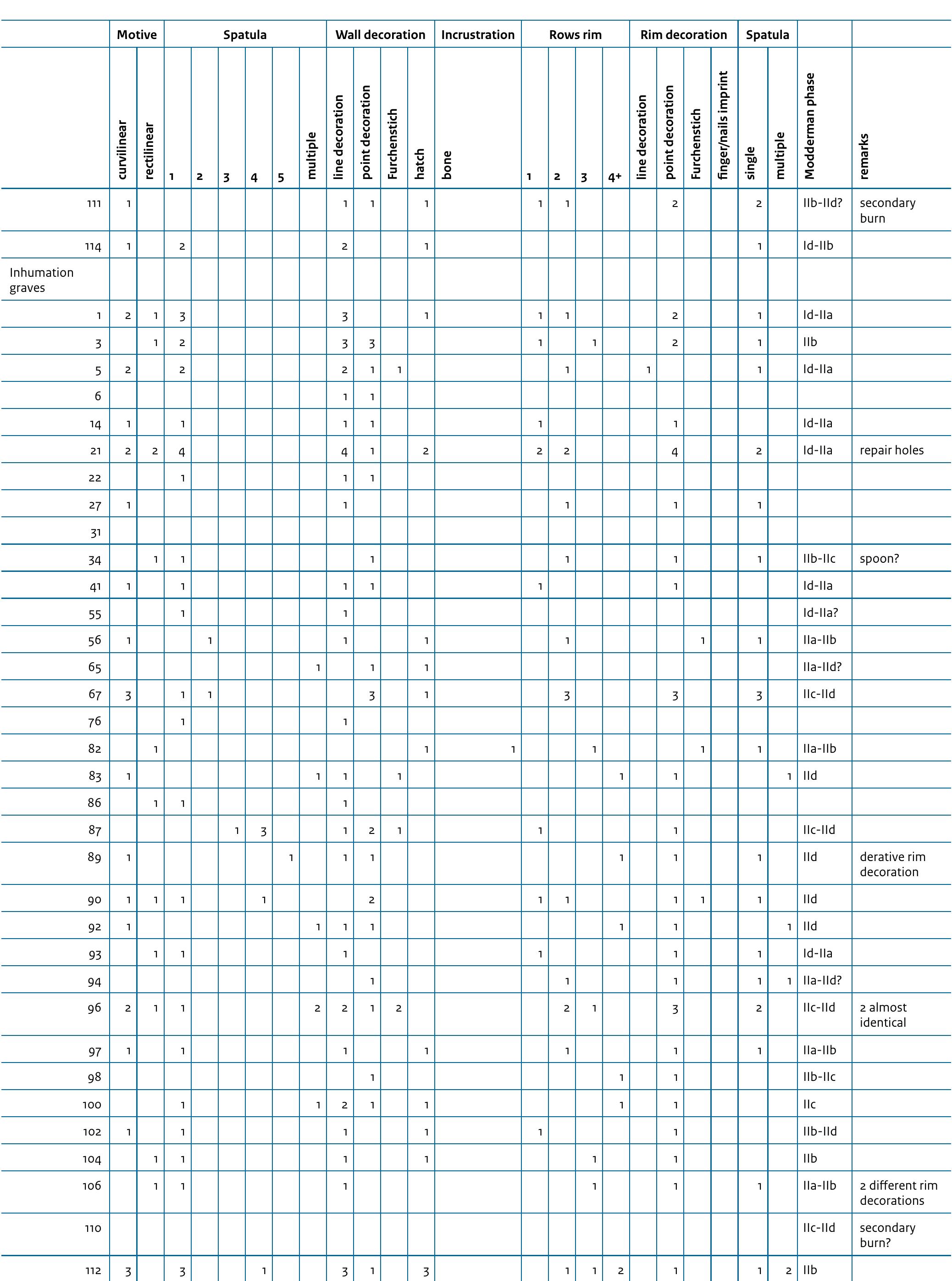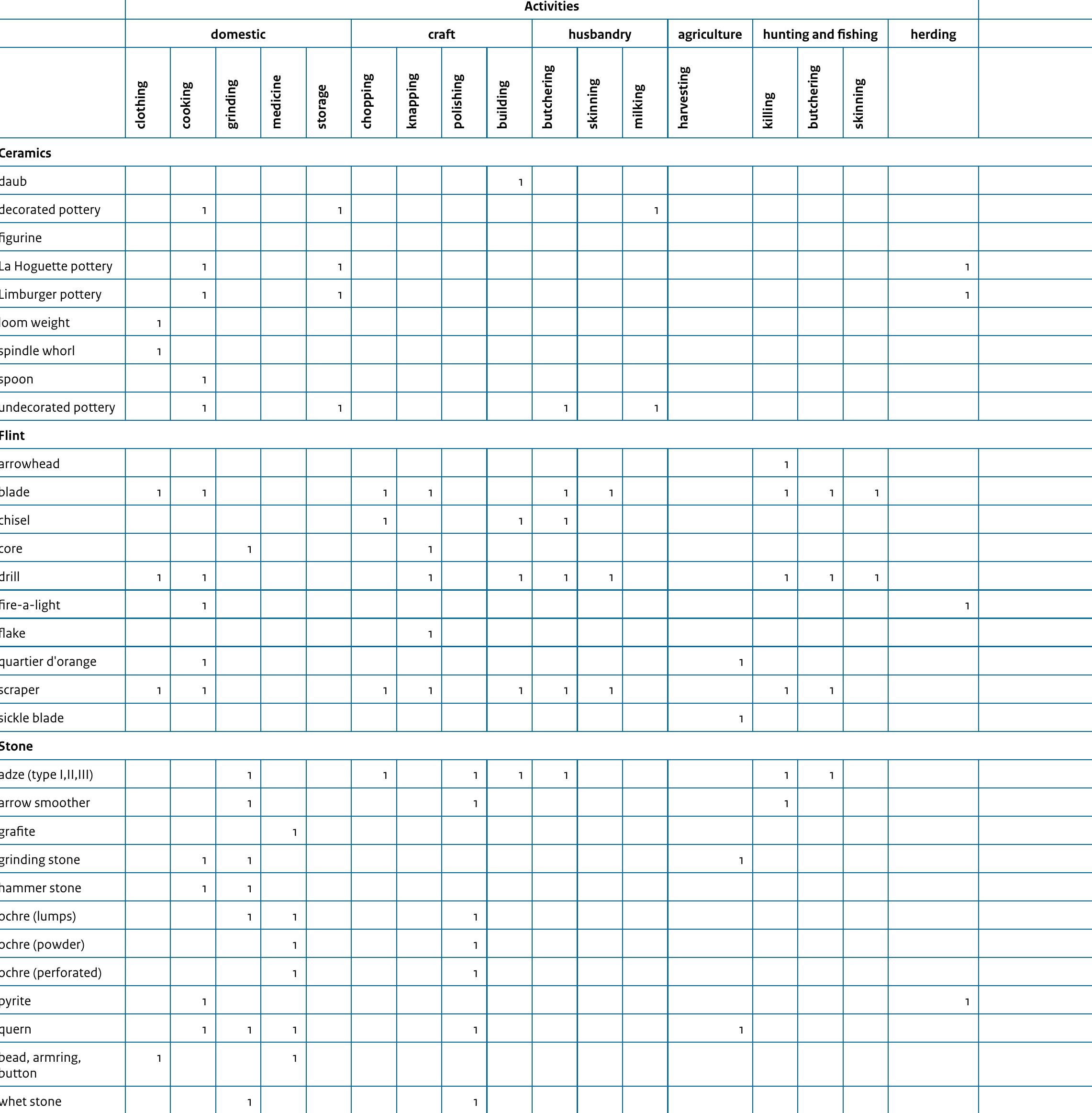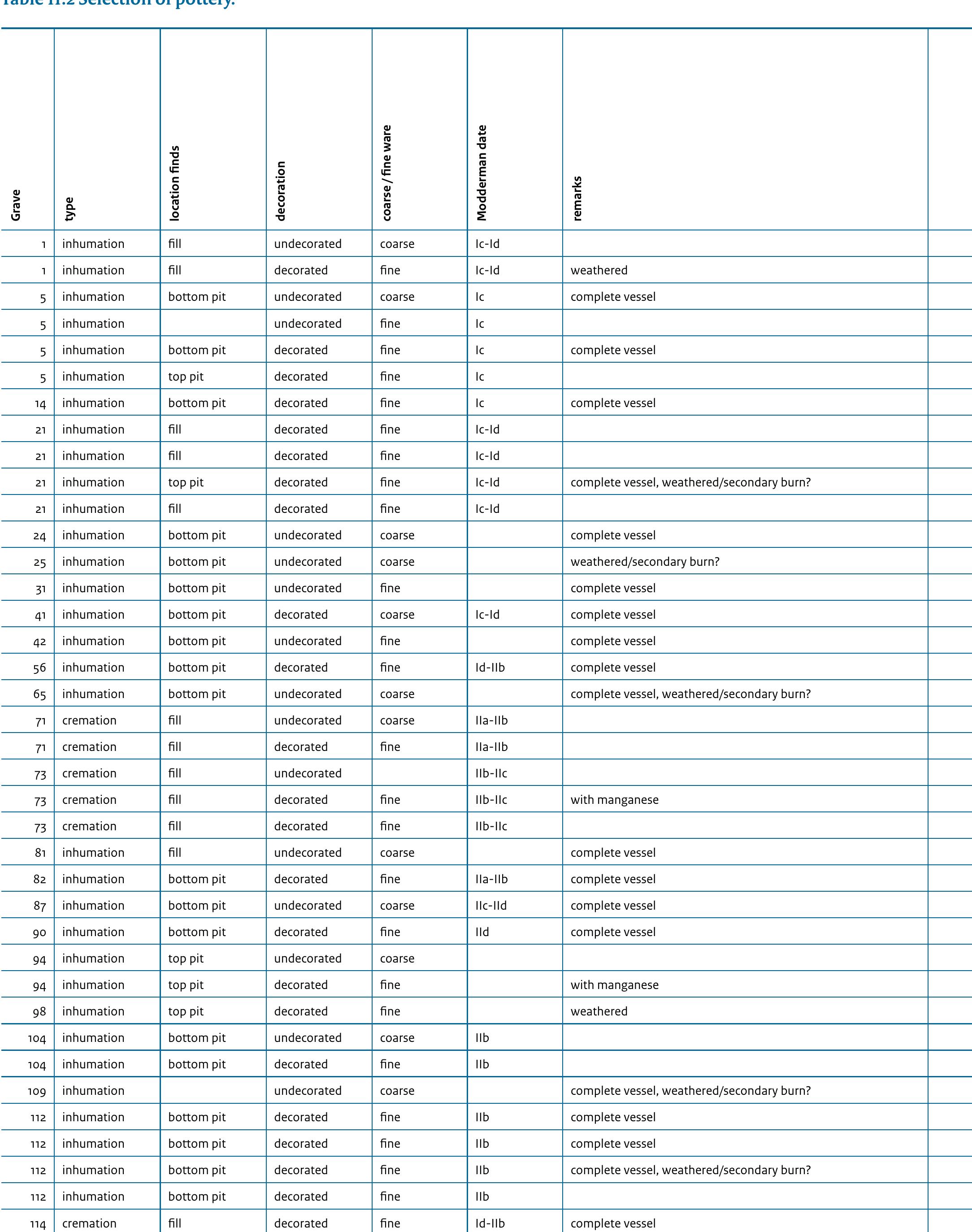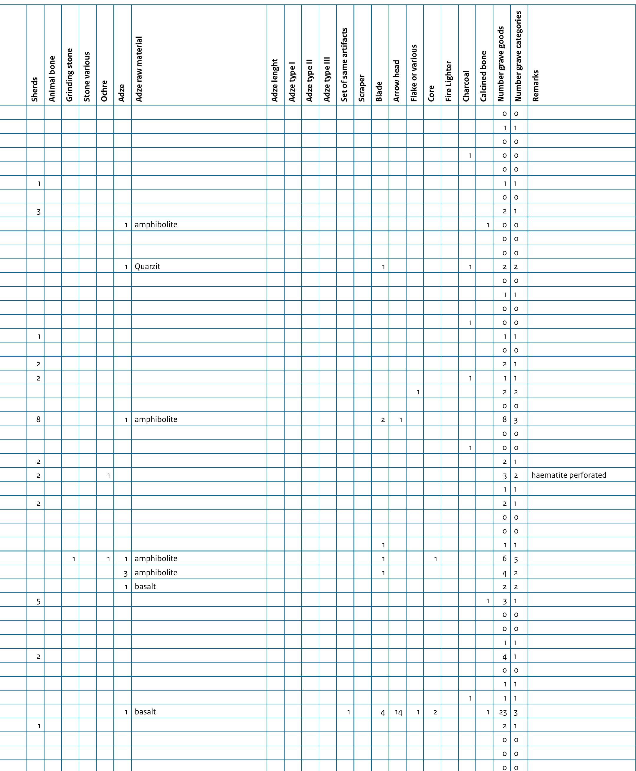 two prominent features that distinguish this site from other known settlements in the Netherlands and the Graetheide settlement cluster. There seems to be little difference in material culture compared to other sites. Pottery, flint and stone tools typically conform to regional LBK standards. What