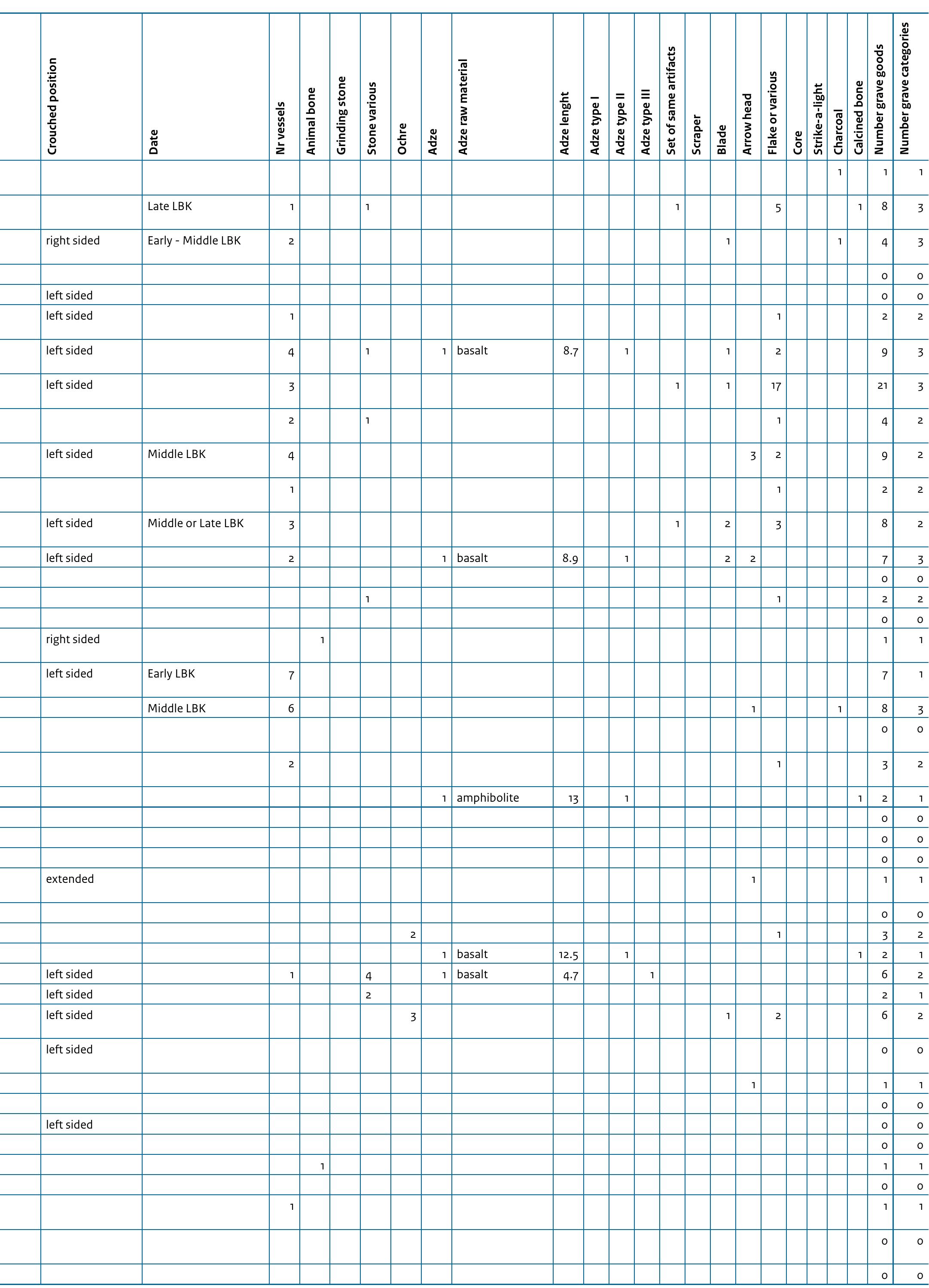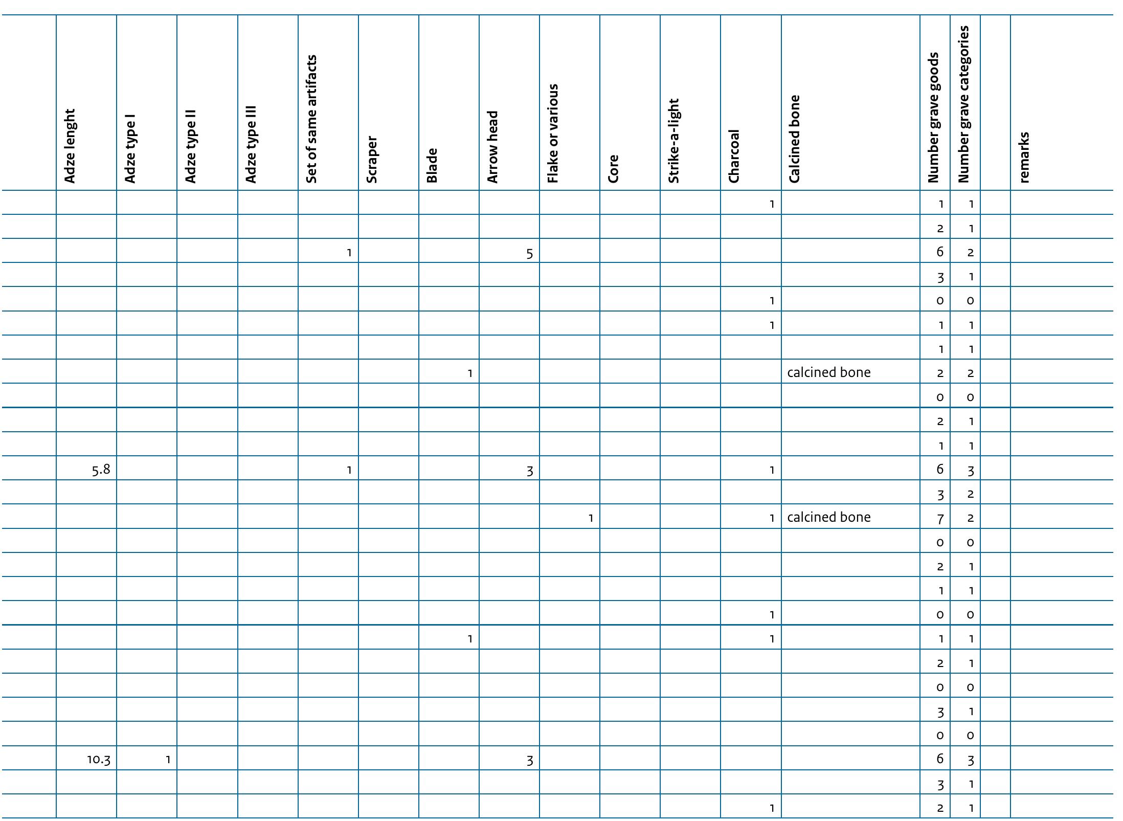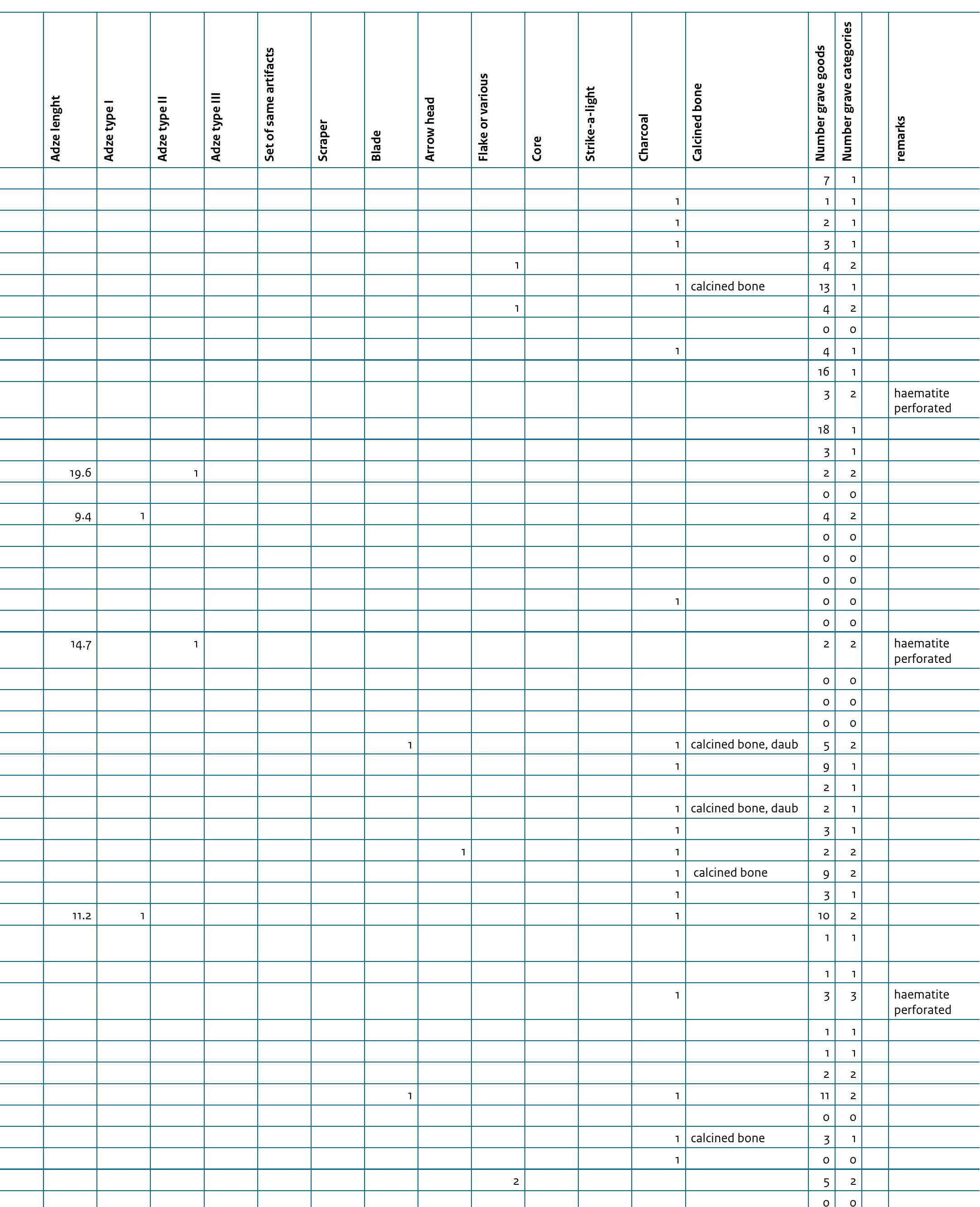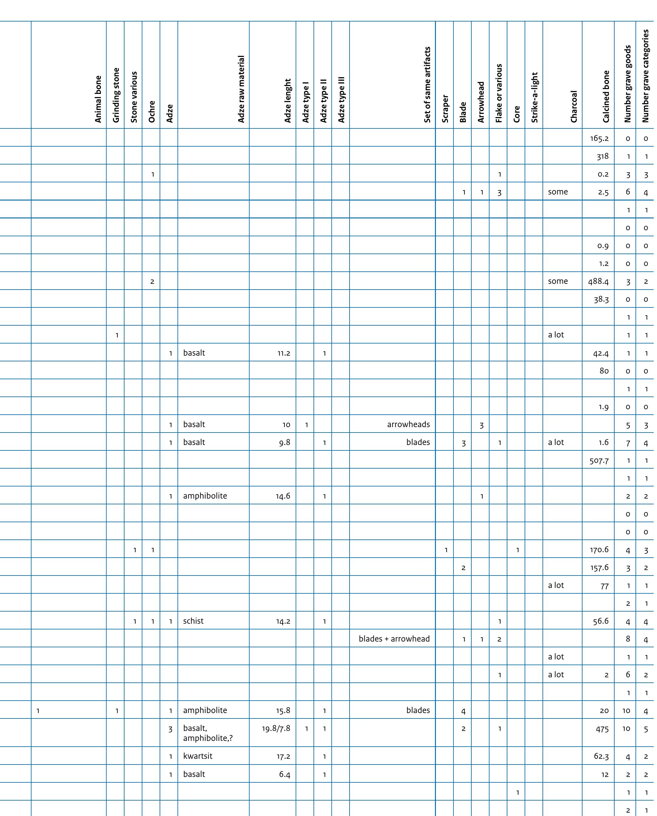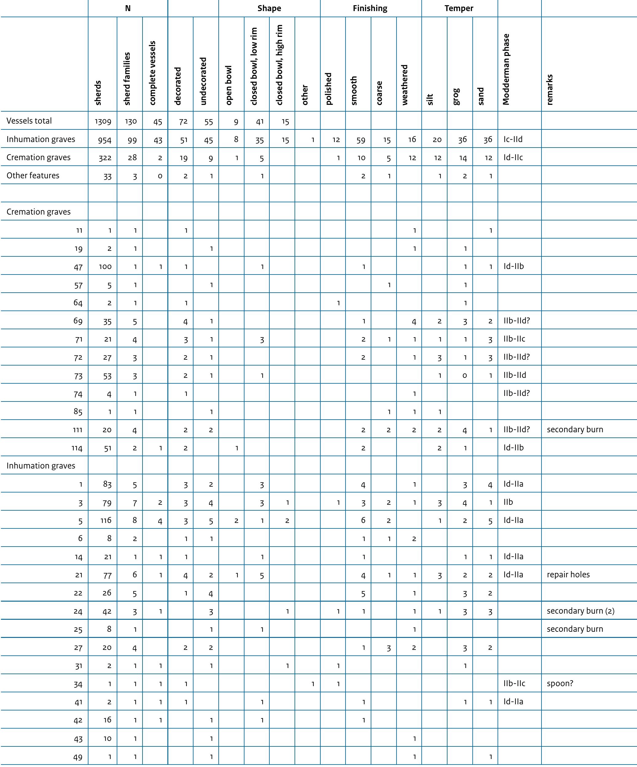two prominent features that distinguish this site from other known settlements in the Netherlands and the Graetheide settlement cluster. There seems to be little difference in material culture compared to other sites. Pottery, flint and stone tools typically conform to regional LBK standards. What