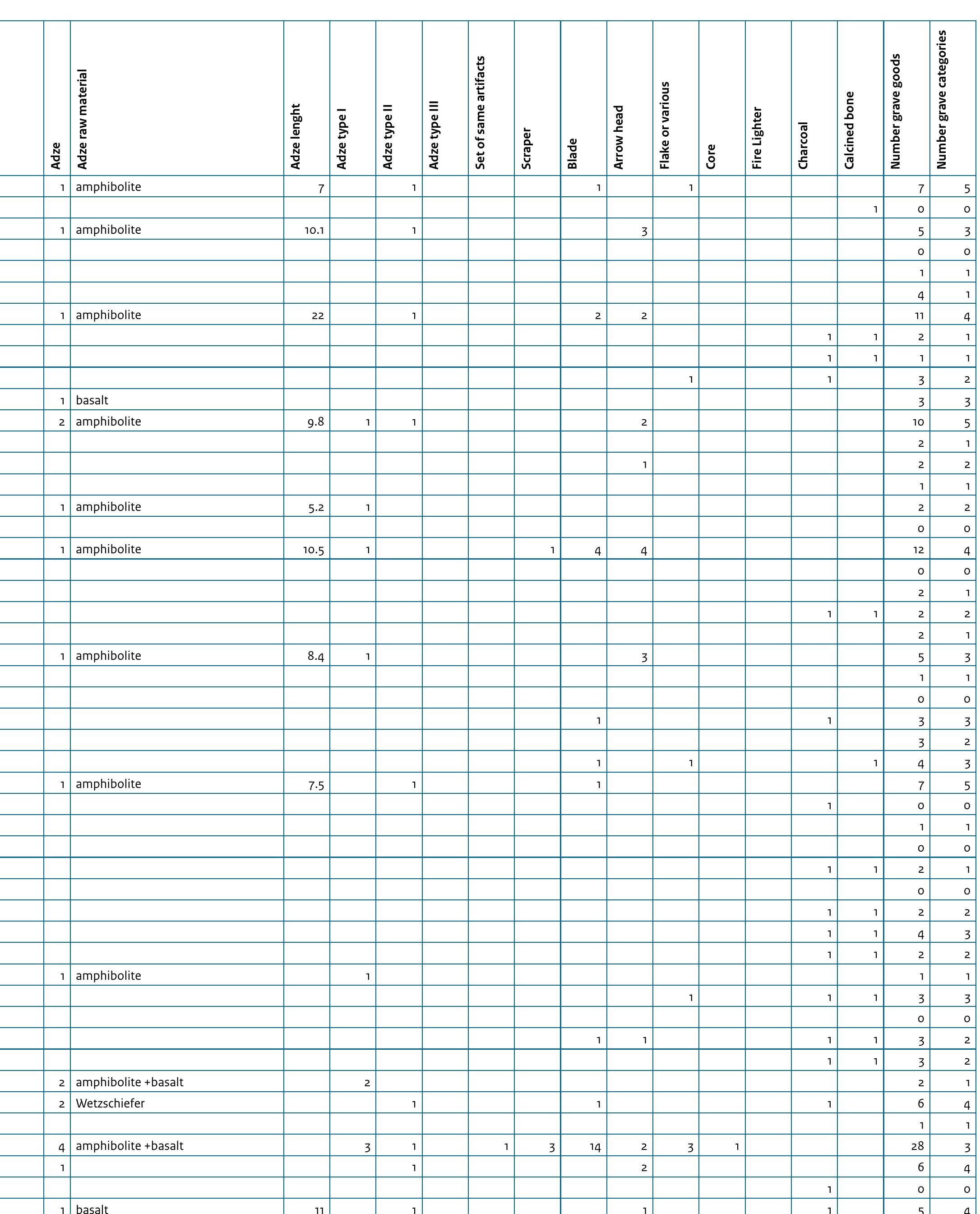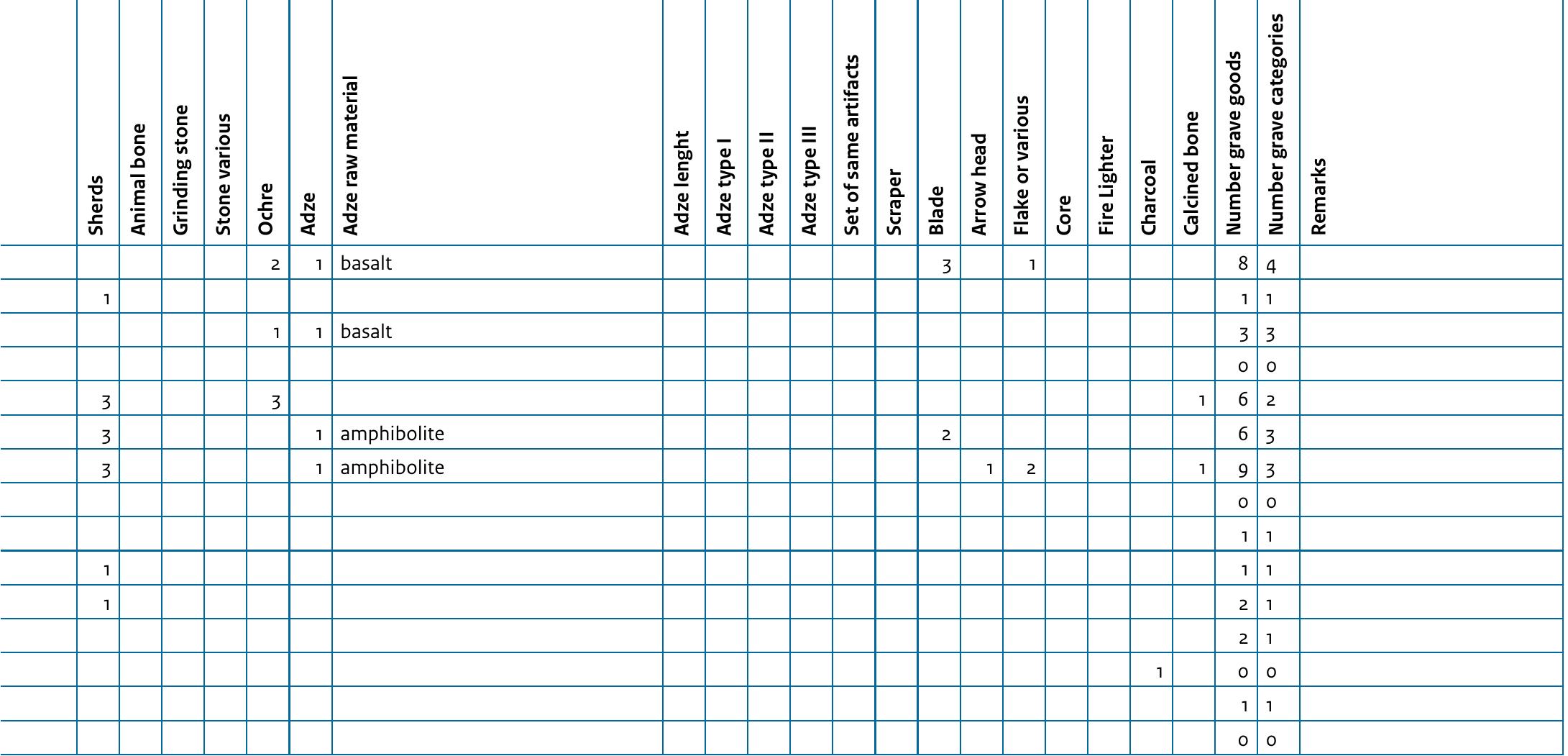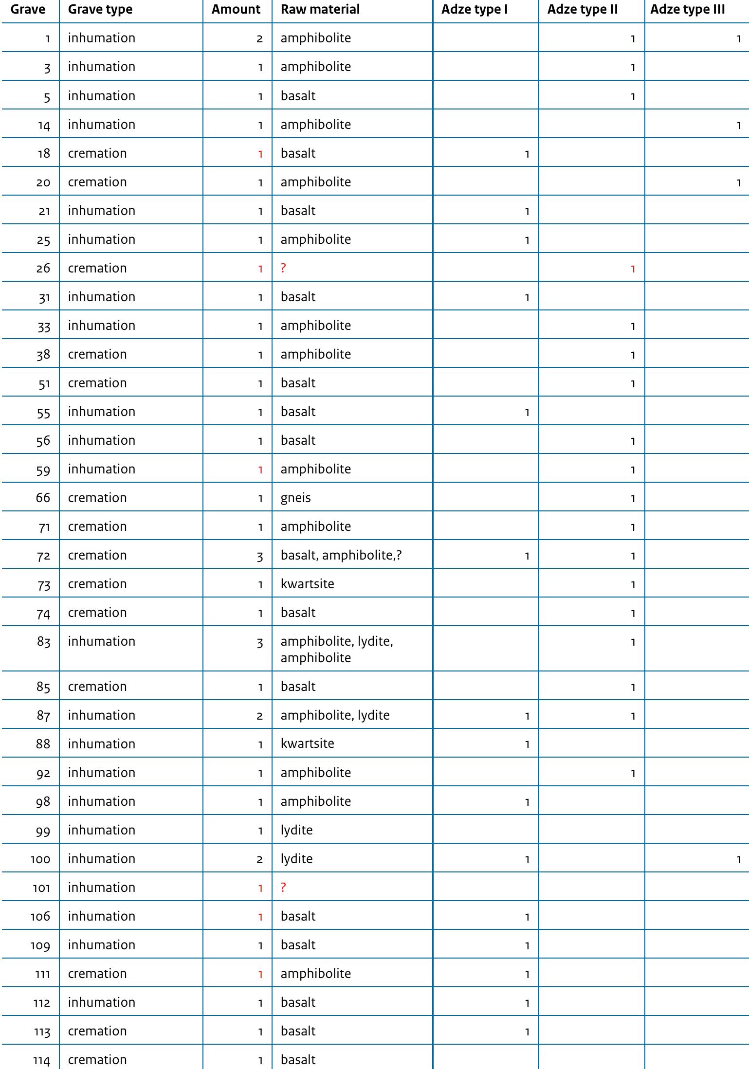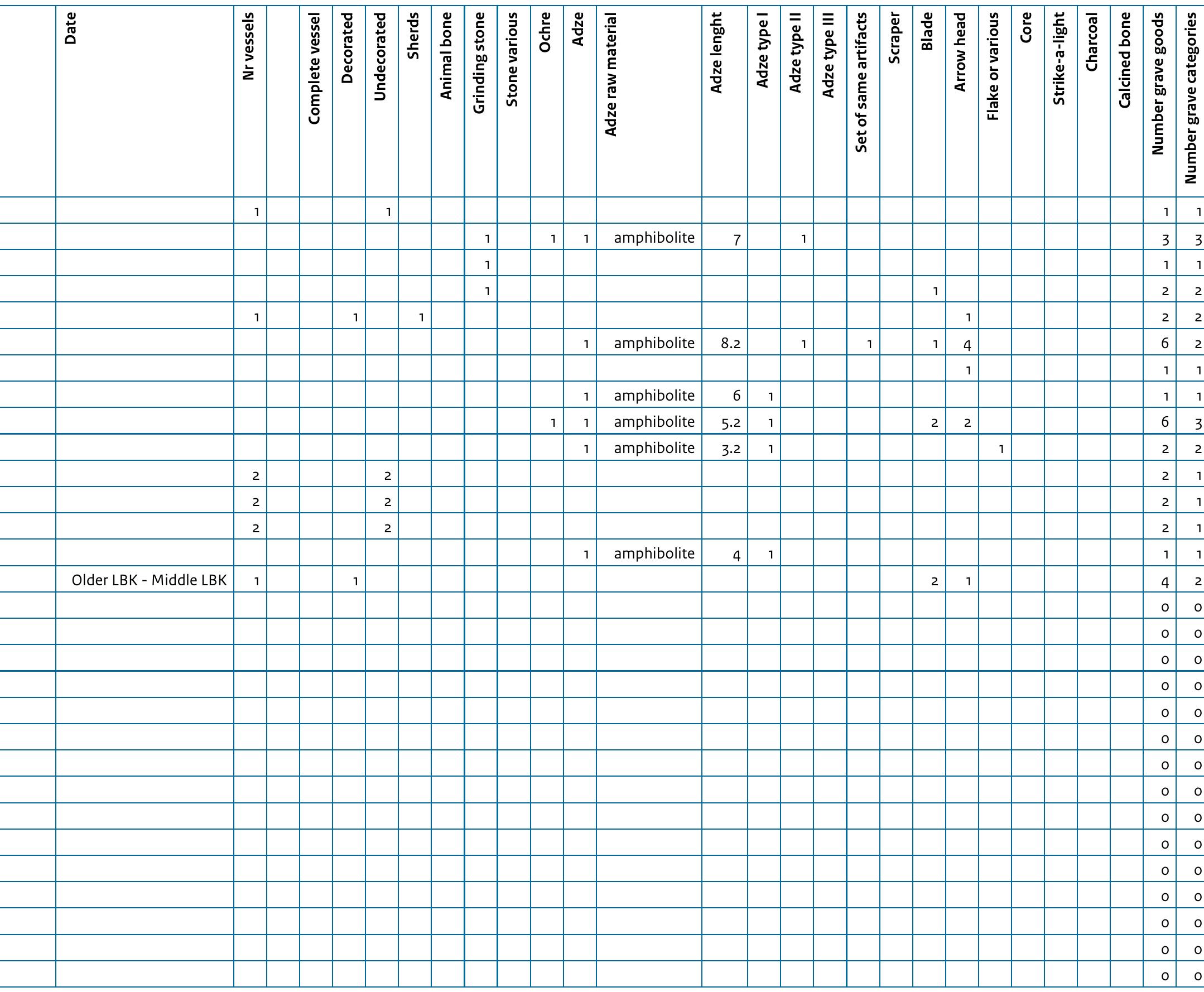 two prominent features that distinguish this site from other known settlements in the Netherlands and the Graetheide settlement cluster. There seems to be little difference in material culture compared to other sites. Pottery, flint and stone tools typically conform to regional LBK standards. What