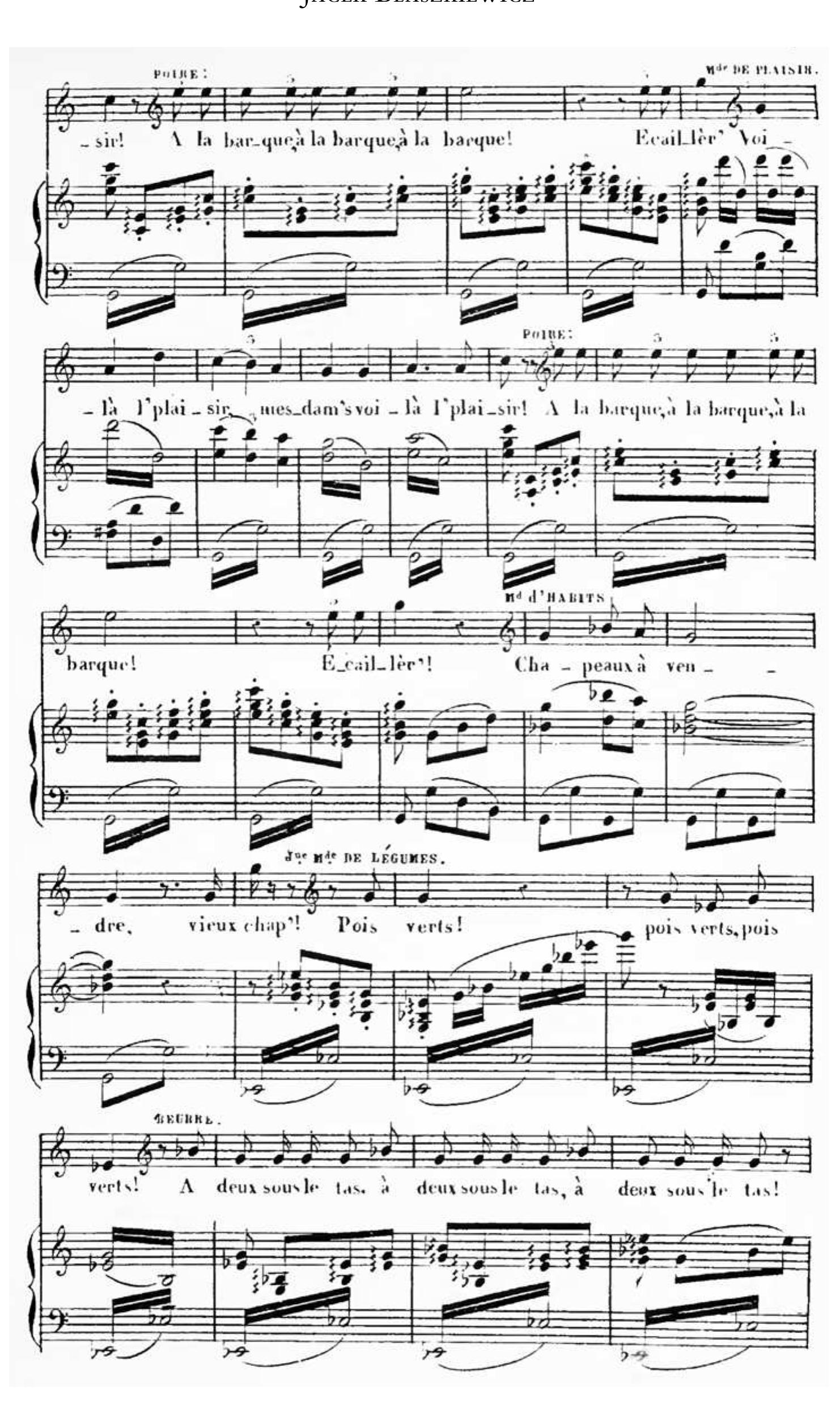 Yet a closer examination of the operetta’s dramatic and musical sources offers an alternate reading. This paper argues that Mesdames de la Halle belongs to a discourse of nostalgia for “old Paris,” which was disappearing in the midst of Haussmann’s urbanization of the capital. Set in the Marché des Innocents during the reign of Louis XV, the operetta opens with a chorus of street vendors who sing of their wares. This opening scene bears a close resemblance to the marketplace scene from Act III of Auber’s La Muette de Portici: both help create an “urban” atmosphere that serves as the backdrop for the “interior” drama of the main characters. But in fact, the representation of the cries of Parisian street vendors is a centuries-old practice; as historian Vincent Milliot has observed, Parisian street cries inspired numerous historical, visual, and literary reflections from the sixteenth through the eighteenth centuries (Milliot 1995). However, by the late 1850s, increased rent and the construction of wide boulevards pushed itinerant street hawkers from the city’s center into the banlieues.