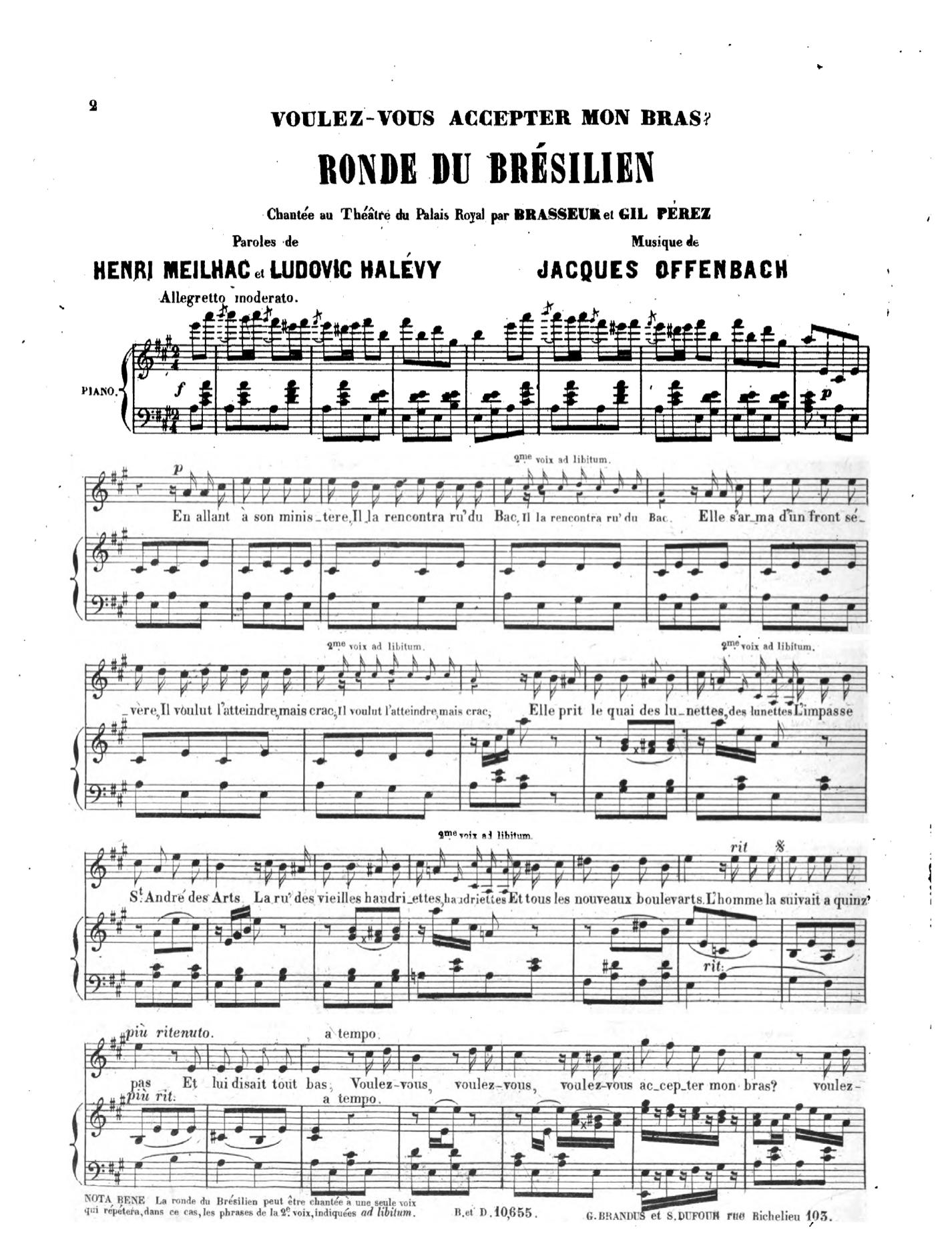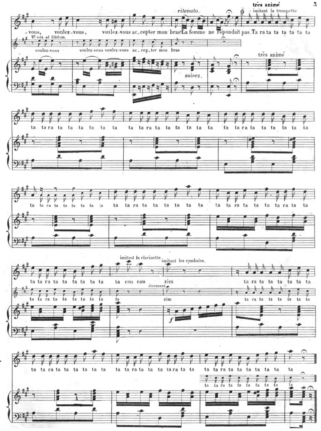 Within this urban context, I read Offenbach’s Mesdames as symbolically transferring the sounds of Parisian hawkers from the streets to the operetta stage. Offenbach’s score features direct melodic quotations from Jean-Georges Kastner’s Les voix de Paris, a musical history of Parisian street cries published in 1857, a year before the premiere of Mesdames. Kastner’s little-known study consists of two parts: the first is an “ethnographic” prose history of street cries that featured copious musical transcriptions, while the second is a fully scored symphonic poem entitled Les cris de Paris. Upon its publication, Kastner’s book was immediately understood as a nostalgic text; as Joseph d’Ortigue remarked in the Journal des débats, Kastner had “documented the vestiges of vieux Paris.” Thus, by quoting musical transcriptions of cries from Kastner’s Les voix de Paris in the operetta’s choral numbers, Offenbach not only tested the dramatic and musical capabilities of a large operetta chorus, but also memorialized a vanishing urban soundscape.