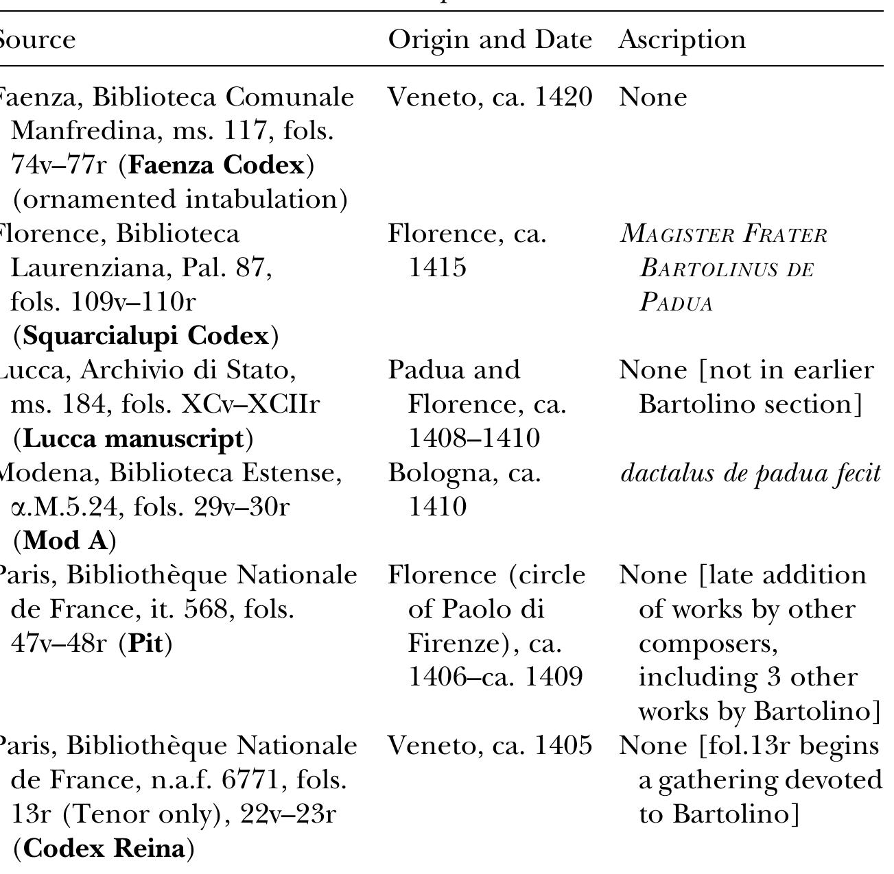 Scholars have proposed Milan, Pisa and/or Bologna as possible locations for the copying of the in... more Scholars have proposed Milan, Pisa and/or Bologna as possible locations for the copying of the inner gatherings (II–IV) of the manuscript Modena, Biblioteca Estense Universitaria, [alpha].M.5.24 (Mod A) and have argued that some of the compositions might have originated in the circle of Archbishop of Milan Pietro Filargo. Yet evidence based on Mod A’s repertory and the scant biographies of its composers is insufficient for determining the manuscript’s origin. To solve this problem, I look at Mod A as a cultural artifact, attributing its illumination to the Master of 1411, an illuminator active in Bologna from 1404 to 1411, or to his assistant, both associated with the manuscript workshop of the Oli- vetan abbey of San Michele in Bosco, on the outskirts of medieval Bologna. The Master of 1411 might have been Giacomo da Padova, an illuminator documented there between 1407 and 1409. Iconographical analysis shows that the illuminator of Mod A possessed considerable knowledge of Paduan culture before the fall of the ruling Carrara family in 1405. This knowledge is apparent in his use of an astrological allusion to Carrara heraldry in his decoration of the song Inperial sedendo. His illumination of a Gloria by Egardus with the figure of Saint Anthony of Padua implies a familiarity with Padua’s musical institutions. Mod A may have been illuminated when the papal entourage of John XXIII visited San Michele in Bosco in the fall of 1410, although further compositions were added after the illuminator had finished his work. This conclusion invites scholars to consider afresh the social context that might have fostered the compilation of the repertory in the inner gatherings of Mod A.