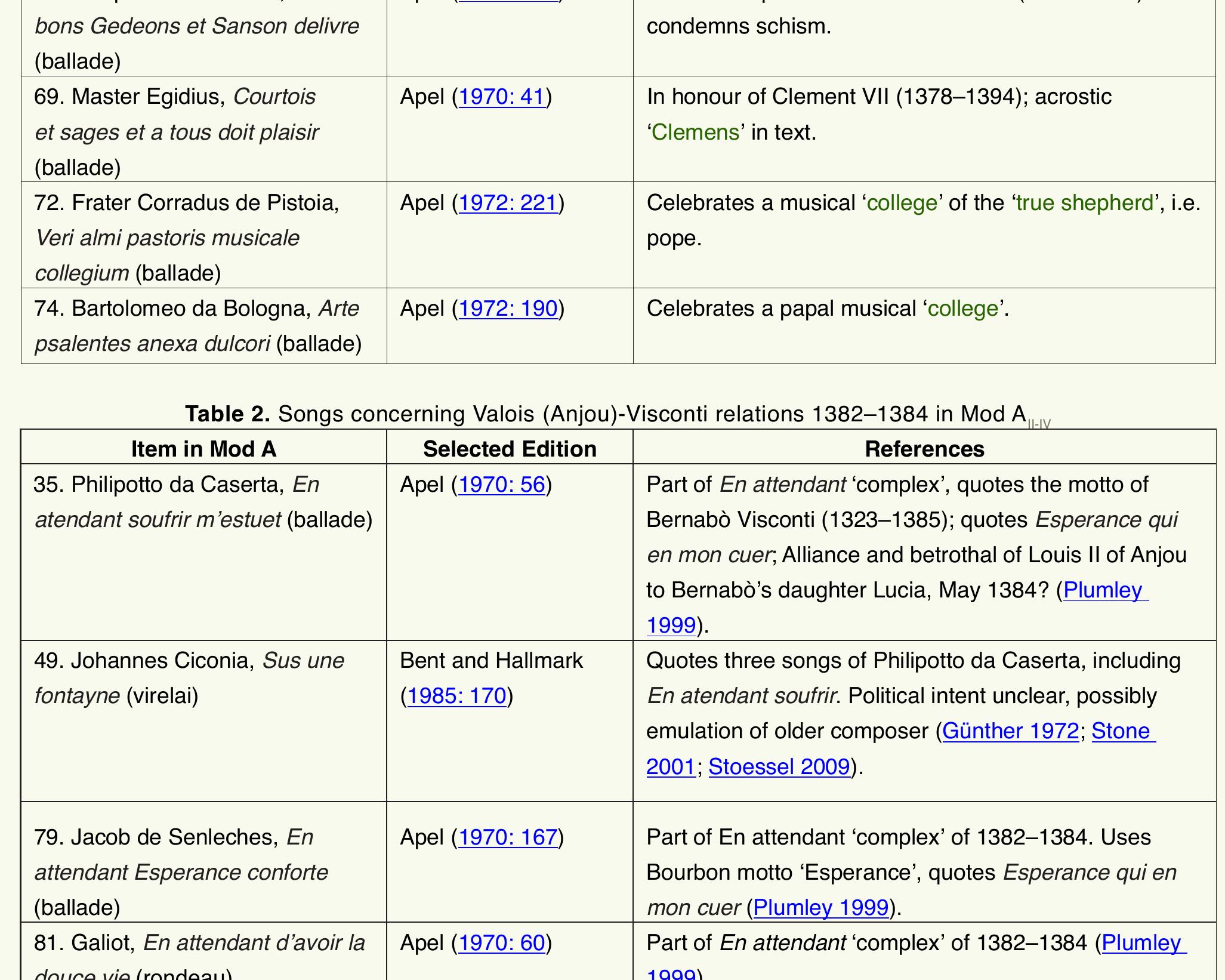 The inner gatherings of the music manuscript Modena, Biblioteca Estense, MS. α.M.5.24 (Mod AII-IV... more The inner gatherings of the music manuscript Modena, Biblioteca Estense, MS. α.M.5.24 (Mod AII-IV) contain a tangle of politically-charged songs, mostly in French, referring to the tumultuous Great Schism of the Western Church (1378–1417) and the prowess of several princes of ascendant Italian states during the same period. Some scholars have connected the repertoire of Mod AII-IV with Pétros Fílargos, sometime Archbishop of Milan and then the short-lived conciliar pope Alexander V. Yet art-historical evidence now strongly suggests that Mod AII-IV was completed during the pontificate of Alexander’s successor, John XXIII, between September 1410 and March 1411 in Bologna. During the first two years of John’s pontificate the influential and wealthy prince of France, Louis II of Anjou, prosecuted his claim for title of the Kingdom of Naples in Italy, simultaneously supporting John XXIII’s military campaign to reclaim Rome. This article explores a new hypothesis that part of the repertoire of Mod AII-IV—and possibly the manuscript’s very structure—reflects the presence of the Angevin prince at the court of John XXIII in Bologna in the second half of 1410. It considers how other political threads running through this manuscript render it an unlikely candidate for a source connected with the pro-Visconti Alexander V.
