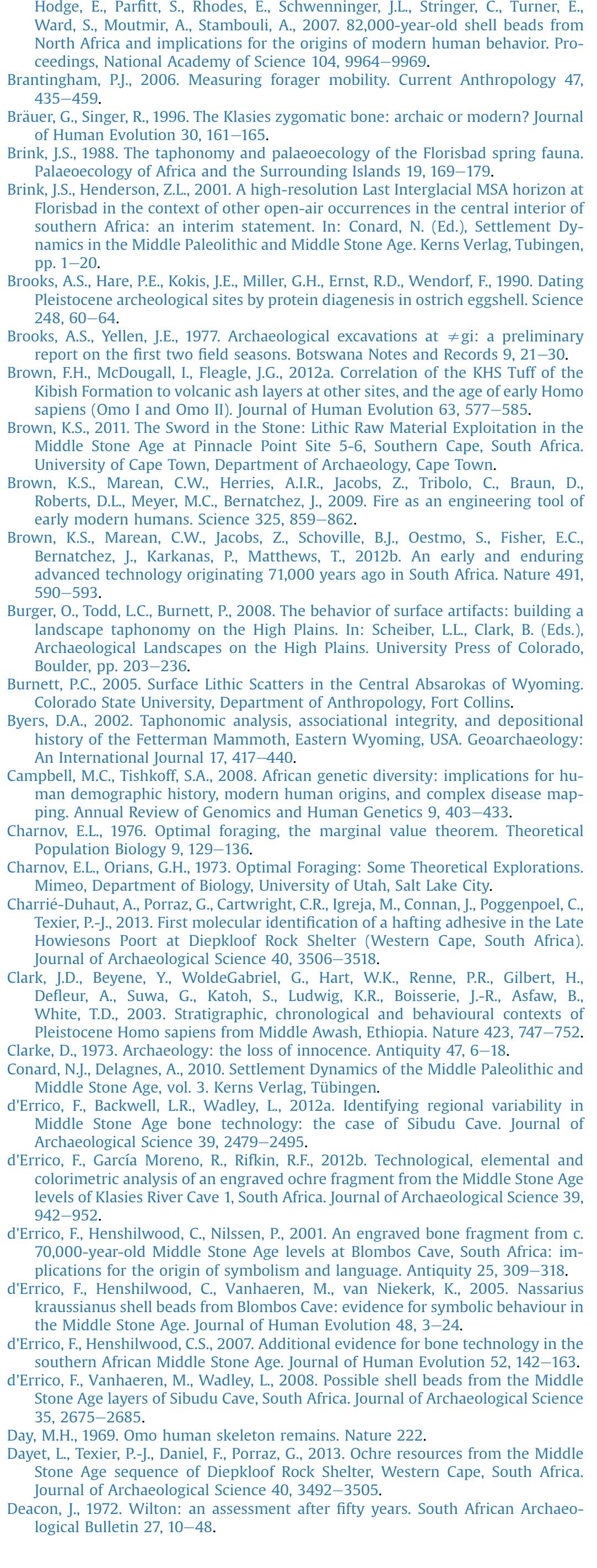 Three aspects of the African Middle Stone Age (MSA) archaeological record - the use of symbolic r... more Three aspects of the African Middle Stone Age (MSA) archaeological record - the use of symbolic resources, long-distance transfer of raw materials, and socalled ‘regional traditions’ in projectile point form - are examined within the context of the modern human behaviour debate. It is argued that projectile points in the MSA may have manifested active (but not emblemic) style, and may have once symbolized social relations between obligated individuals. Archaeological evidence for notational items, personal ornaments, and ochre processing attest to the manipulation of symbolic resources by MSA hominids, and raw material sourcing studies suggest they were involved in regional exchange networks. Together this evidence supports a scenario in which projectile points are integrated into a communal system of exchange and may explain both the homogeneity of form across space and time, and the heterogeneity of form observed across the continent. This perspective implies an early origin for behavioral modernity at least 80 kya.