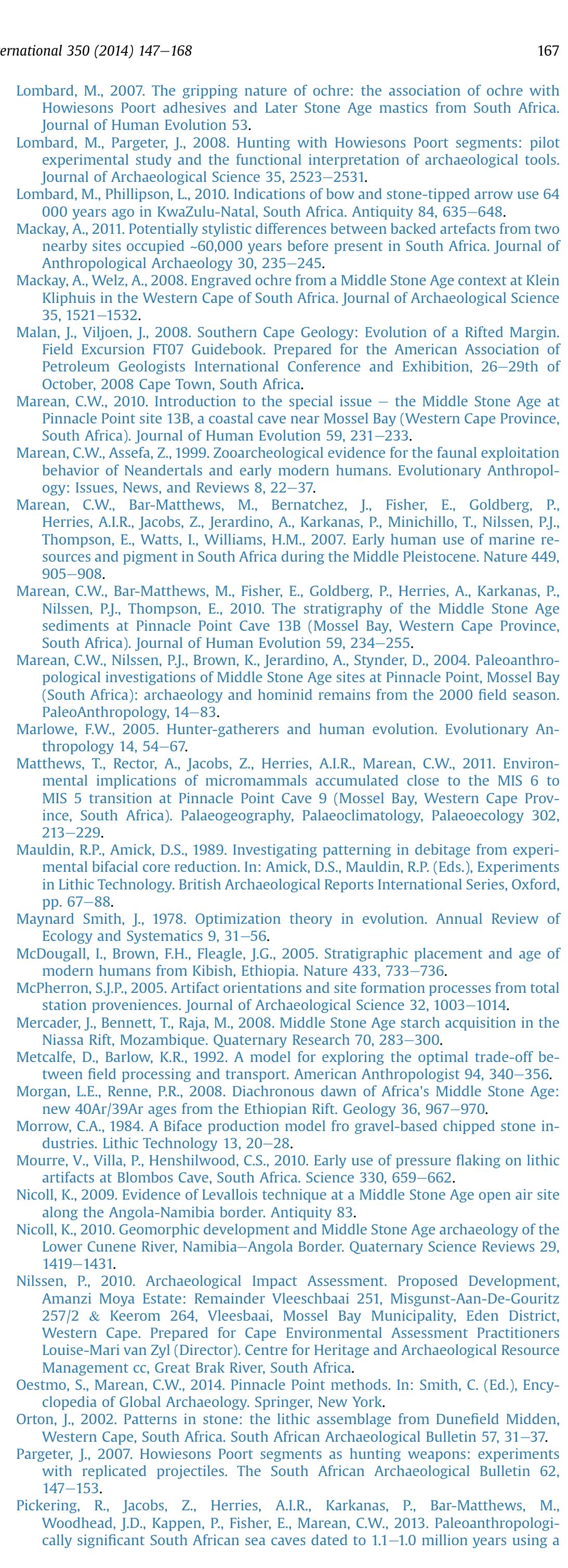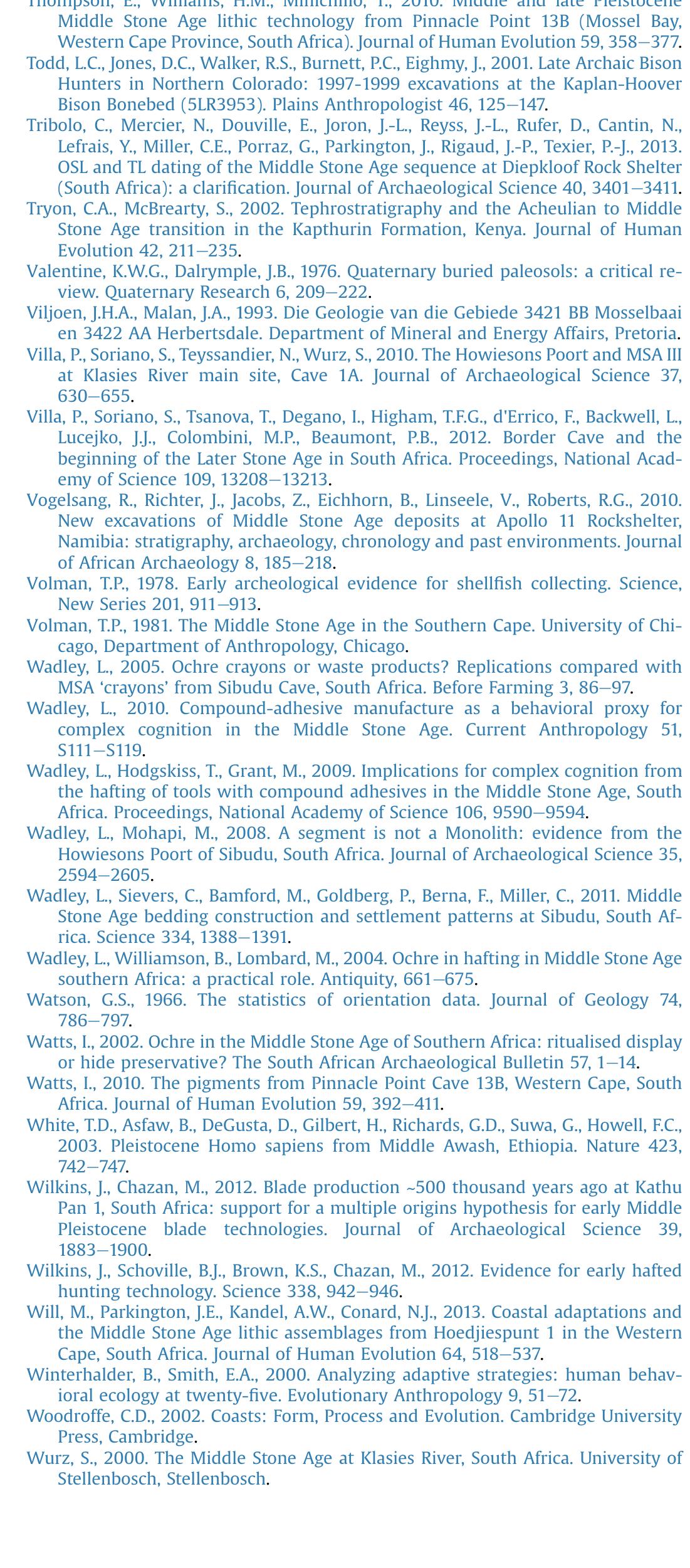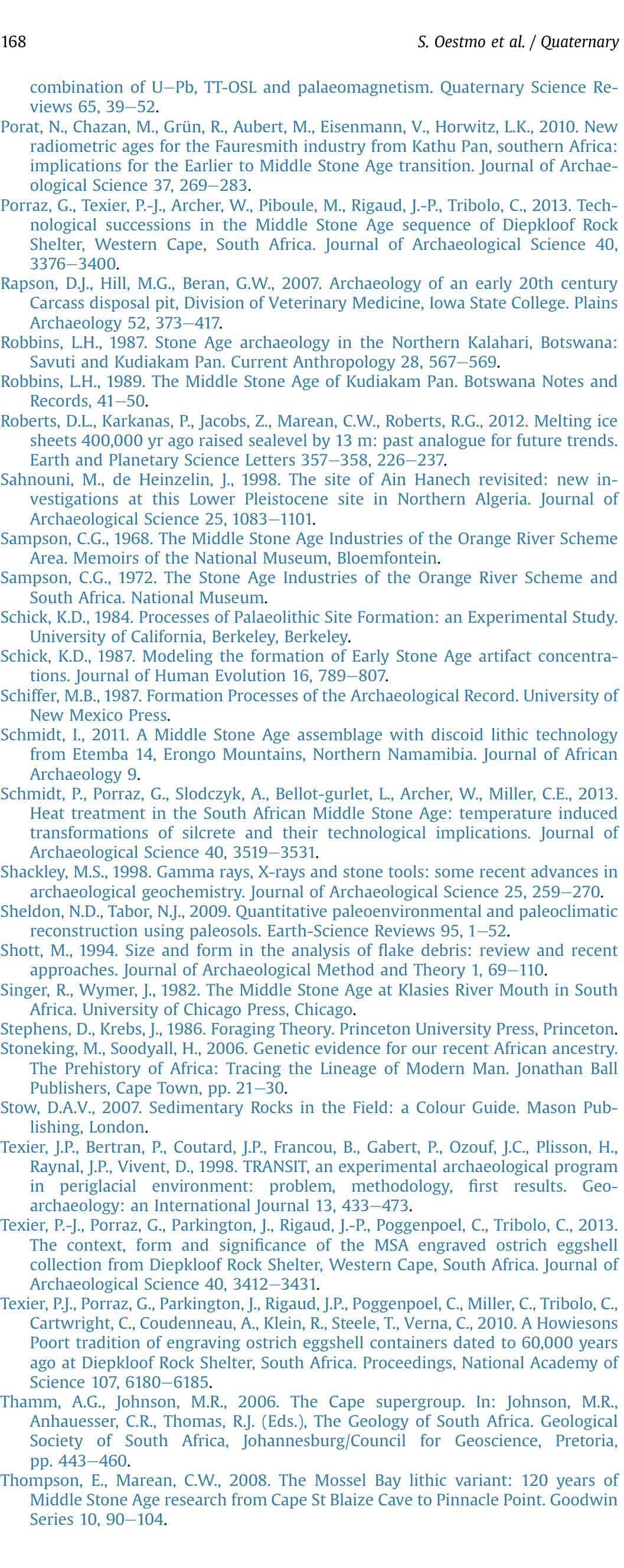 Open-air Middle Stone Age (MSA) contexts in southern Africa have received relatively little resea... more Open-air Middle Stone Age (MSA) contexts in southern Africa have received relatively little research attention compared to caves/rock-shelters. MSA caves/rock shelters can provide long sequences of MSA behaviors dominated by residential activities in circumscribed contexts but most procurement activities occurred on the landscape in uncircumscribed space. We have a limited understanding of these activities at present, making studies of open-air sites crucial. To alleviate this bias, the South African Coast Paleoclimate, Paleoenvironment, Paleoecology, Paleoanthropology (SACP4) project expanded its research scope to include MSA archaeology from open-air contexts. We report on a series of MSA open-air assemblages that are exposed on ancient land surfaces suggestive of intact paleosols at Vleesbaai and Visbaai, South Africa. Importantly, these sites occur in close proximity to the long cave/rock shelter sequences at Pinnacle Point. This presents the novel potential to study evidence of MSA behavior in closed and open settings where their proximity to each other approximates the typical hunteregatherer daily foraging radius documented in ethnography. We present a fabric and technological analysis of MSA stone tool assemblages from three "Areas". Analysis of total-station piece plotting of artifact bearing/plunge suggests that the lithic assemblages have undergone limited post-depositional disturbance. The technological analysis and exploratory comparisons between these open-air assemblages and MSA cave and rock shelter contexts at Pinnacle Point Cave 13B and 9, and Cape St. Blaize Cave suggest that the quartzite artifacts from Vleesbaai were procured from locally available sources and may have been field processed there before being transported elsewhere, perhaps to the caves/rock shelters. Further, the analysis suggests a dichotomous pattern of retouched tool discard, where quartzite tools are discarded similarly across the landscape. In contrast, non-quartzite tools may have been made primarily at the cave sites, and discarded or lost more frequently on the landscape.