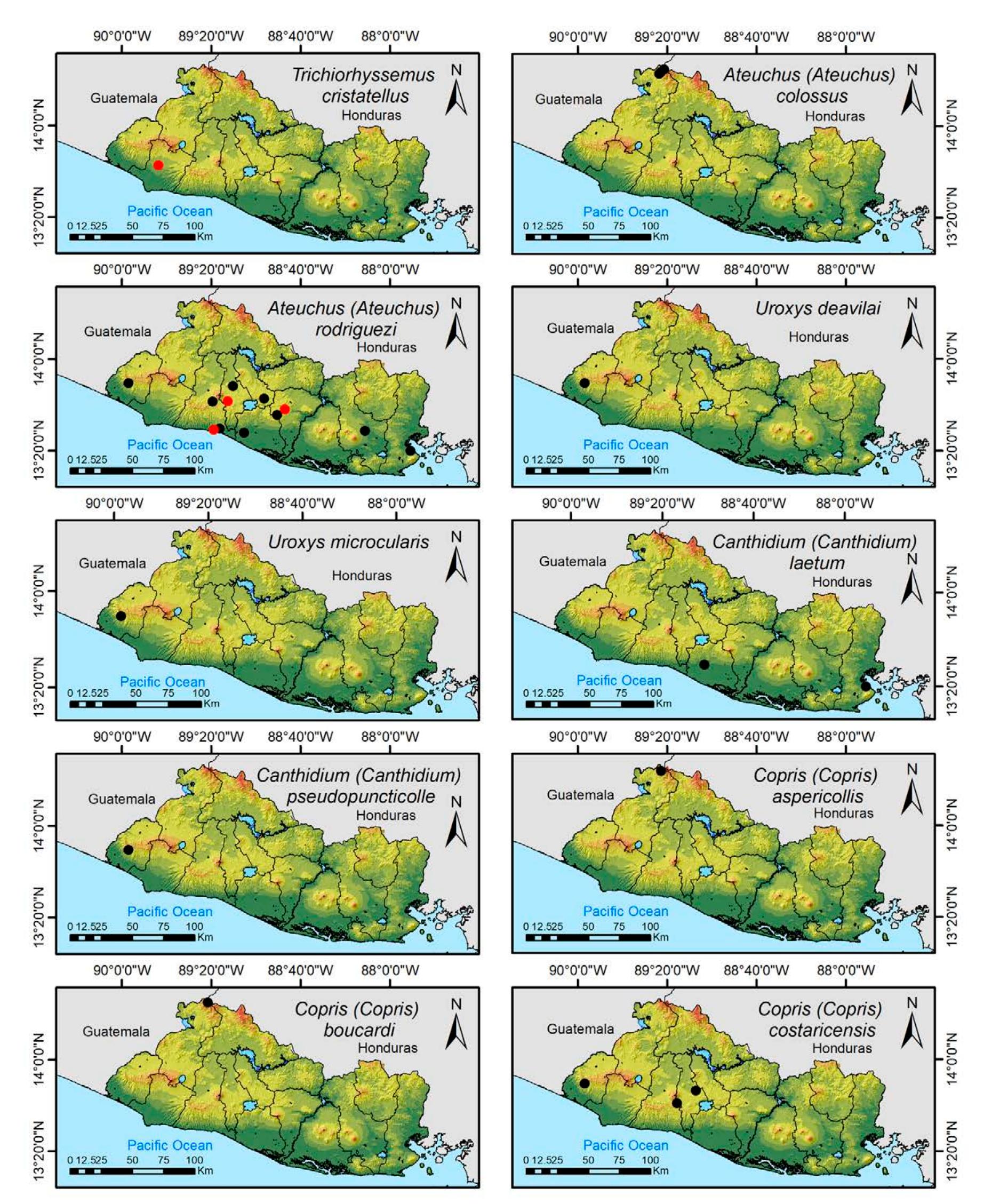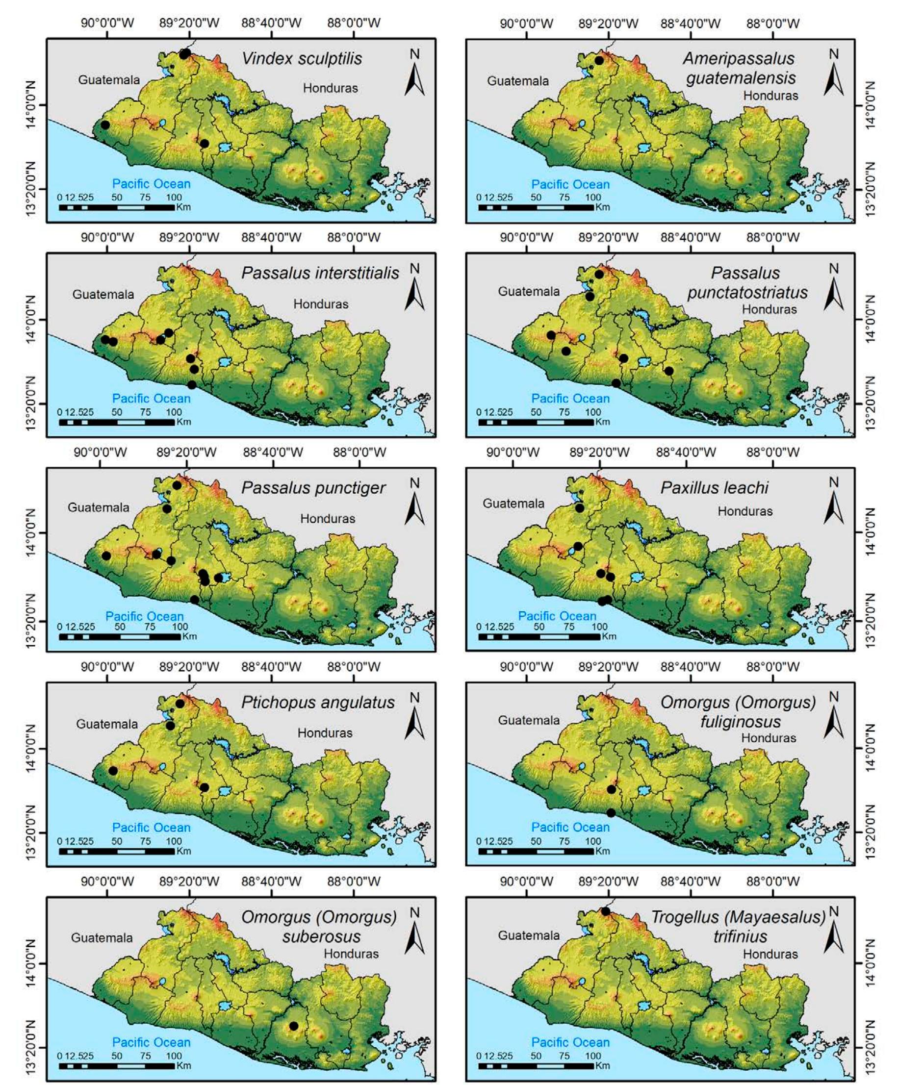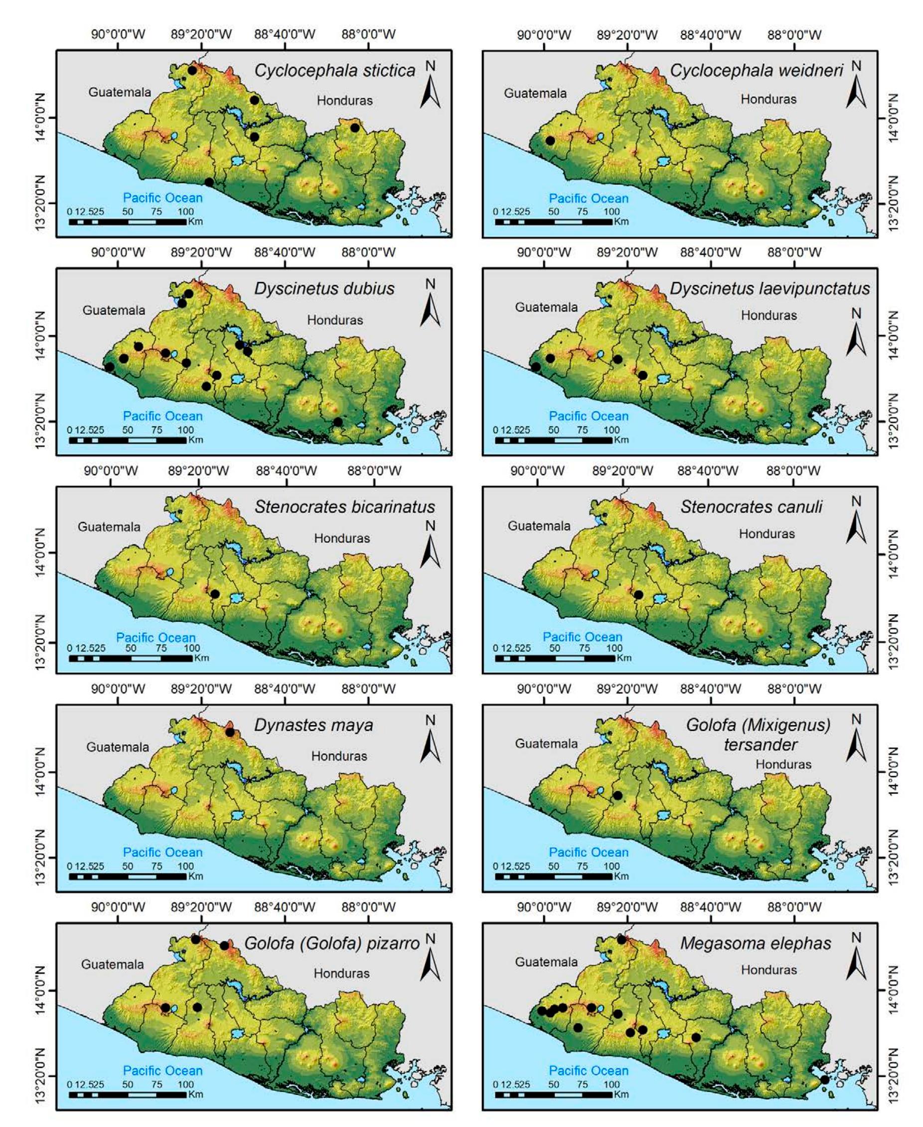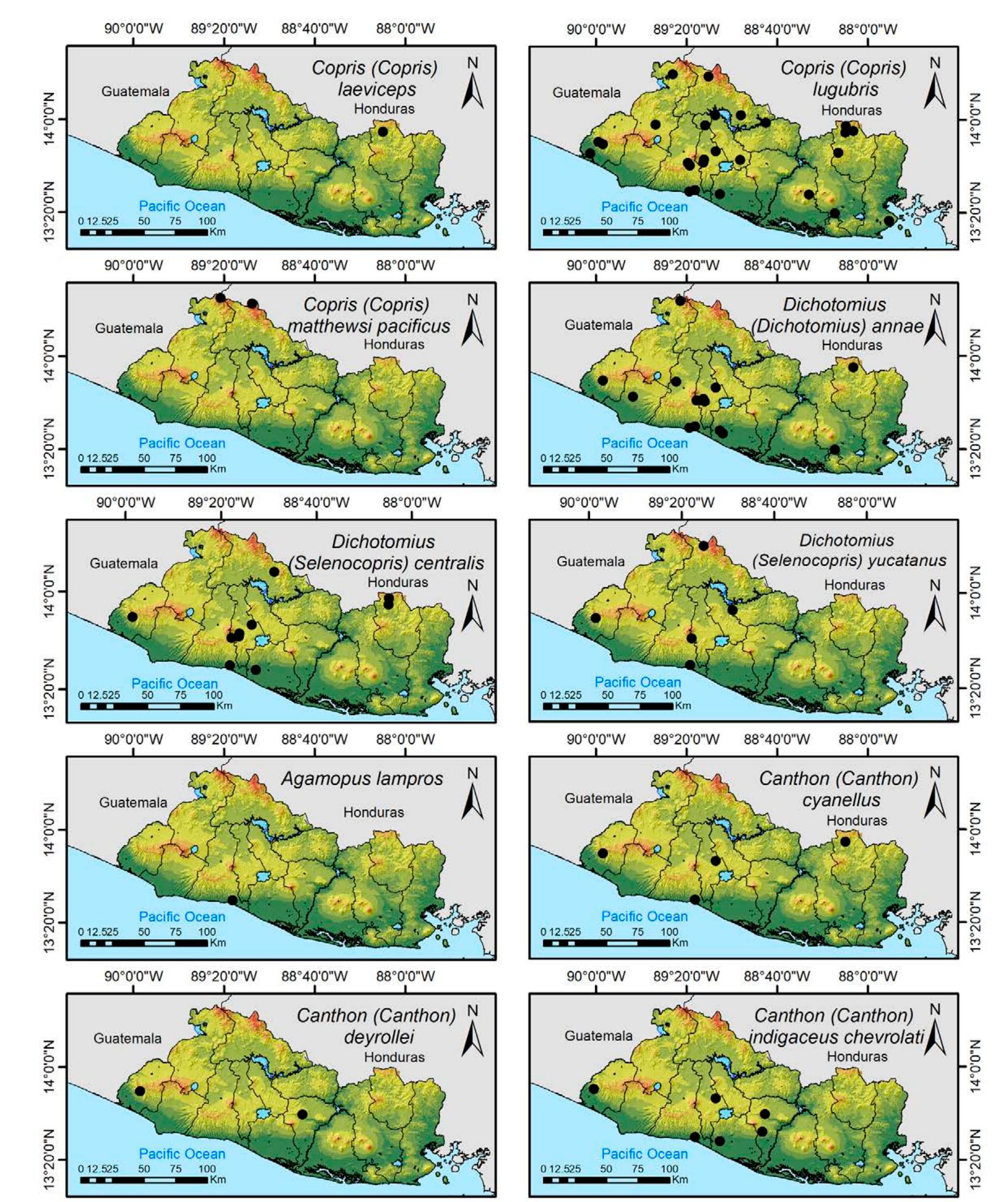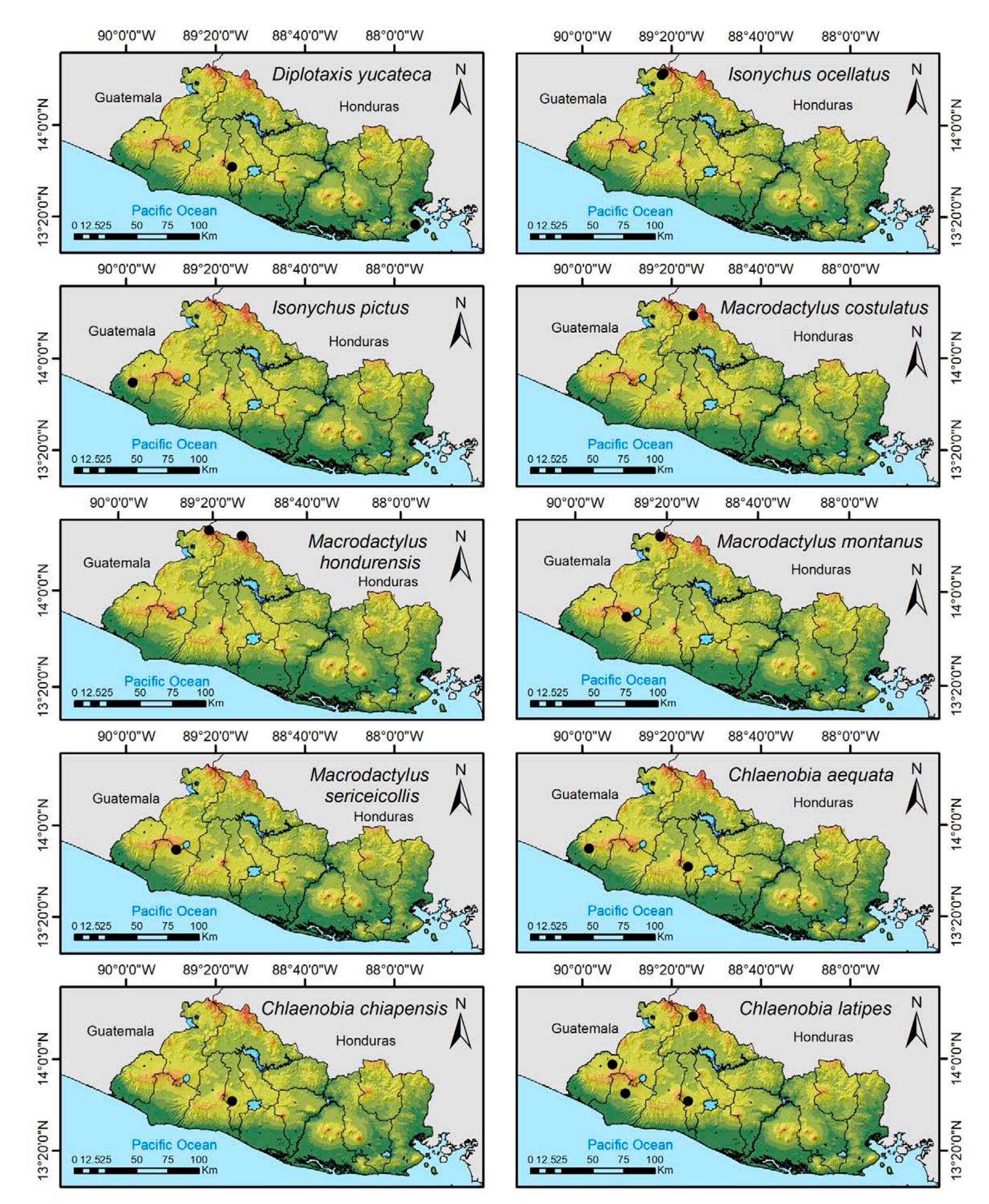 Less than 1% of the literature on El Salvador's biodiversity is about terrestrial invertebrates, ... more Less than 1% of the literature on El Salvador's biodiversity is about terrestrial invertebrates, which limits our knowledge of this group's diversity, richness, and distribution in the territory. Scarabaeoidea are megadiverse in multiple ecosystems and perform many functions. This work aims to catalog the Scarabaeoidea in El Salvador. We conducted an exhaustive review of published literature and reviewed numerous entomological collections with relevant material. Maps were constructed to visualize the known distribution of each species in the country. There are 295 scarab beetle species (including 19 new country records) representing 106 genera in 7 families in El Salvador. Six precinctive species are known. Twenty-two species are discarded as occurring in El Salvador, either because they are not valid species or because of misidentifications or dubious records. This work is the first approach to knowing the 420 species and 132 genera of Chrysomelidae, and Pablo-Cea et al. (2021) recorded 96 especies in 38 genera of Staphylinidae. Both families are important for their diverse feeding habits and behaviors in a variety of ecosystems (