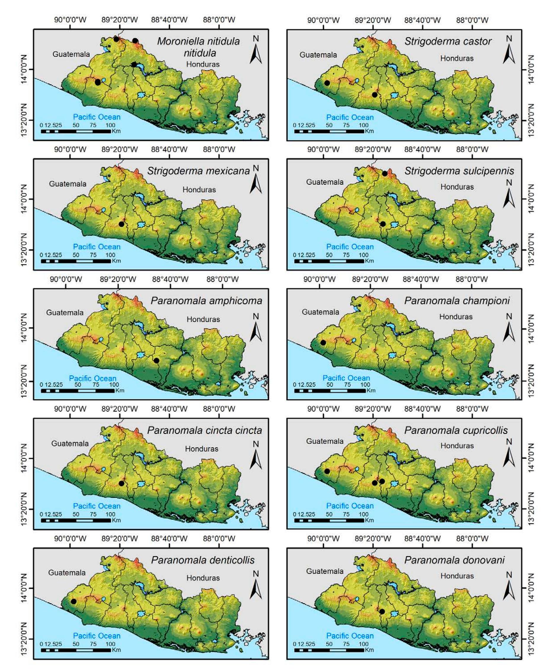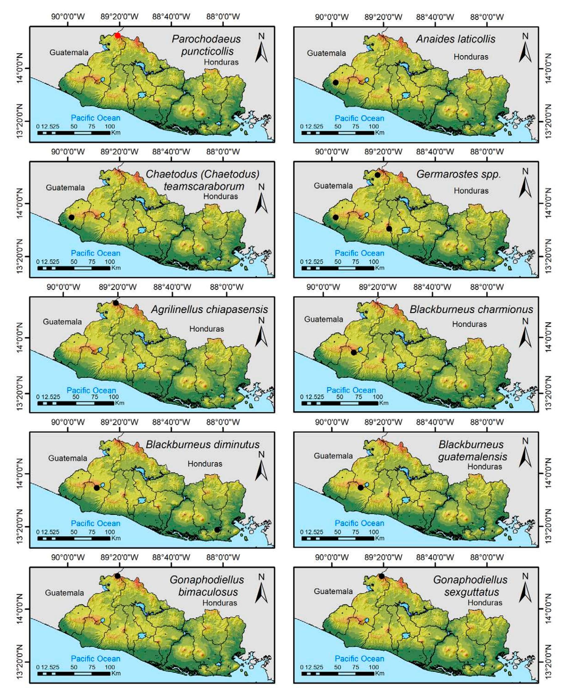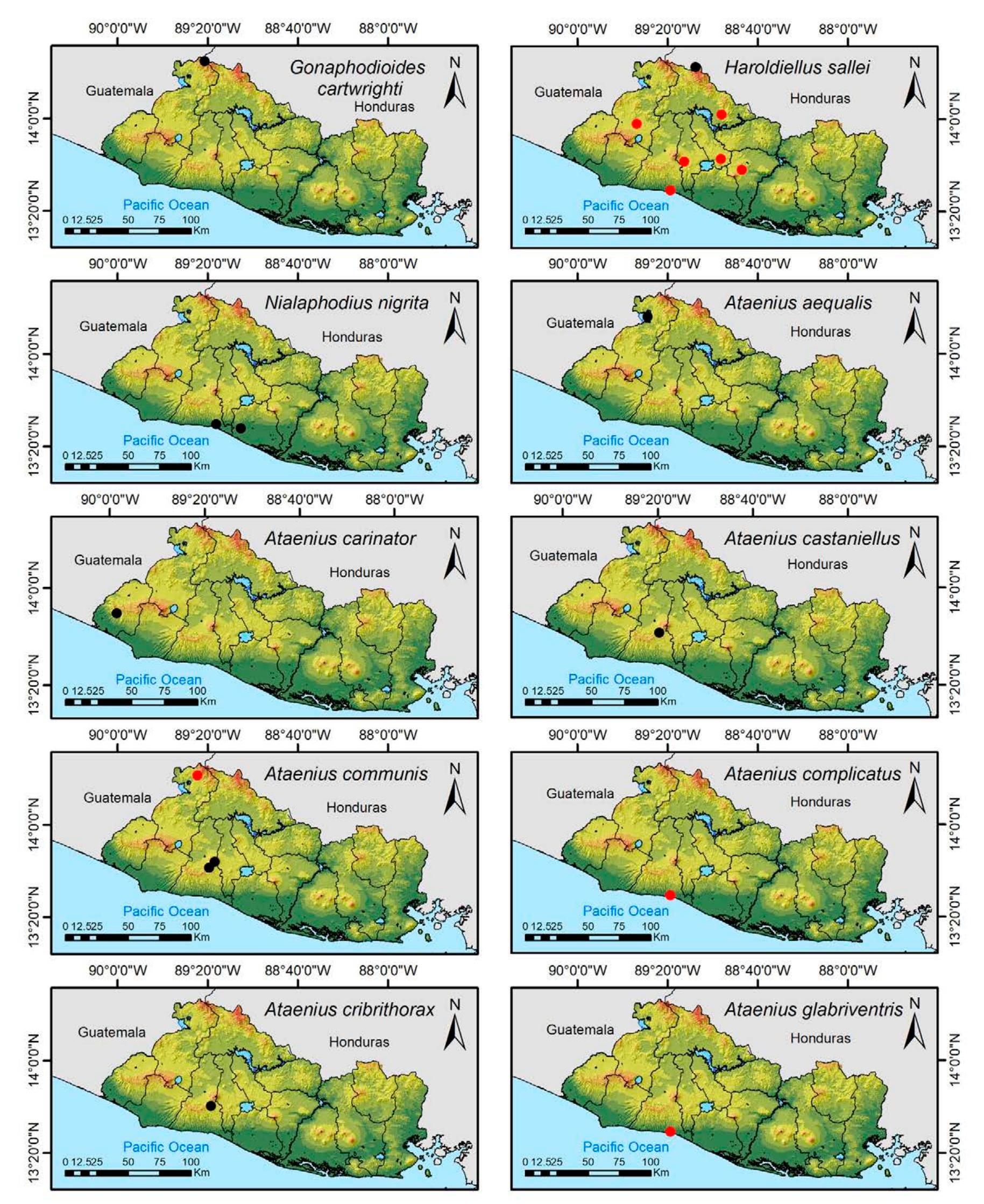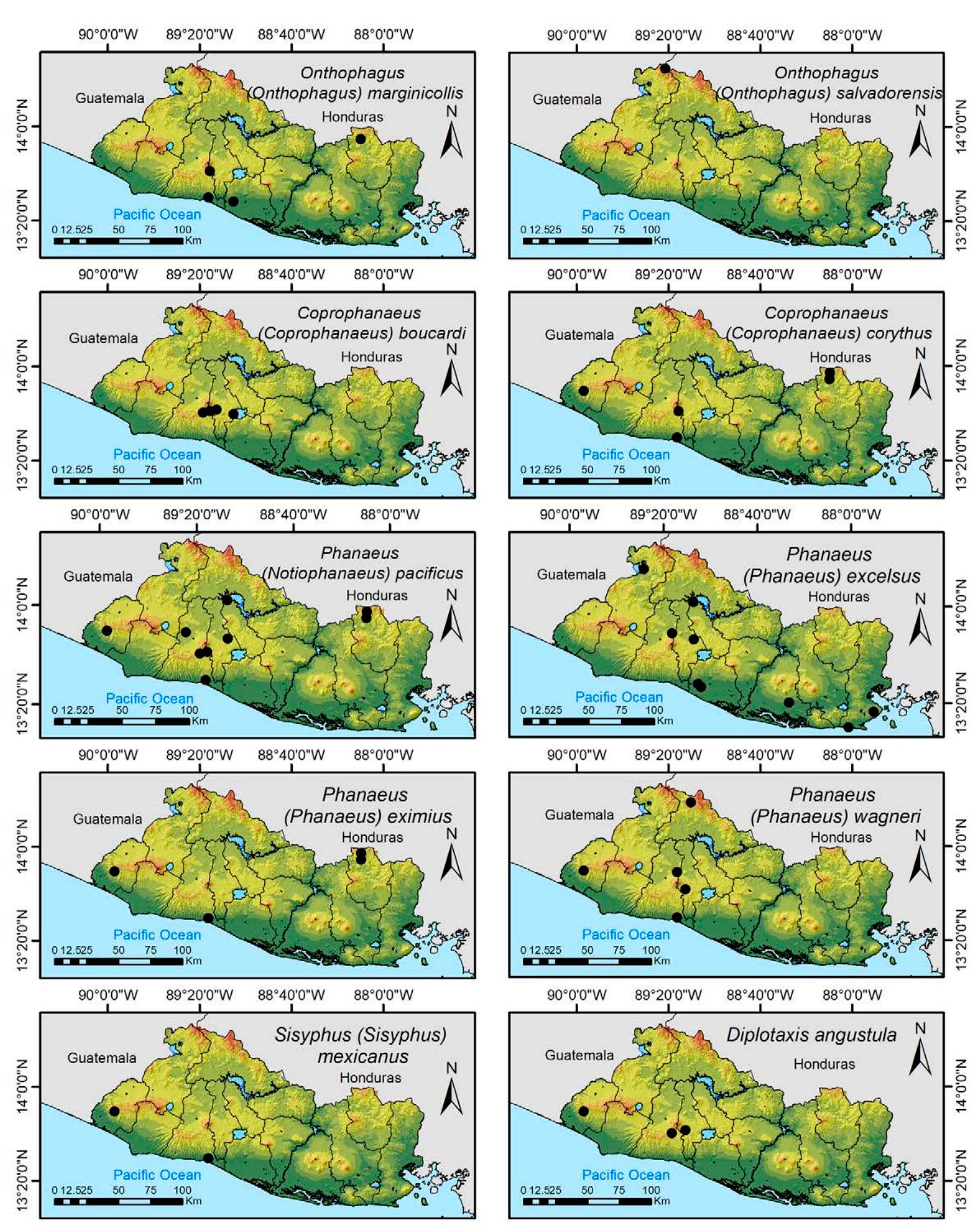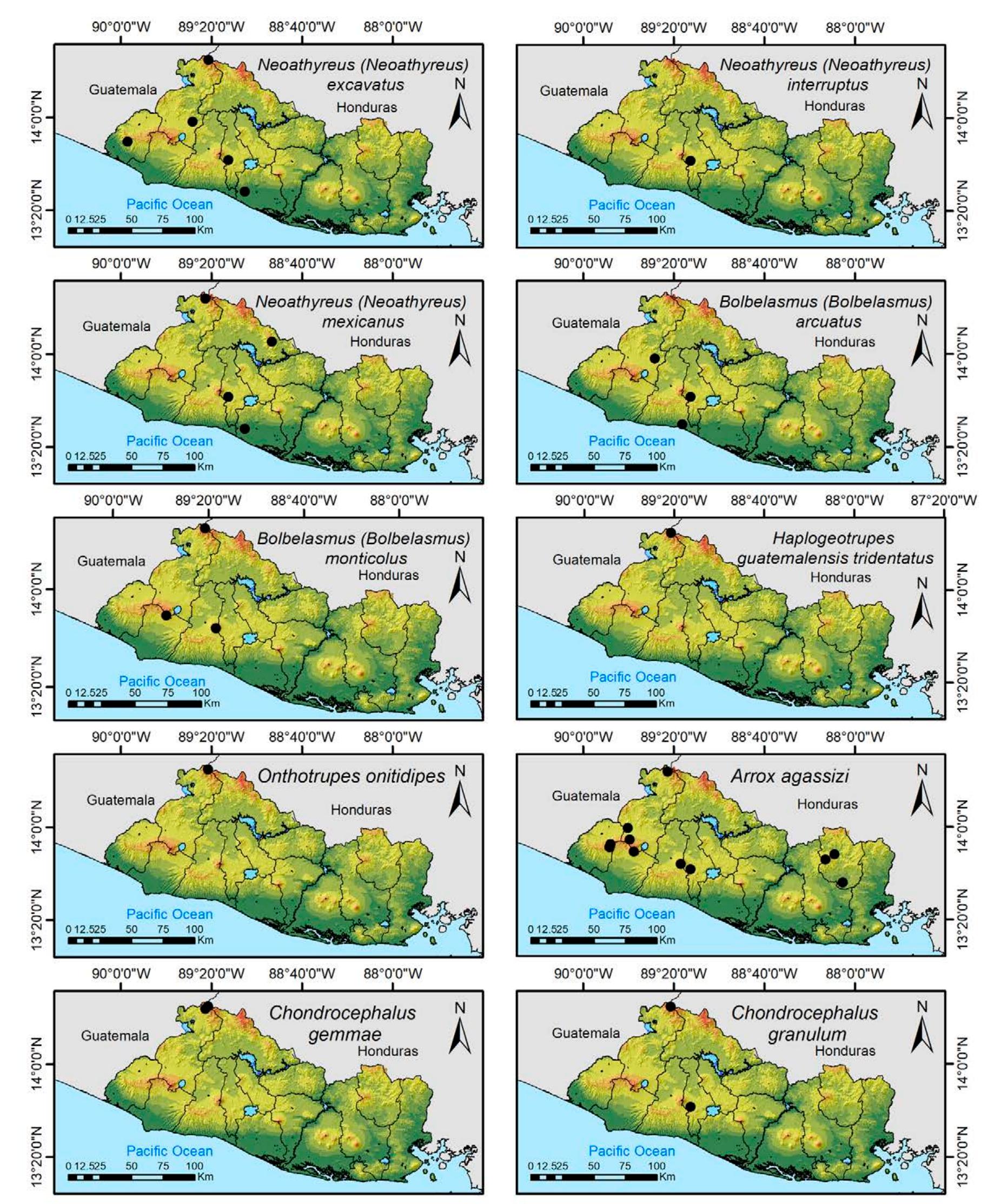 Less than 1% of the literature on El Salvador's biodiversity is about terrestrial invertebrates, ... more Less than 1% of the literature on El Salvador's biodiversity is about terrestrial invertebrates, which limits our knowledge of this group's diversity, richness, and distribution in the territory. Scarabaeoidea are megadiverse in multiple ecosystems and perform many functions. This work aims to catalog the Scarabaeoidea in El Salvador. We conducted an exhaustive review of published literature and reviewed numerous entomological collections with relevant material. Maps were constructed to visualize the known distribution of each species in the country. There are 295 scarab beetle species (including 19 new country records) representing 106 genera in 7 families in El Salvador. Six precinctive species are known. Twenty-two species are discarded as occurring in El Salvador, either because they are not valid species or because of misidentifications or dubious records. This work is the first approach to knowing the 420 species and 132 genera of Chrysomelidae, and Pablo-Cea et al. (2021) recorded 96 especies in 38 genera of Staphylinidae. Both families are important for their diverse feeding habits and behaviors in a variety of ecosystems (