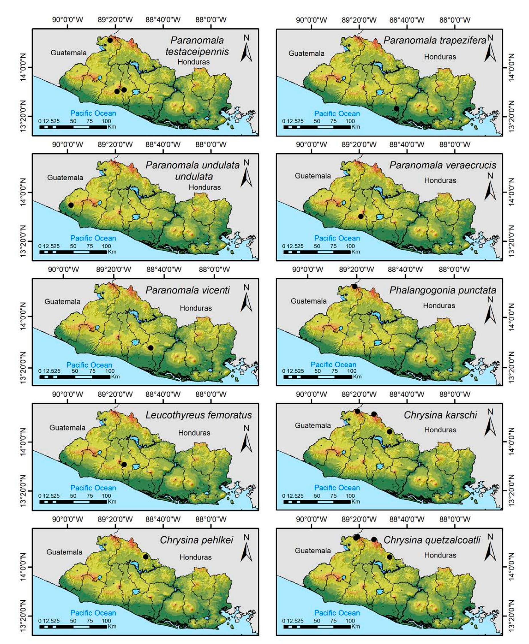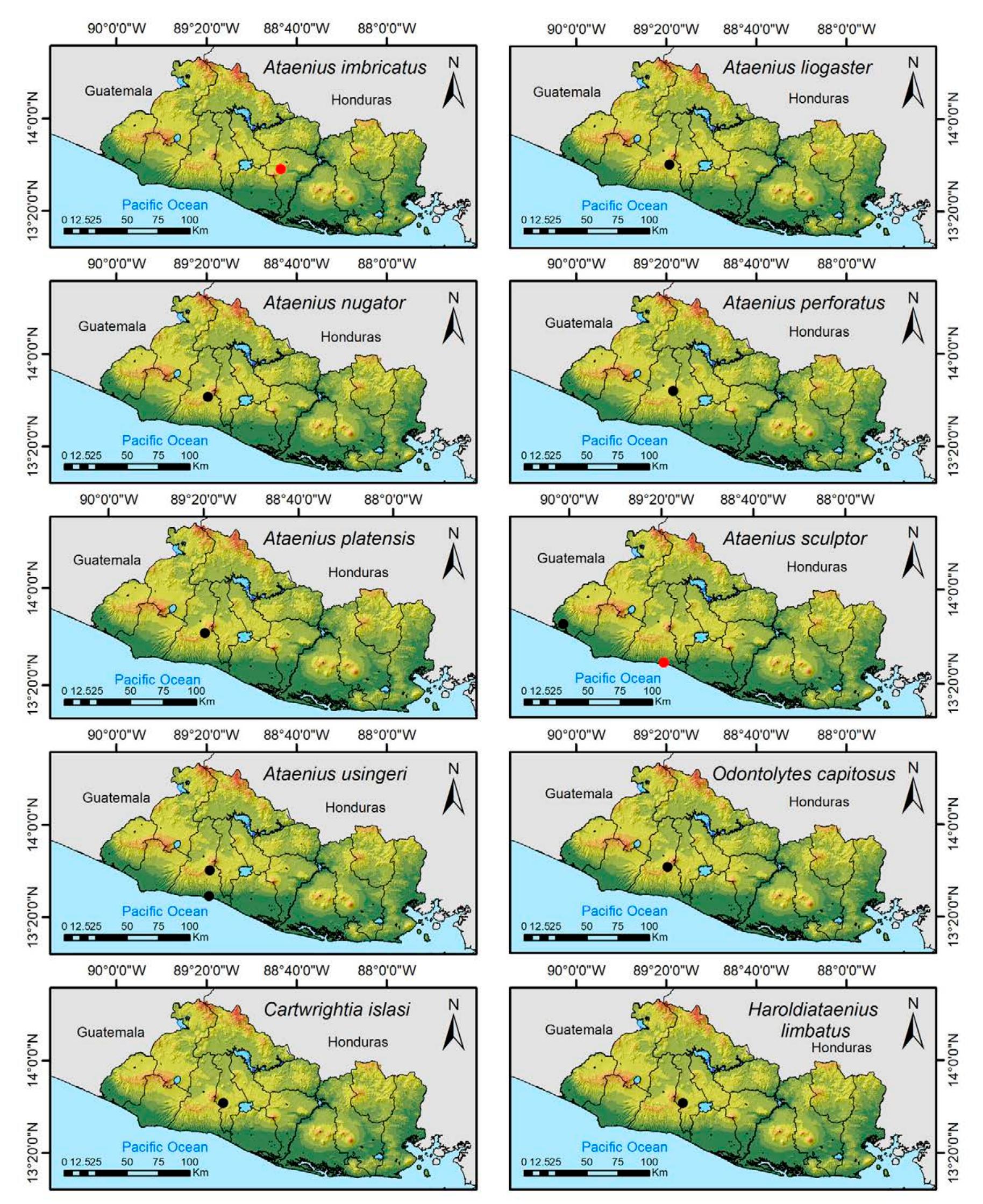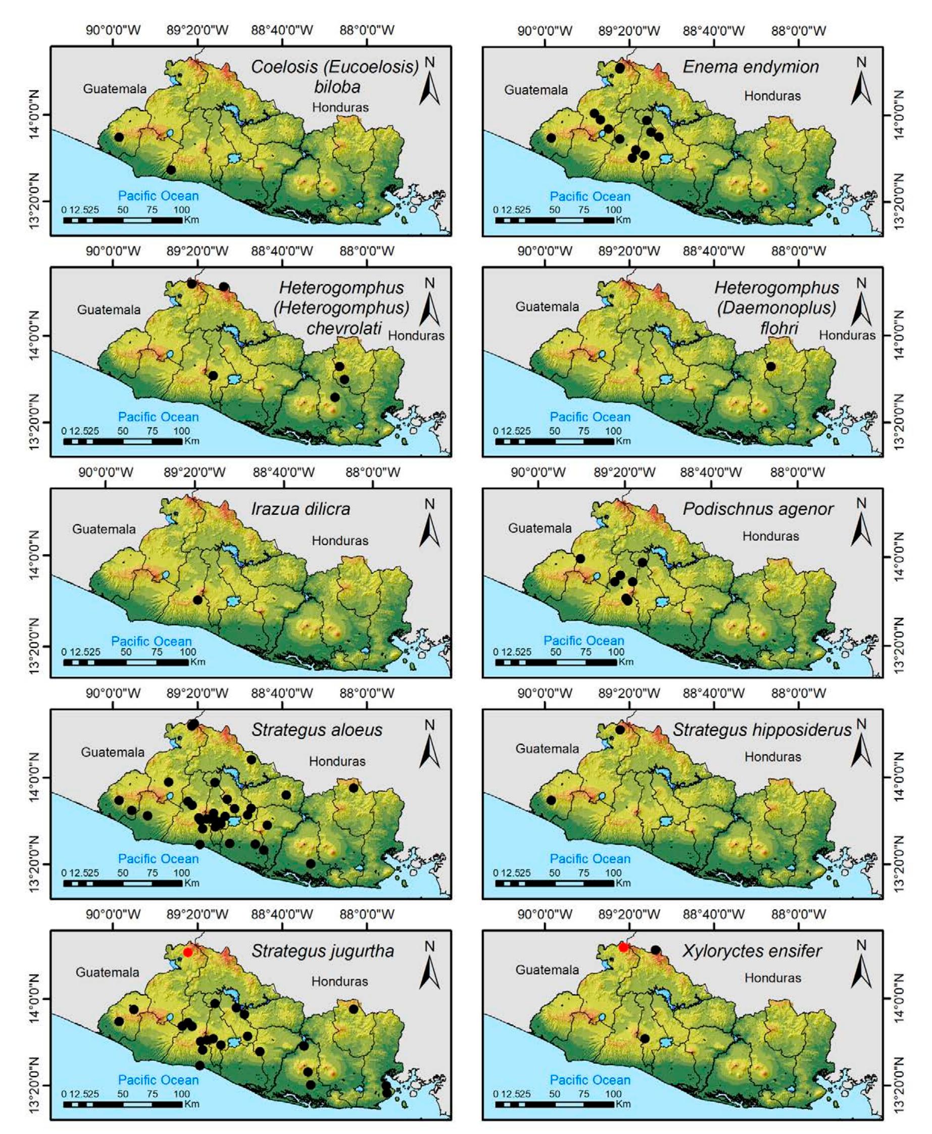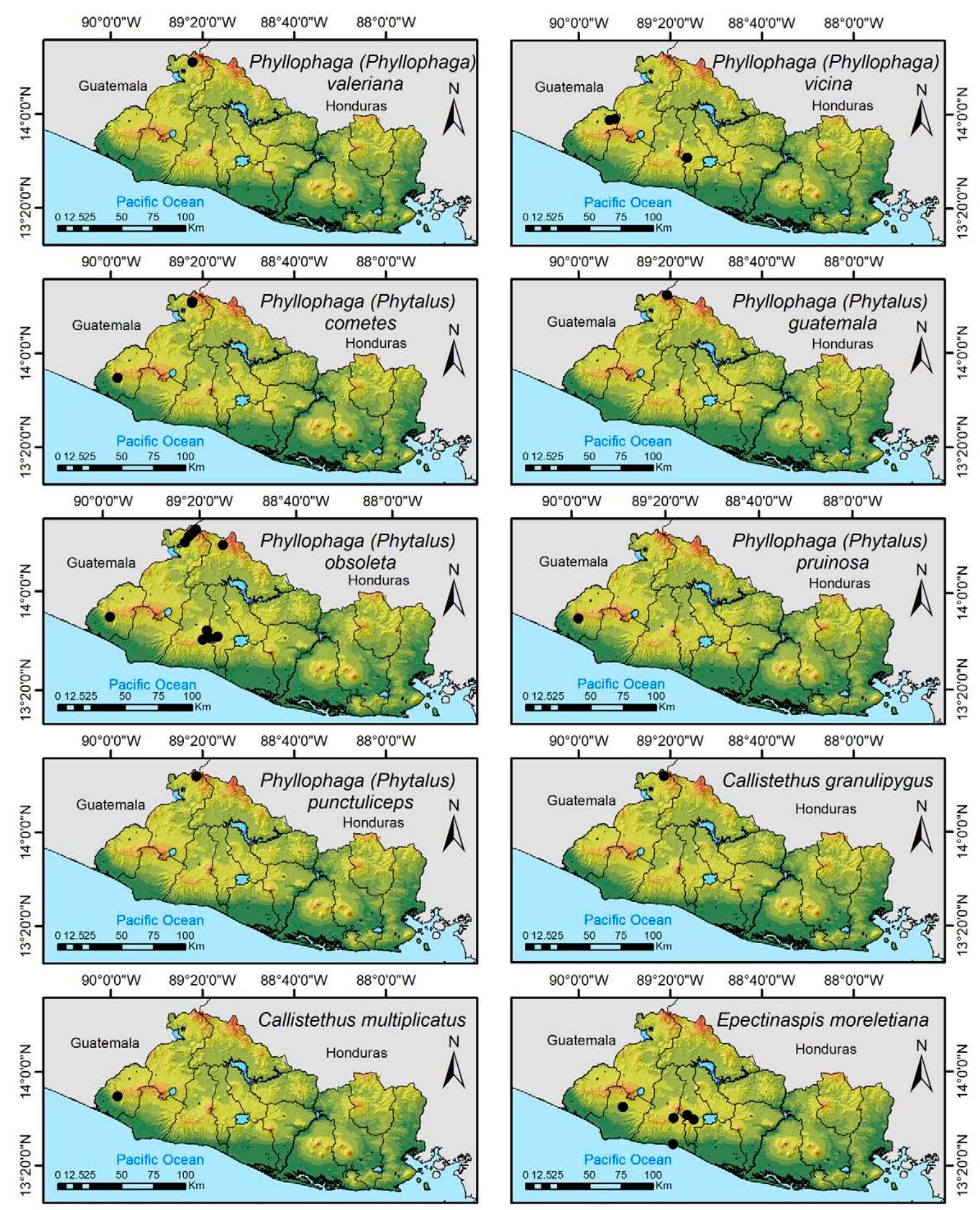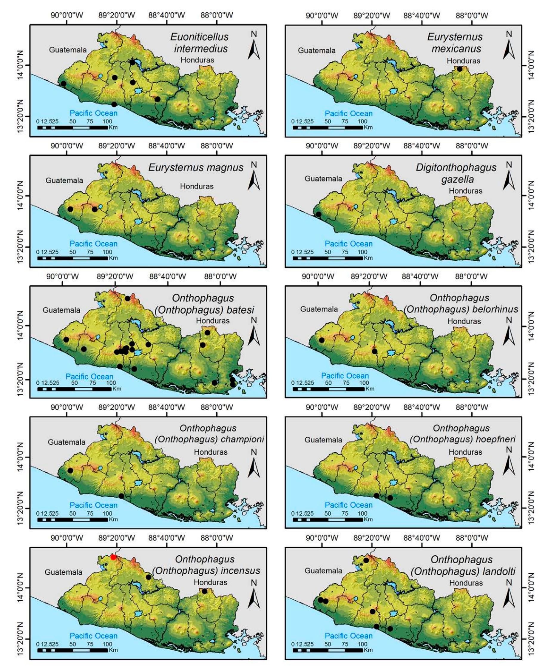 Less than 1% of the literature on El Salvador's biodiversity is about terrestrial invertebrates, ... more Less than 1% of the literature on El Salvador's biodiversity is about terrestrial invertebrates, which limits our knowledge of this group's diversity, richness, and distribution in the territory. Scarabaeoidea are megadiverse in multiple ecosystems and perform many functions. This work aims to catalog the Scarabaeoidea in El Salvador. We conducted an exhaustive review of published literature and reviewed numerous entomological collections with relevant material. Maps were constructed to visualize the known distribution of each species in the country. There are 295 scarab beetle species (including 19 new country records) representing 106 genera in 7 families in El Salvador. Six precinctive species are known. Twenty-two species are discarded as occurring in El Salvador, either because they are not valid species or because of misidentifications or dubious records. This work is the first approach to knowing the 420 species and 132 genera of Chrysomelidae, and Pablo-Cea et al. (2021) recorded 96 especies in 38 genera of Staphylinidae. Both families are important for their diverse feeding habits and behaviors in a variety of ecosystems (