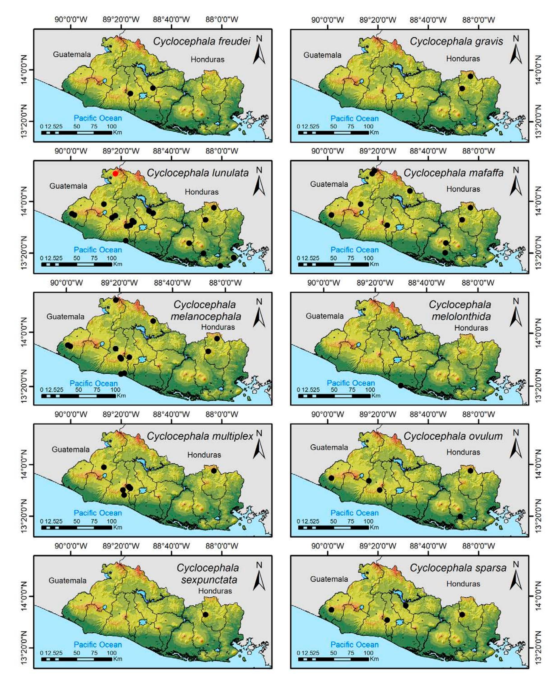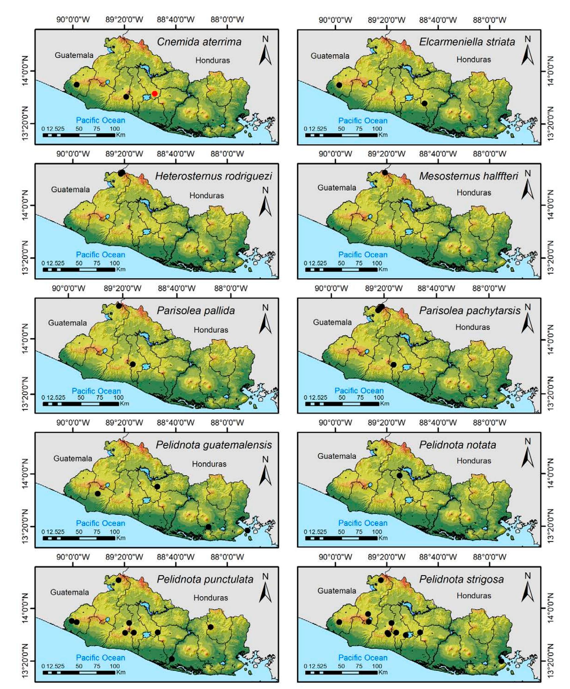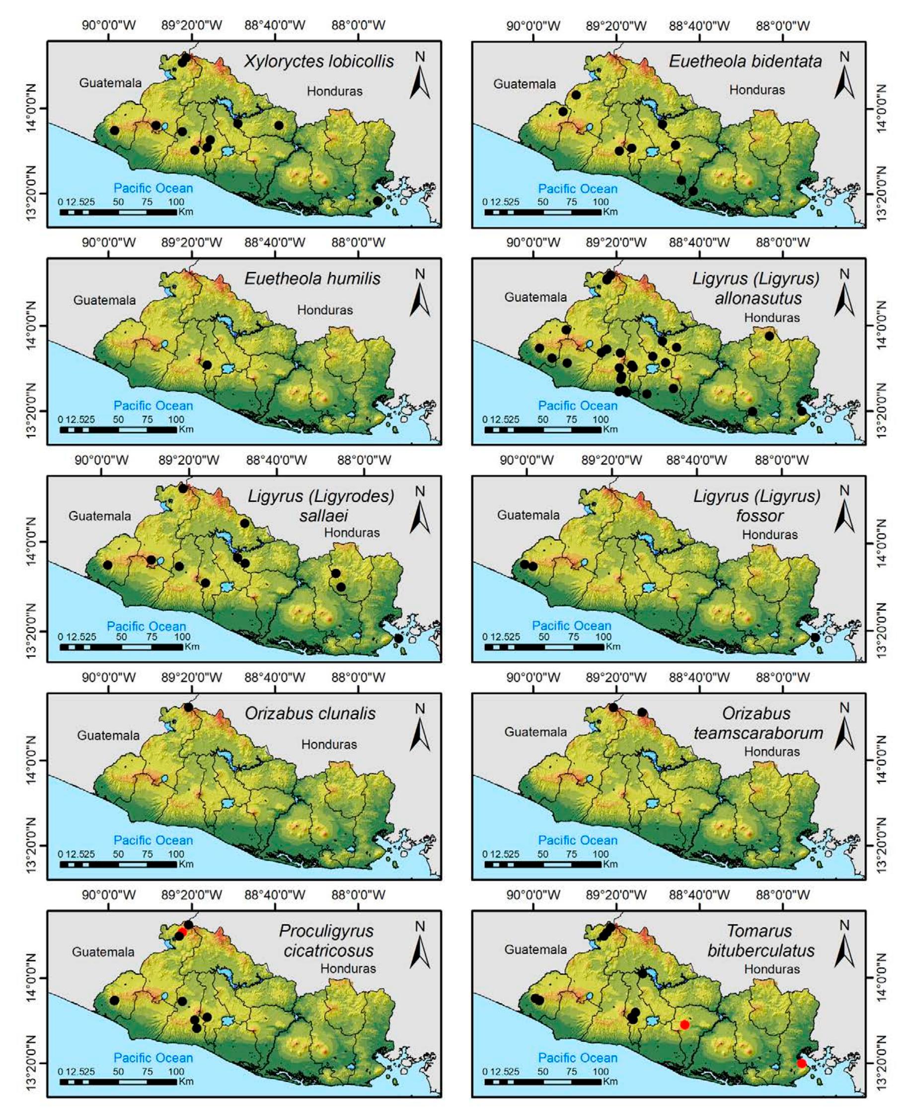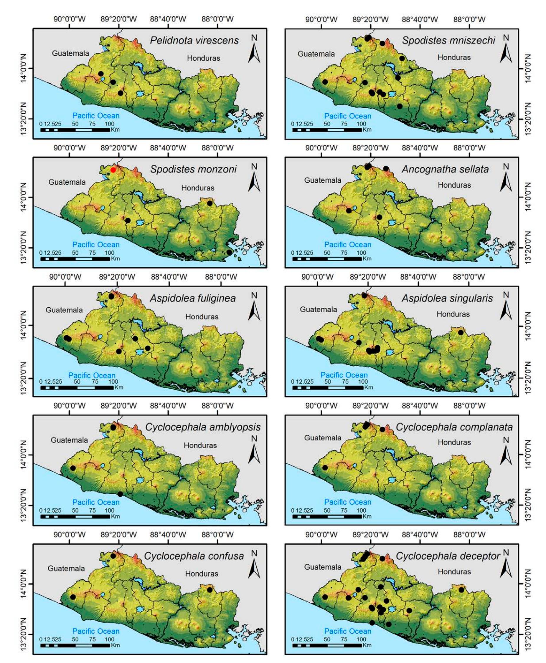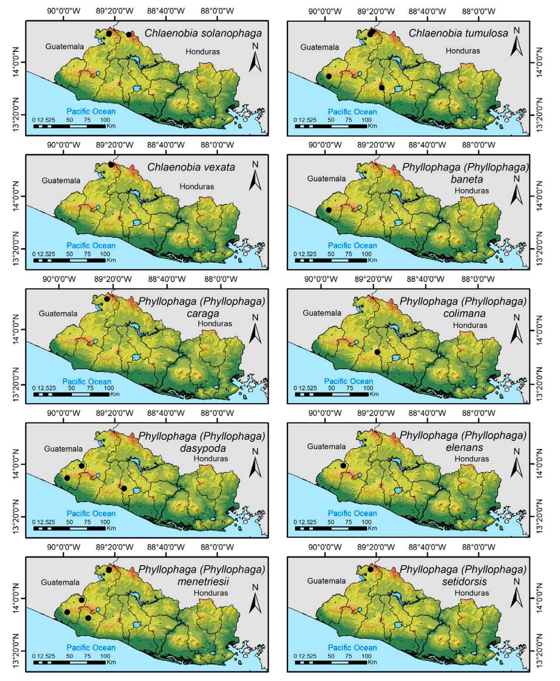 Less than 1% of the literature on El Salvador's biodiversity is about terrestrial invertebrates, ... more Less than 1% of the literature on El Salvador's biodiversity is about terrestrial invertebrates, which limits our knowledge of this group's diversity, richness, and distribution in the territory. Scarabaeoidea are megadiverse in multiple ecosystems and perform many functions. This work aims to catalog the Scarabaeoidea in El Salvador. We conducted an exhaustive review of published literature and reviewed numerous entomological collections with relevant material. Maps were constructed to visualize the known distribution of each species in the country. There are 295 scarab beetle species (including 19 new country records) representing 106 genera in 7 families in El Salvador. Six precinctive species are known. Twenty-two species are discarded as occurring in El Salvador, either because they are not valid species or because of misidentifications or dubious records. This work is the first approach to knowing the 420 species and 132 genera of Chrysomelidae, and Pablo-Cea et al. (2021) recorded 96 especies in 38 genera of Staphylinidae. Both families are important for their diverse feeding habits and behaviors in a variety of ecosystems (