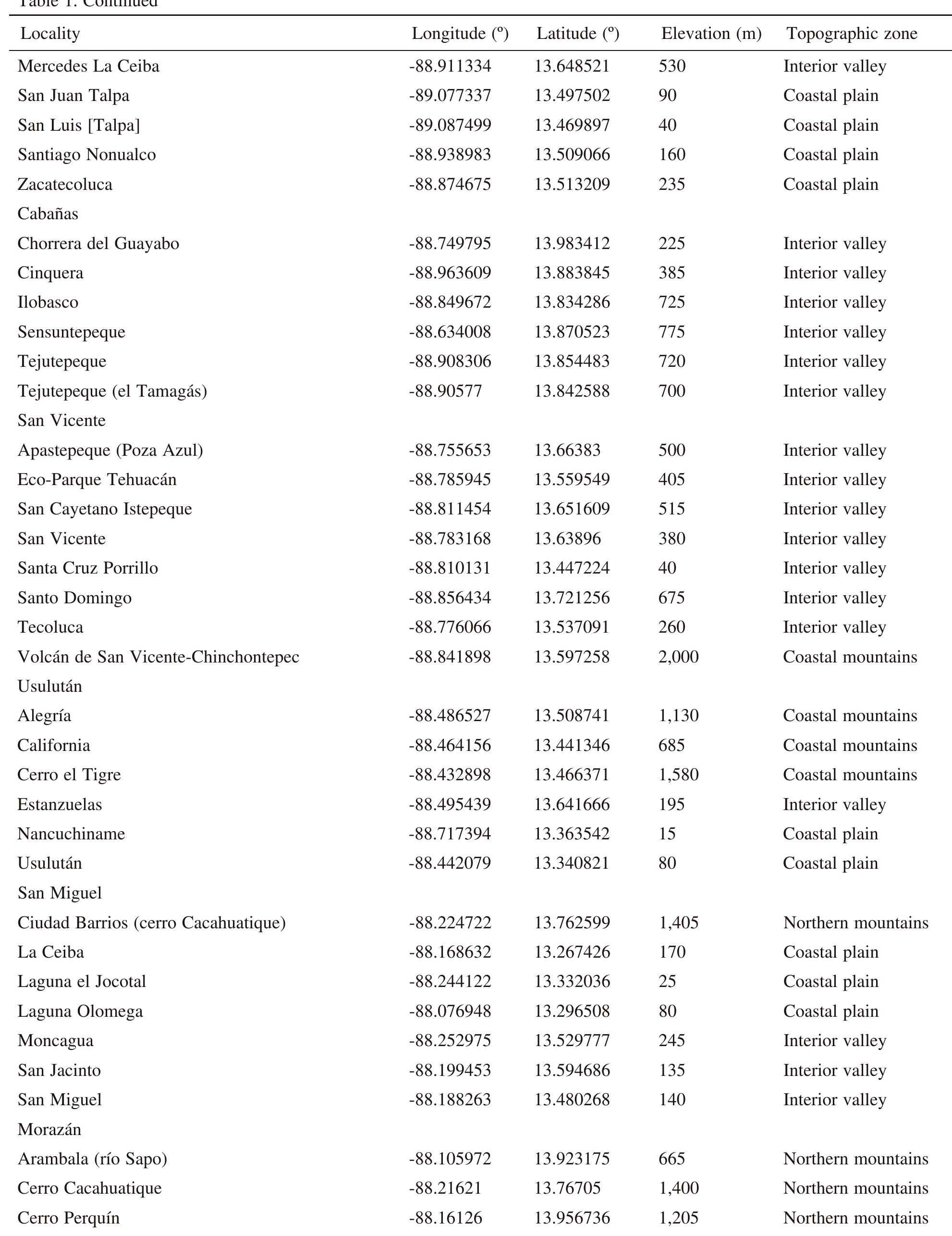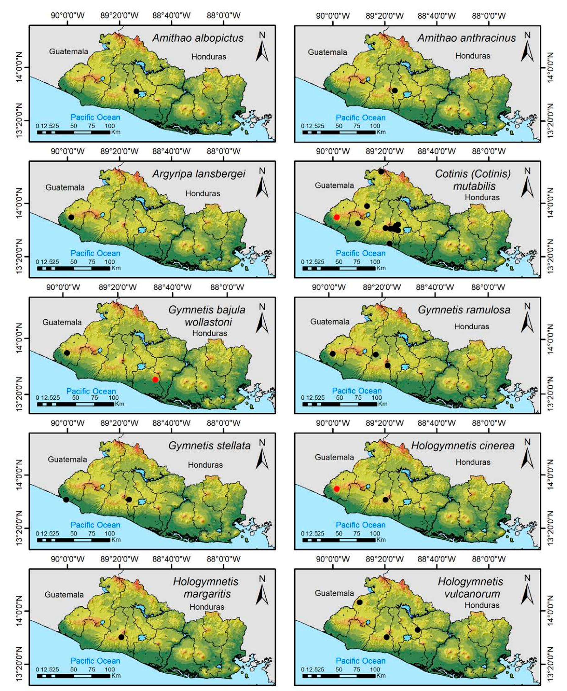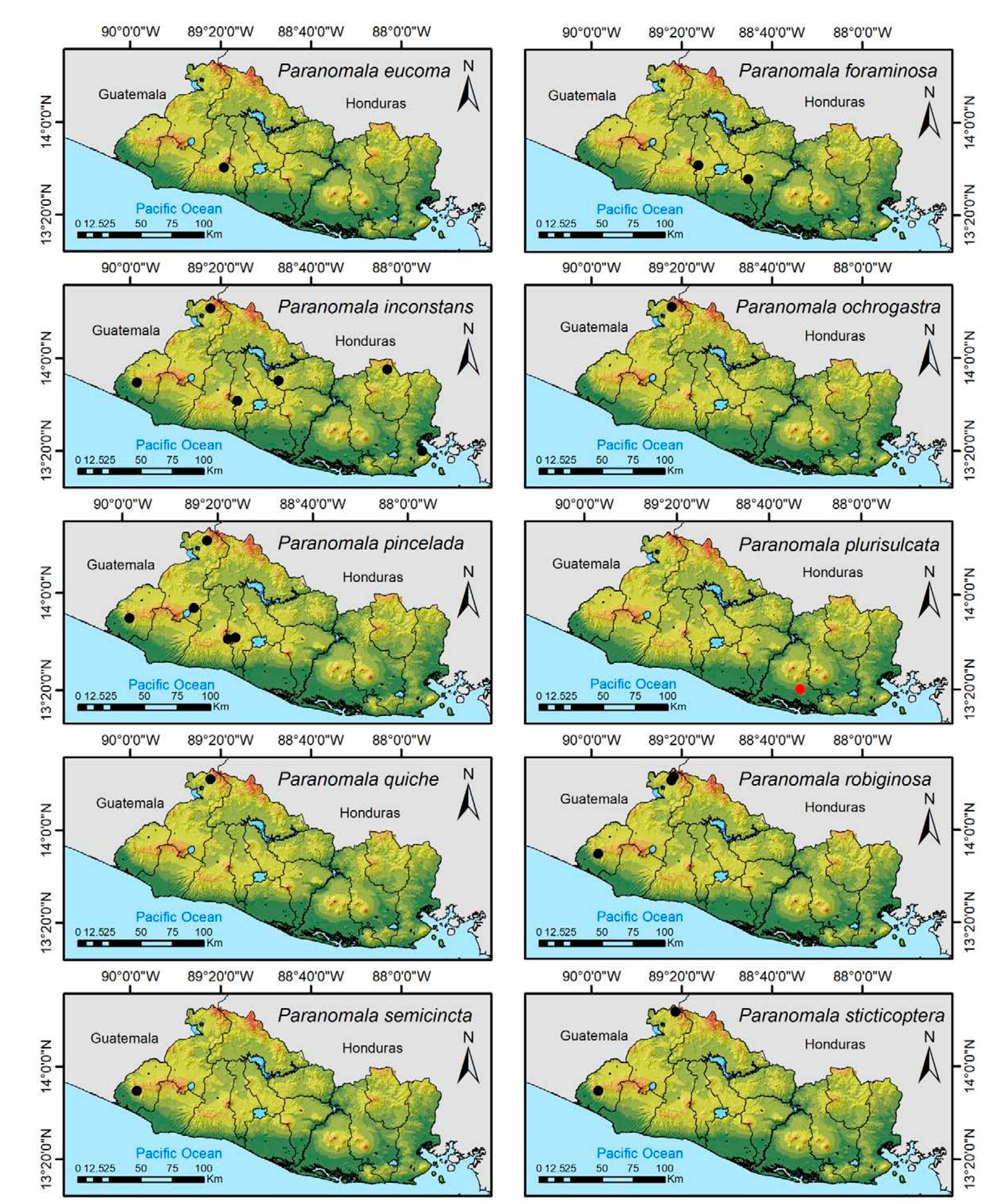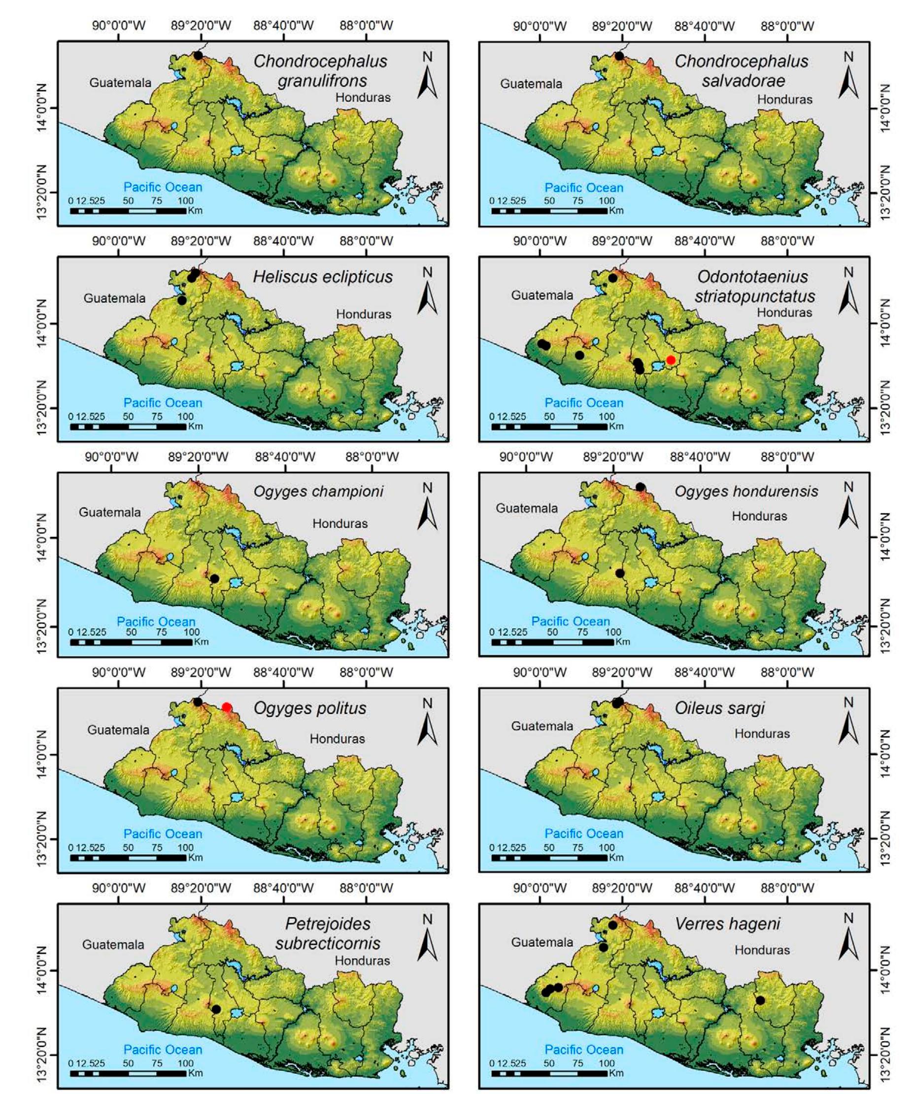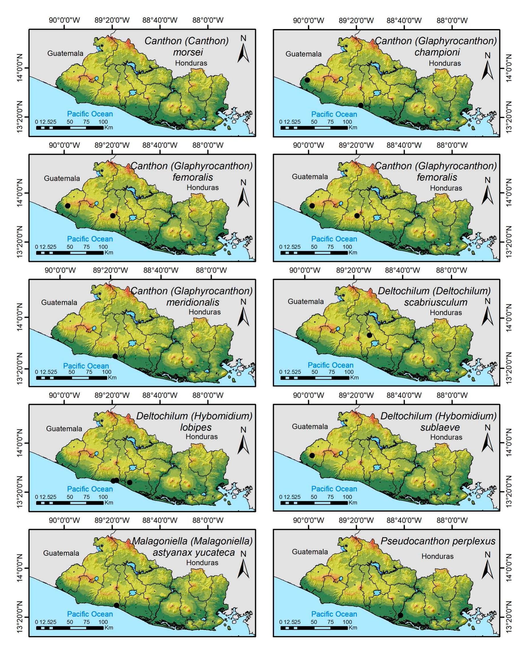 Less than 1% of the literature on El Salvador's biodiversity is about terrestrial invertebrates, ... more Less than 1% of the literature on El Salvador's biodiversity is about terrestrial invertebrates, which limits our knowledge of this group's diversity, richness, and distribution in the territory. Scarabaeoidea are megadiverse in multiple ecosystems and perform many functions. This work aims to catalog the Scarabaeoidea in El Salvador. We conducted an exhaustive review of published literature and reviewed numerous entomological collections with relevant material. Maps were constructed to visualize the known distribution of each species in the country. There are 295 scarab beetle species (including 19 new country records) representing 106 genera in 7 families in El Salvador. Six precinctive species are known. Twenty-two species are discarded as occurring in El Salvador, either because they are not valid species or because of misidentifications or dubious records. This work is the first approach to knowing the 420 species and 132 genera of Chrysomelidae, and Pablo-Cea et al. (2021) recorded 96 especies in 38 genera of Staphylinidae. Both families are important for their diverse feeding habits and behaviors in a variety of ecosystems (