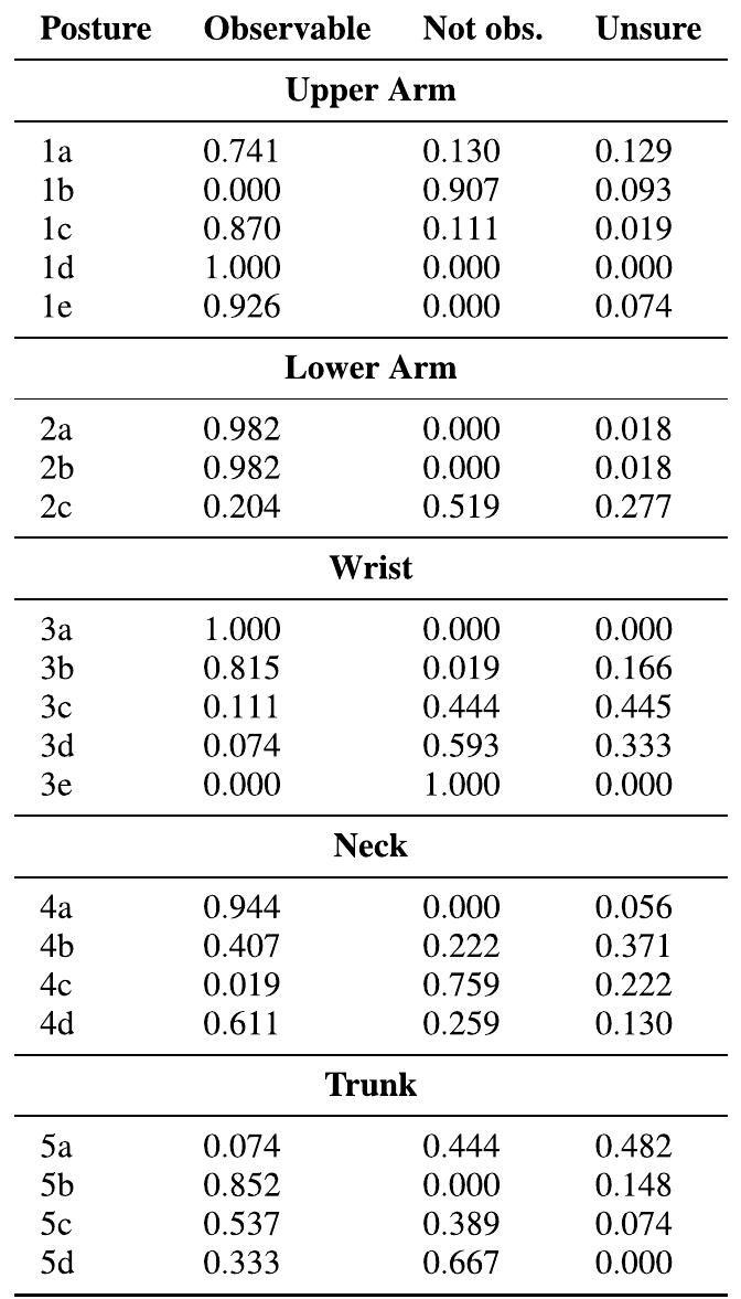 In this paper we evaluate a system based on the Microsoft Kinect TM sensor, aimed at the automati... more In this paper we evaluate a system based on the Microsoft Kinect TM sensor, aimed at the automatic detection of risk postures during human work activities. We first introduce a pick and place task, where three different lateral standing subjects move light cardboard boxes from the various levels of a bookcase to its top, and then putting them back to their original places. They repeat the task over several work cycles and we capture all their natural movements in a continuous way using Kinect, storing the joint positions and the color images. Secondly, from the joint positions, our system detects specific risk postures following the definitions of the Rapid Upper Limb Assessment (RULA) method. Finally, we compare the posture detections by our system with the baseline detections made by a panel of five experts who used the captured color images. In our study we find that the experts have problems to distinguish among some RULA postures during a work cycle because of the narrow detection margin and the difficulty to perceive if a limb reached a certain position; which is particularly true for the cases of wrist and neck. This leads to a larger false positive rate and to a lower general accuracy, with our system detecting postures that experts do not. After applying a ±1 • of relaxation to our system, which in negligible for human perception, we are able to reach an accuracy of 0.93 in the comparison with the baseline. Our results show the suitability of Kinect for lateral risk posture detection in pick and place activities. INDEX TERMS Ergonomics, Kinect, RULA, workplace MSDs. I. INTRODUCTION Musculoskeletal disorders (MSDs) are injuries that affect human body movements or the musculoskeletal system (i.e., muscles, tendons, ligaments, nerves, discs, blood vessels, etc.), 1 whose symptoms include pain, discomfort, numbness and tingling in the affected area. MSDs are known to be the single largest category of nonfatal workplace injuries that can lead to temporary or permanent disability, and are responsible for almost 30% of all worker compensation costs. 2 In the U.S., it is estimated that companies in 2011 spent about The associate editor coordinating the review of this manuscript and approving it for publication was Kin Kee Chow.