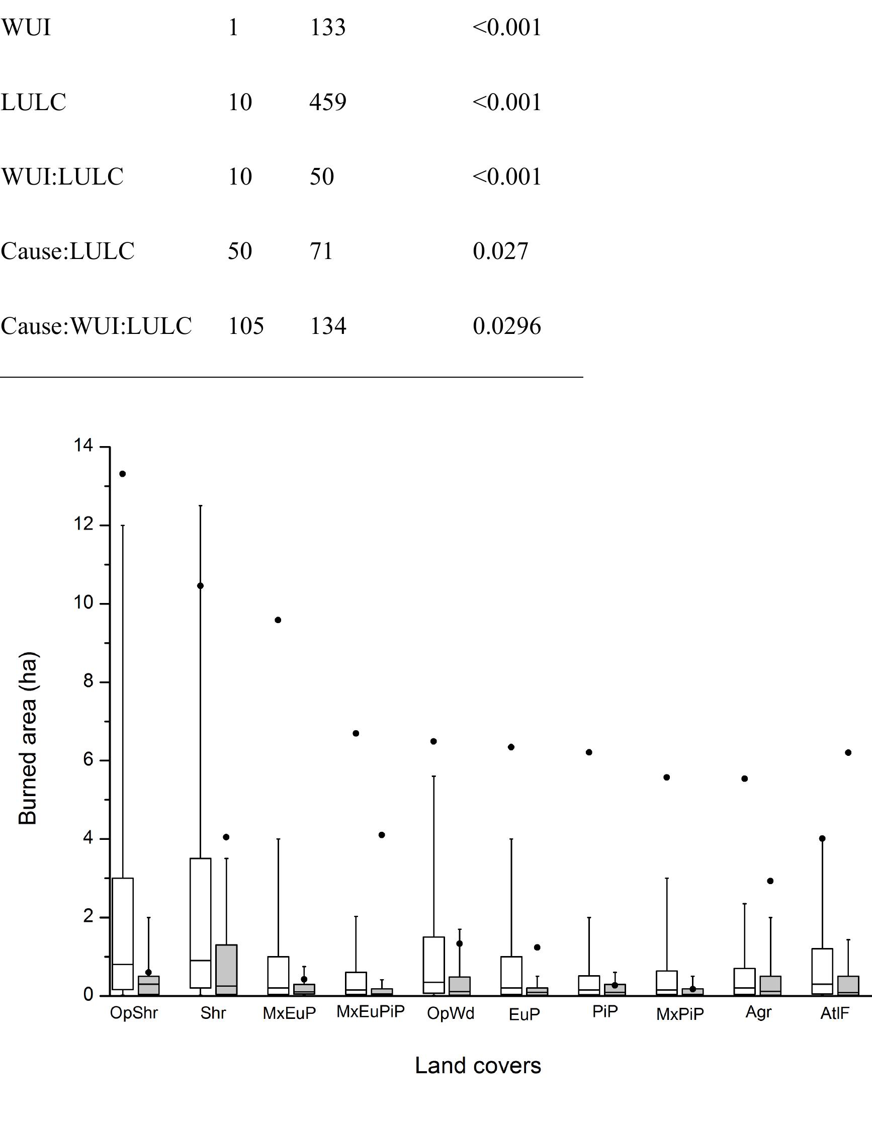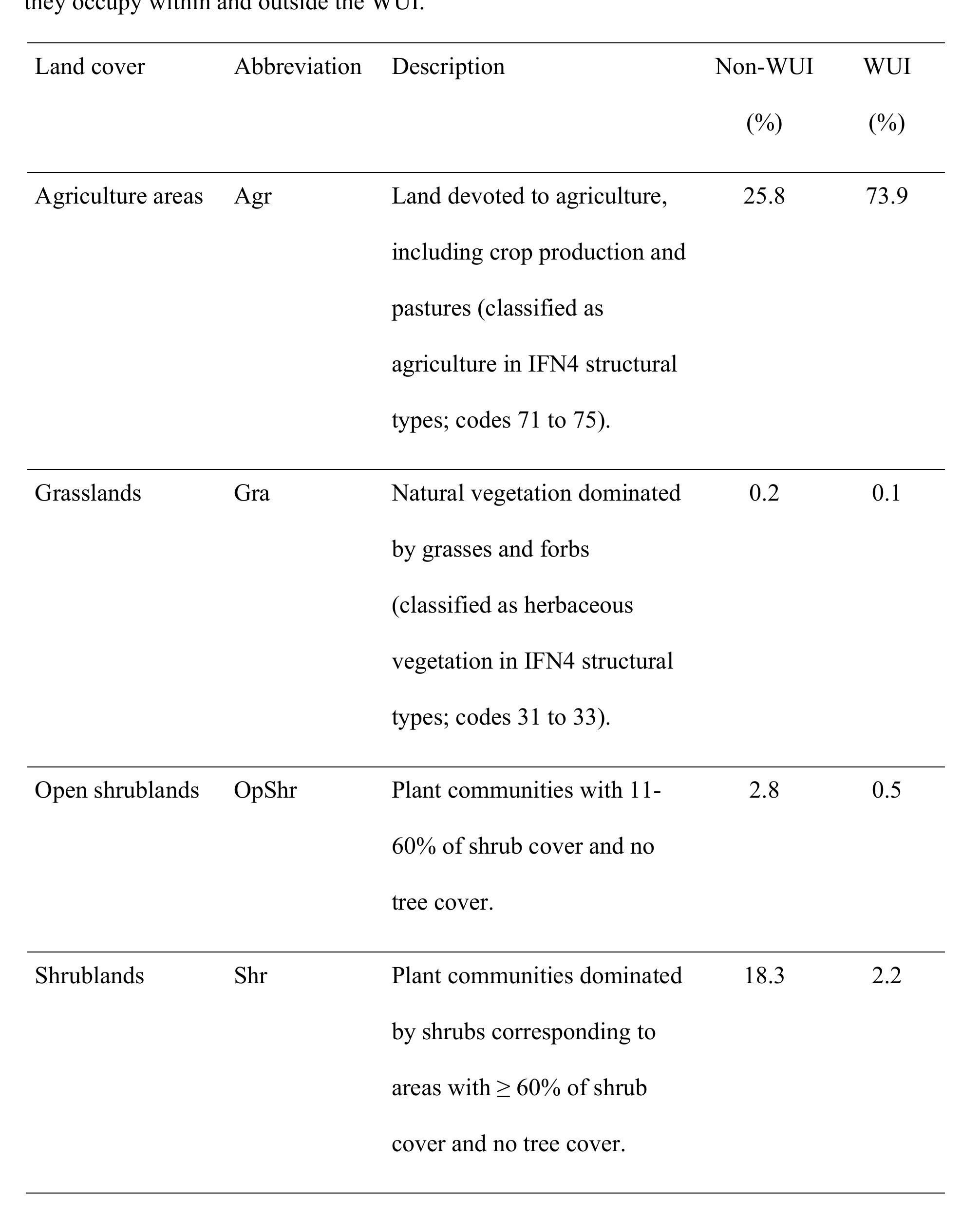 Wildland-urban interfaces (WUIs) are areas where urban settlements and wildland vegetation interm... more Wildland-urban interfaces (WUIs) are areas where urban settlements and wildland vegetation intermingle, making the interaction between human activities and wildlife especially intense. Their relevance is increasing worldwide as they are expanding and are associated with fire risk. The WUI may affect the fire risk associated with the type of vegetation (land cover/land use; LULC), a well-known risk factor, due to differences in the type and intensity of human activities in different LULCs within and outside WUIs. No previous studies analyze this interaction between the effects of the WUI and the LULC, despite its importance for understanding the patterns of fire risk, an essential prerequisite to undertake management decisions that can influence fire regimes. The aim of this study is to assess the effect of the WUI on fire ignition risk and the area burned, and the interaction between its effect and that of the LULC. We used a database of 26,838 wildfires recorded in 2006-2011 in NW Spain and compared fire patterns in relation to WUI and LULC with a random model, using a Montecarlo approach. There was a clear effect of the WUI on the risk of both fire ignition and spread (higher ignition risk but lower risk of spread in WUIs). The risk of fire was also affected by LULC and, interestingly, the pattern among LULCs differed between WUI and non-WUI areas. This interaction WUI x LULC was particularly important for forestry plantations, which showed the highest increase in ignition risk in WUI compared to non-WUI areas. Native forests and agricultural areas had the lowest ignition risk. Agricultural areas showed the smallest difference in fire size between WUI and non-WUI areas, while shrublands showed much larger fires outside WUIs. Deliberate fires were larger in general than those with other causes, especially outside the WUI. The differences found between LULCs in fire risk, both in WUI and non-WUI areas, have interesting implications for fire management. Promotion of land covers with low fire risk 3 should be considered as a low cost alternative to the usual fire prevention measures based on fuel load reduction, which require the continuous clearing of vegetation. In this regard, the low fire risk in native forests should be taken into account. Native forests naturally colonize many areas in the study region and require low or no management, in contrast with agricultural areas, also with low fire risk but requiring continuous management in order to avoid colonization by natural vegetation.