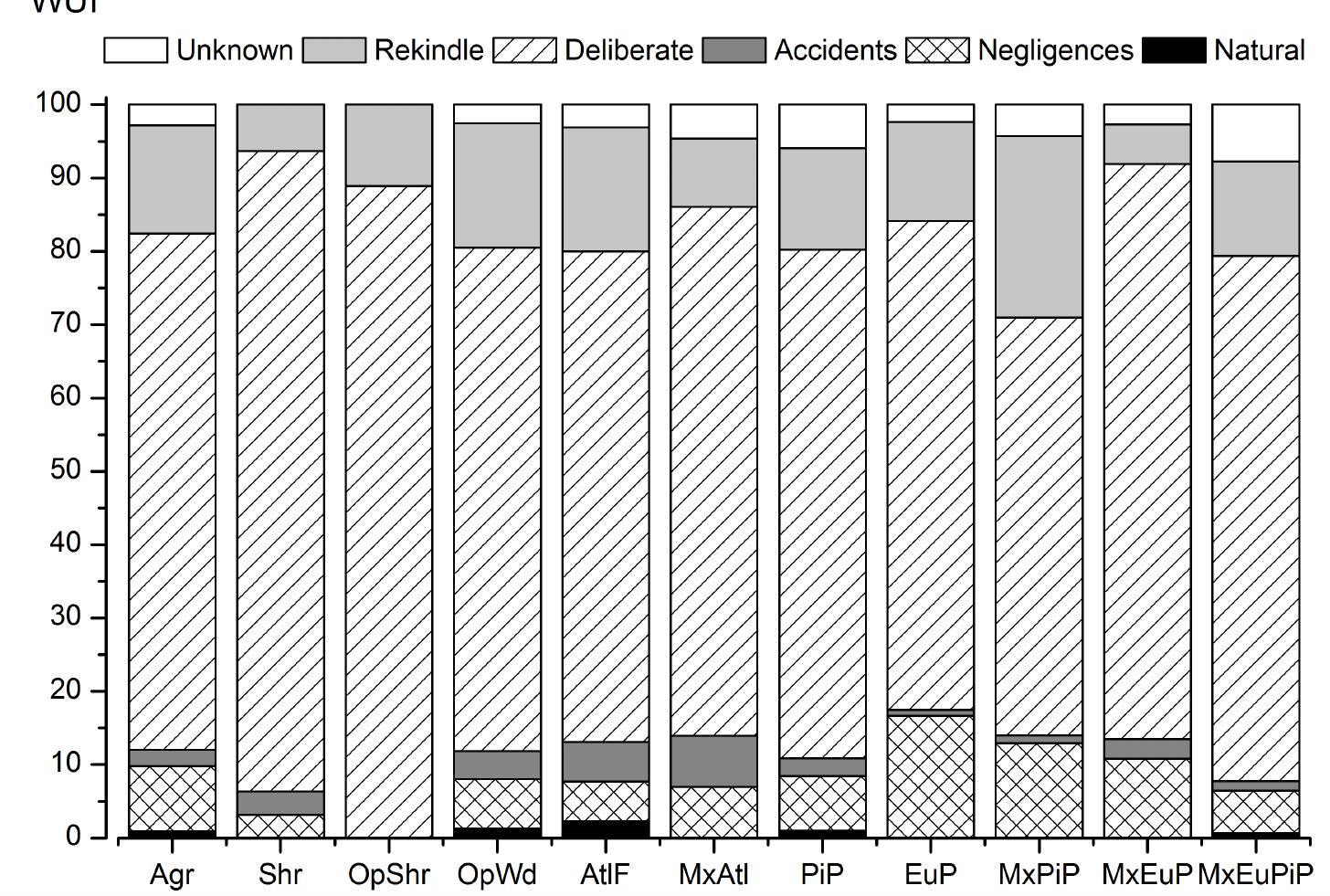 Effective fire prevention requires a better understanding of the patterns and causes of fire igni... more Effective fire prevention requires a better understanding of the patterns and causes of fire ignition. In this study, we focus on the interacting factors known to influence fire ignition risk, such as the type of vegetation, topographical features and the wildlandurban interface (WUI; i.e. where urban development meet or intermingle with wildland). We also analyze the human activities and motivations related to fires and whether they differ depending on the type of vegetation and the location within/outside WUI. There were significant interactions between topography, type of vegetation and location within/outside WUI. The risk of ignition was in general higher at lower elevations, and this tendency was more marked in forested land covers (all plantations and open woodlands), with the noticeable exception of native forests. North-facing sites had lower fire ignition risk outside the WUI, especially in native forests, while southern aspects showed higher fire ignition risk, especially in open shrublands. However, this effect of the aspect was only significant outside WUI areas. In relation to causes, there were also interactions between human activities/motivations related to fires, the type of vegetation and the location within/outside WUI. All forestry plantations appeared clustered in relation to fire causes, especially in the WUI, with high incidence of deliberately caused fires related to violent or mentally ill people and rekindle fires. In contrast, native forests, despite structural similarities with forestry plantations, showed more similarity with agricultural areas and open woodlands in relation to fire causes. In shrublands, there was a relatively high incidence of fires related to ranching, especially outside the WUI. This pattern of interactions depicts a complex scenario in relation to fire ignition risk and prompts to the importance of taking this complexity into account in order to adjust fire management measures for improved effectiveness.
