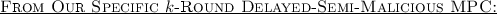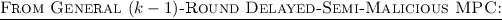 We first show a new compilation that turns any \((k-1)\)-round MPC protocol for computing f satisfying a stronger variant of semi-malicious security, called delayed-semi-malicious security, into a k-round malicious MPC protocol for f, assuming only one-way functions, for any \(k \ge 5\). Roughly speaking, a delayed-semi-malicious party \(P_j\) acts like a semi-malicious party, except that, it only “explains” all its messages once, before the last round (instead of explaining each of its messages after each round). This is formalized by letting \(P_j\) output a pair of input and random tape before the last round (on its special witness tape) which is required to be consistent with all \(P_j\)’s messages. We say that a protocol is delayed-semi-malicious secure if it is secure against such adversaries. (For technical reasons, we require the protocols to have a universal simulator.) We observe that our k-round semi-malicious MPC protocols, when instantiated with a k-round delayed-semi-malicious OT become secure against delayed semi-malicious attackers (and admit a universal simulator).