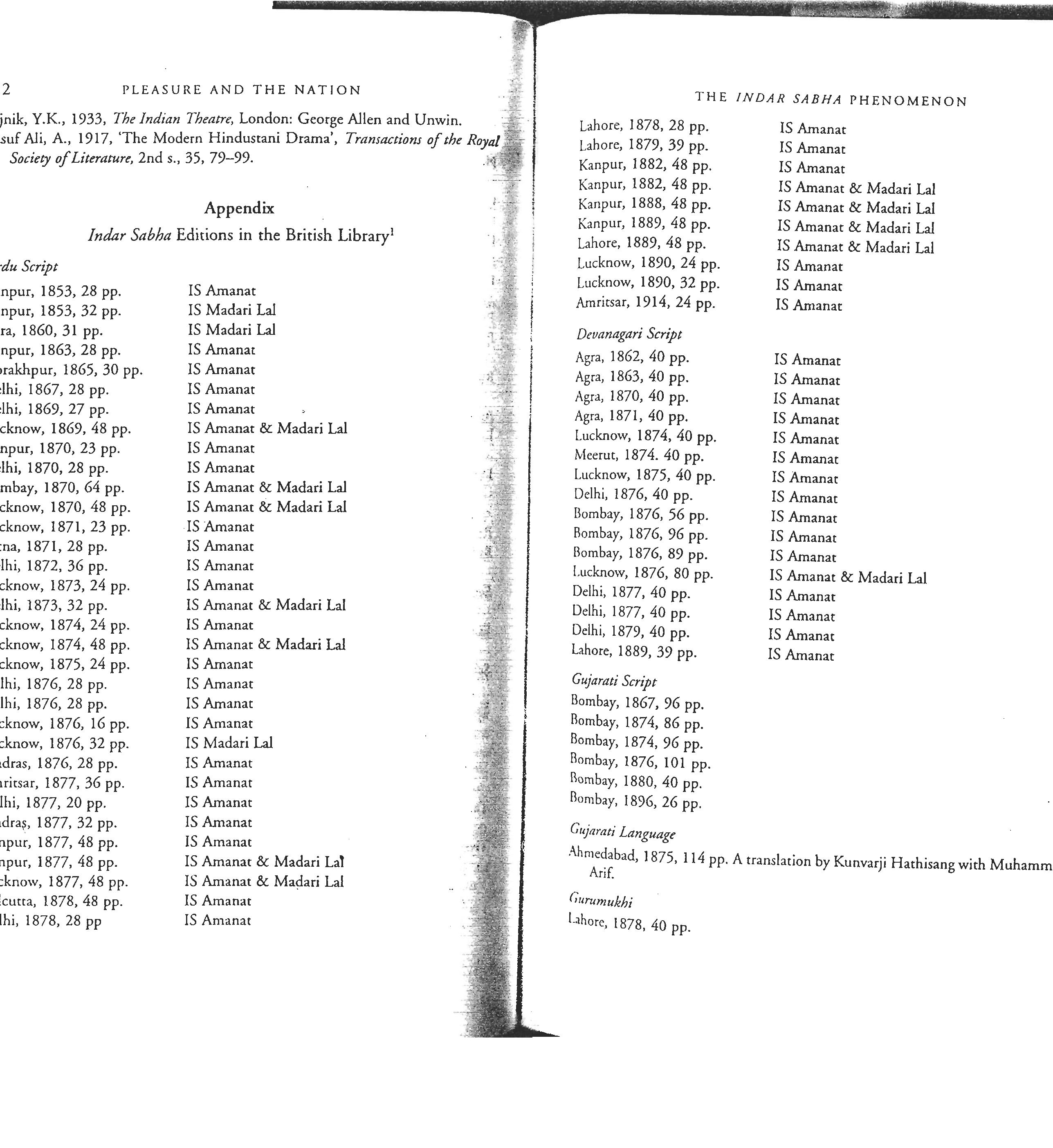 A close examination of the evidence in the parallel streams of Urdu, Gujarati, and Hindi scholars... more A close examination of the evidence in the parallel streams of Urdu, Gujarati, and Hindi scholarship is necessary to reveal the memories and amnesia, the voices and the silences, that have hitherto constituted knowledge about the Parsi theater. This essay proposes to unpack the communalized views of Parsis, Muslims, and Hindus writing in these three languages (as well as in English), while providing the researcher with a guide through the most frequently consulted Indian-language sources on the Parsi theater.