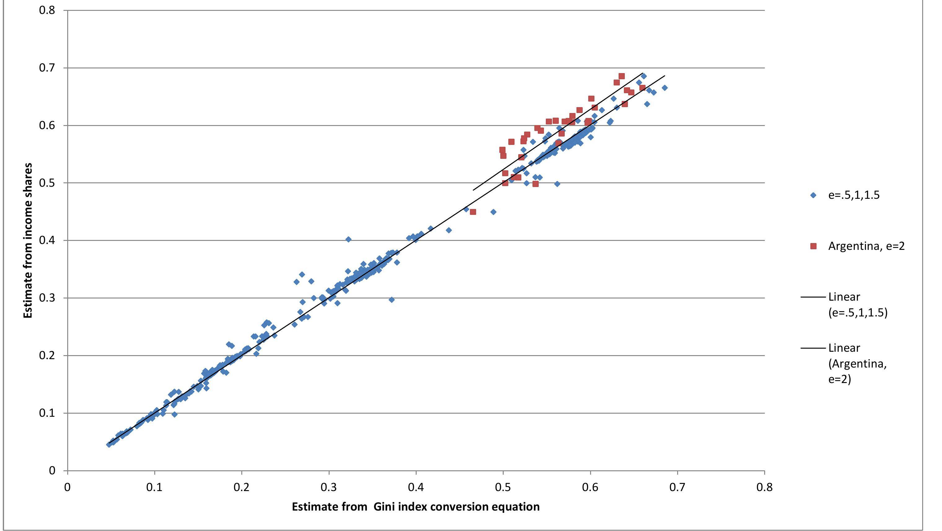 Estimating the Atkinson index typically requires the estimation of the complete income distributi... more Estimating the Atkinson index typically requires the estimation of the complete income distribution, and the selection of a suitable value for the inequality aversion or elasticity of marginal utility parameter (ε). The Index can also be calculated from the generalised entropy (GE) class of decomposable inequality indexes (GE) via a standard transformation, however in this case choice of (ε) is removed as this parameter is then dictated by the order of the GE index (α) via the relationship α=ε-1. Under a restrictive assumption of log-normality of the true distribution, absolute freedom is restored in the choice of ε and the Atkinson index for any ε can be readily computed from any GE indexes, including those of order 0 (The mean log deviation) or 1 (the Theil index).