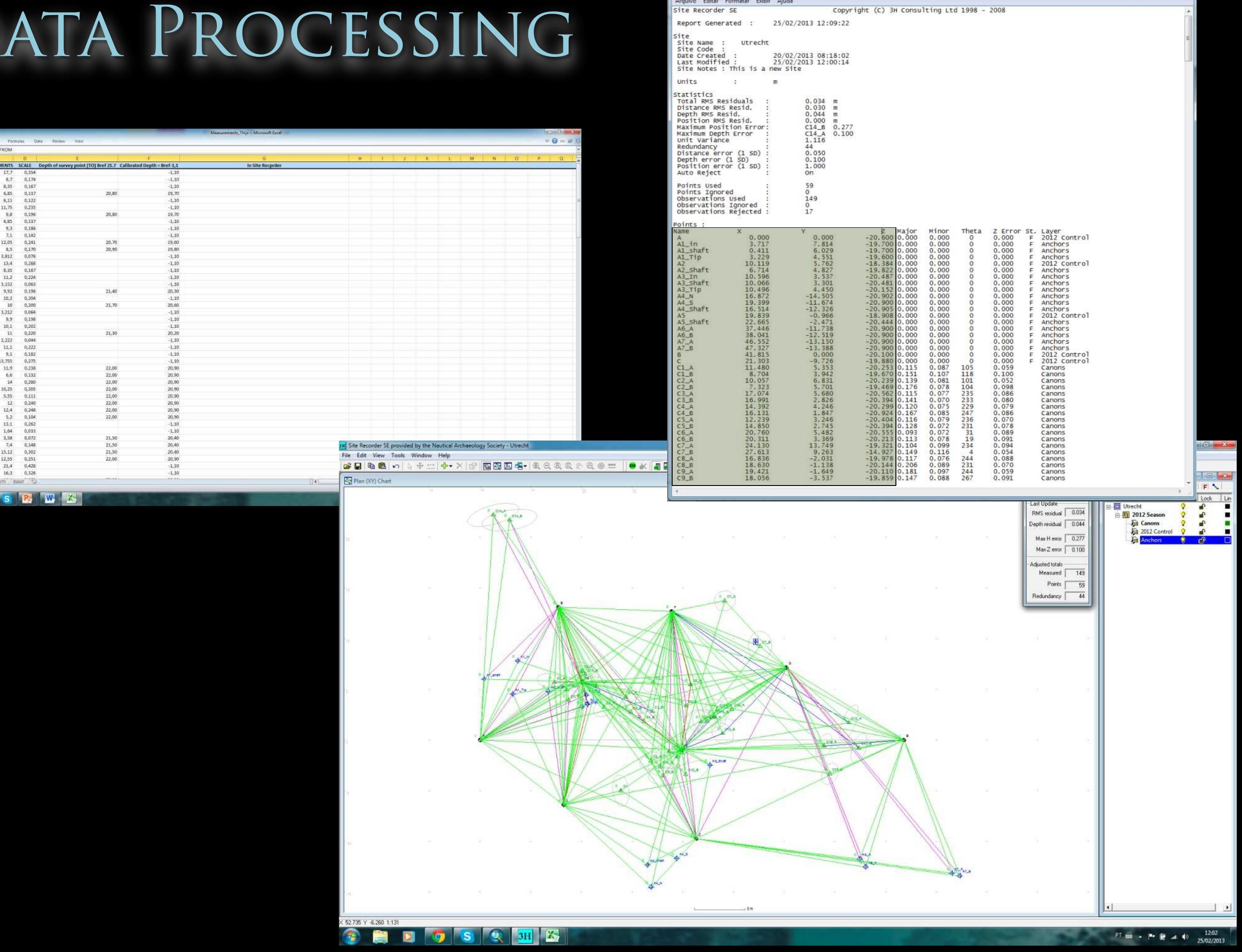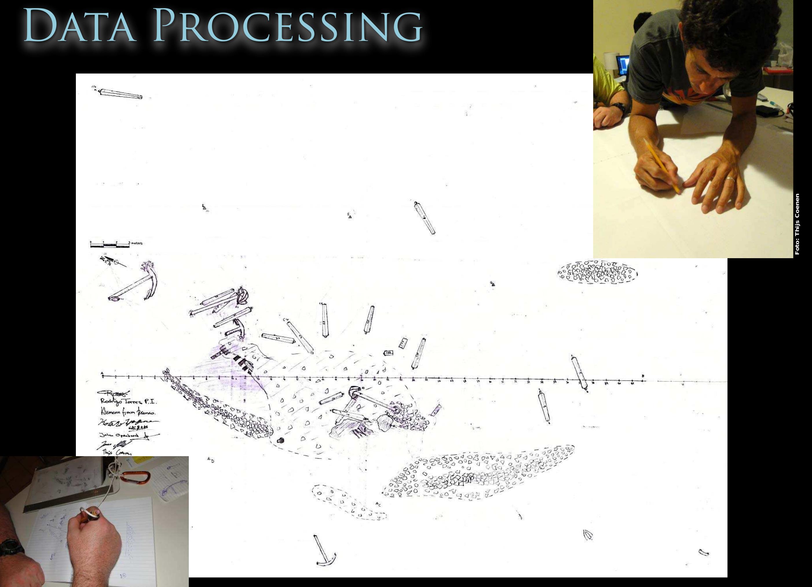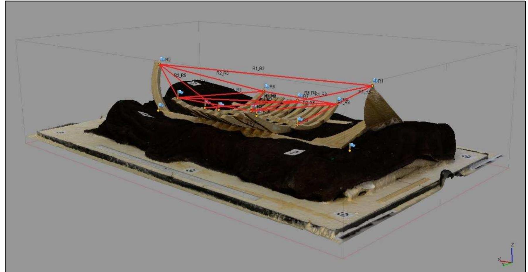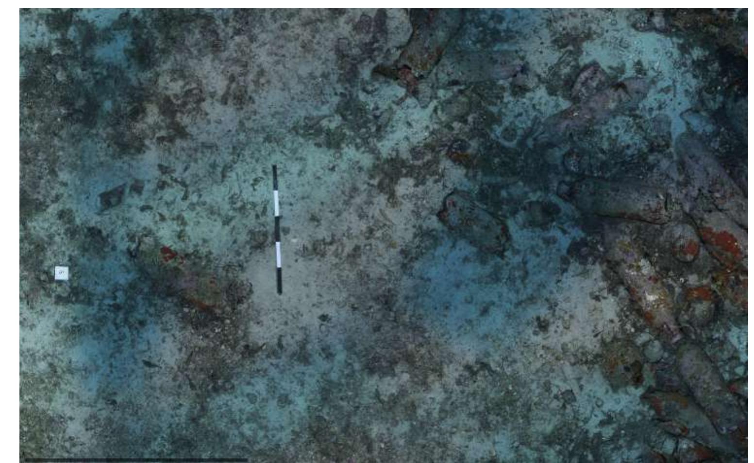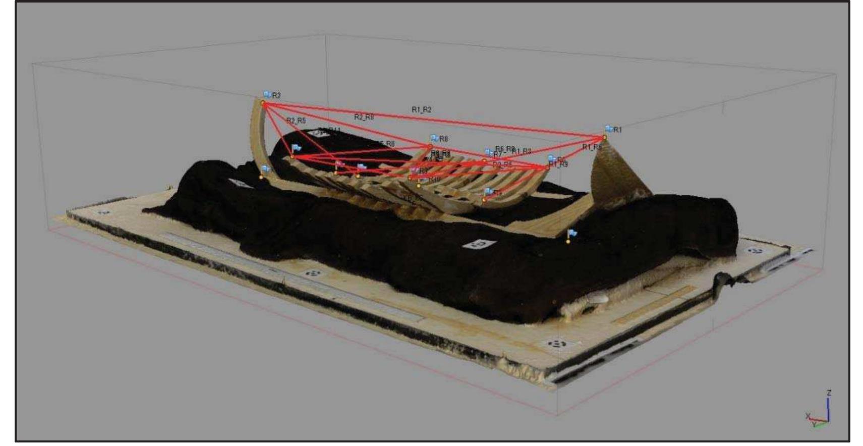 Along with manual recording by archaeologists, the team applied photogrammetric recording to Wreck 2 (Agisoft PhotoScan) under 50cm to 1.5m visibilities of water. The goal of this recording was to create an accurate 1:1 scale-constrained model to use as archaeological data. To create a 1:1 scale-constrained model, the team applied Direct Survey Methods (3H Site Recorder) and collected 107 measurements to establish a local coordinate system.