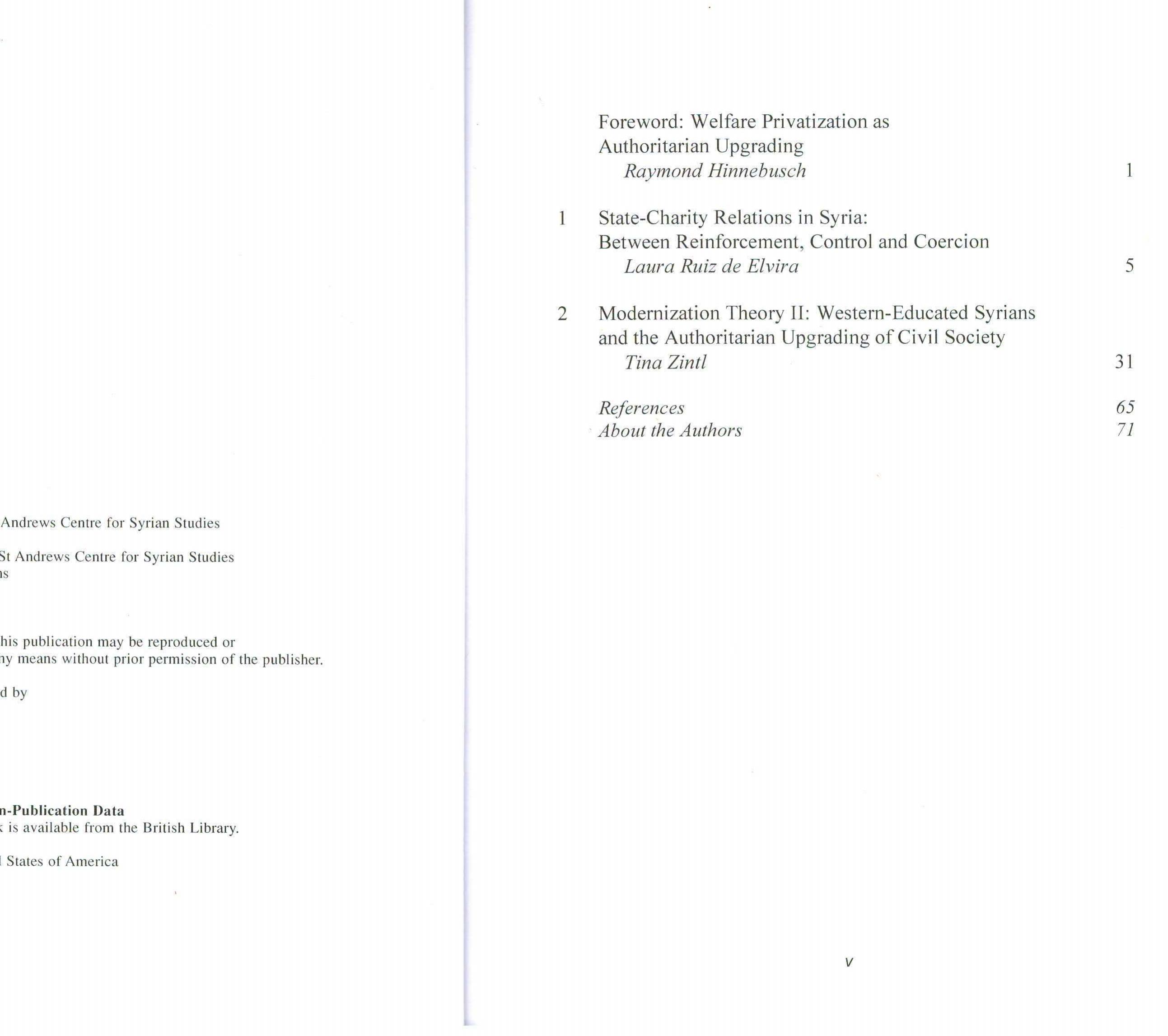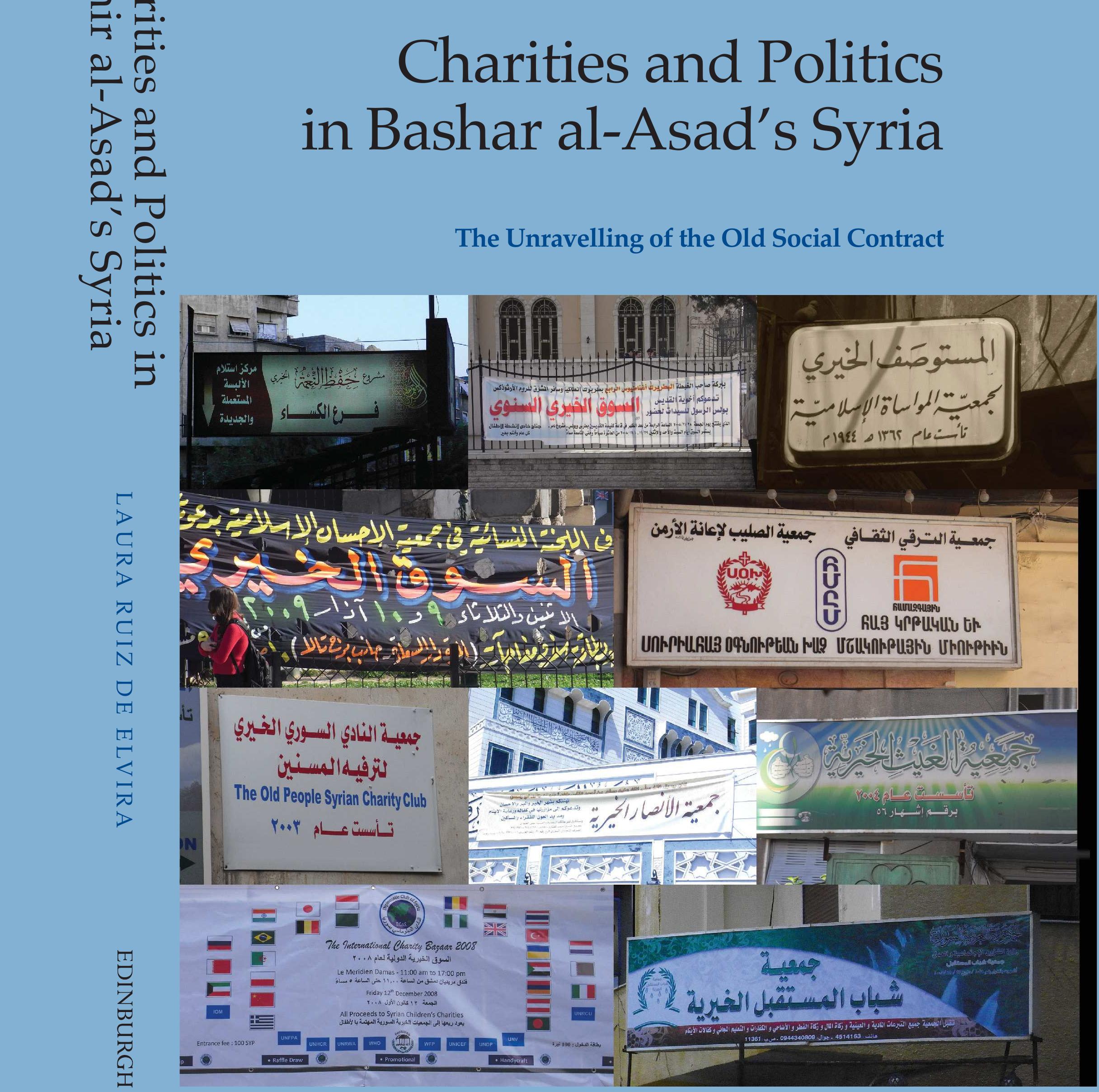 The book analyses the renewal and revival of the role of Syrian charities during Bashar al-Asad’s... more The book analyses the renewal and revival of the role of Syrian charities during Bashar al-Asad’s first ten years in power (2000-2010) in order to understand the political engineering deployed by the Syrian regime in the decade prior to the uprising. Based on extensive ethnographic fieldwork undertaken between 2007 and 2010, as well as on more than fifty interviews and other secondary sources, this book is the first comprehensive study of the country’s poorly known sector of associations and charitable organisations at the beginning of the 21st century. It provides first‐hand accounts of crucial issues that did not receive scholarly attention before the uprising – such as the shift in state–society relations, the opening of the civic arena, the partial outsourcing of welfare provision and social responsibilities and, eventually, the unravelling of the old social contract, which the protest movement dramatically brought to the forefront in 2011. By carrying out a unique analysis of the management of civil society by state institutions and the First Lady’s Governmental Operated – NGOs, it also provides keys to understanding both the resilience of Bashar al-Asad’s authoritarian regime in the 2000s and the simultaneous weakening of its credibility amongst the population.