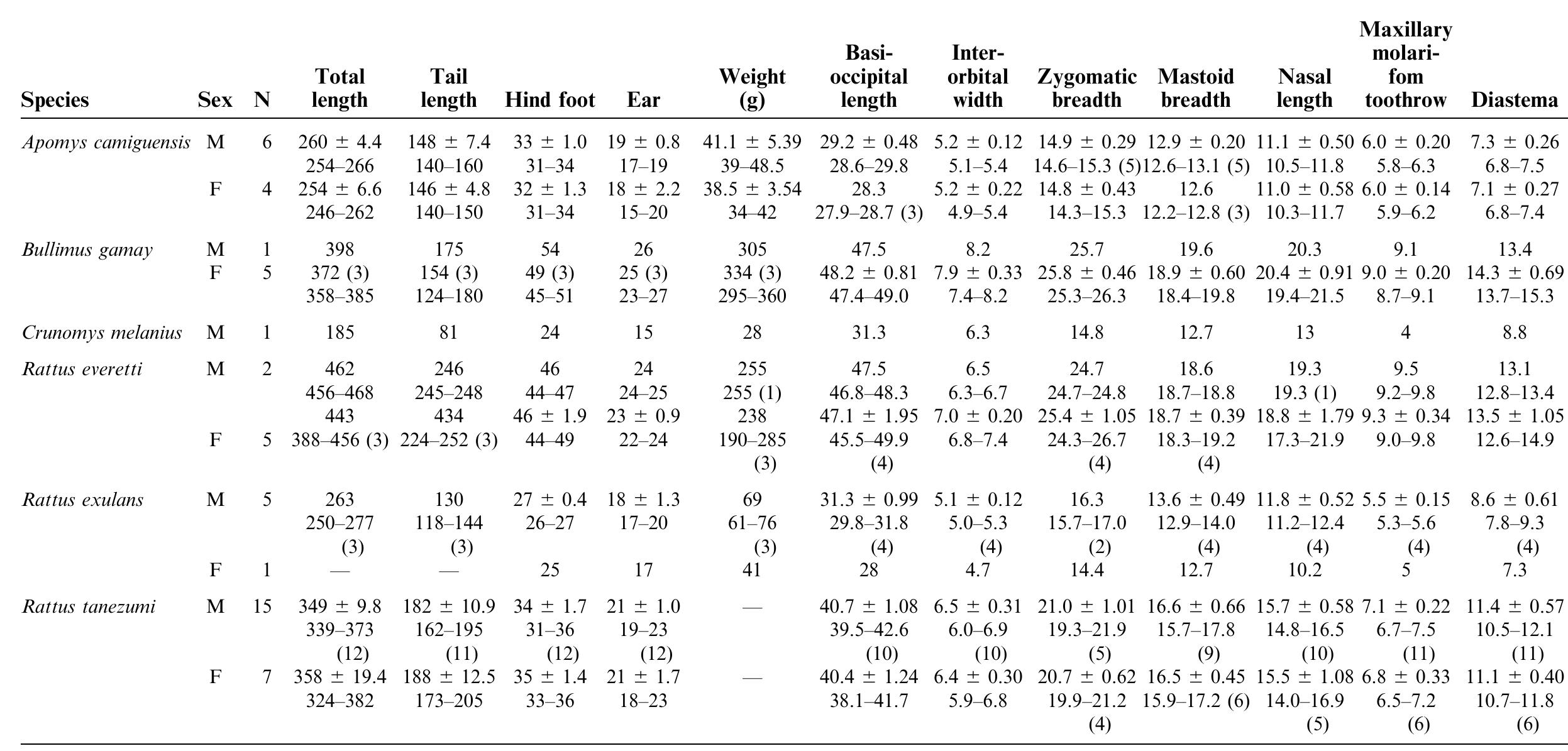 An inventory of the mammals of Camiguin Island conducted in 1994 and 1995 documented the presence... more An inventory of the mammals of Camiguin Island conducted in 1994 and 1995 documented the presence of a previously unknown species of Philippine forest mouse of the endemic Philippine genus Apomys, which is here named and described. Based on molecular data, the new species is most closely related to two species (A. hylocoetes and A. insignis) from Mindanao Island and to an unnamed species from Leyte, Biliran, and Bohol islands. The new species is diagnosed in comparison to its three closest relatives on the basis of slightly browner and less russet fur, slightly greater size overall, a moderately long and broad hind foot with small plantar pads, large tail scales, slightly narrower zygomatic width and mastoid breadth, deep rostrum of moderate length, a long orbit and braincase, narrow palate, large incisive foramina, short distance from the posterior edge of the incisive foramina to the anterior edge of the first upper molar, bony palate that extends well to the posterior of the posterior edge of the last upper molar, bullae that are more strongly oriented toward the cranial midline axis, third upper molar without a conspicuous anterolabial cusp, and a number of more subtle features. It is one of two species of mammals now known to be endemic to Camiguin, the other being Bullimus gamay (Rickart et al., 2002). Both are common in rain forest on Camiguin Island at upper elevations. The presence of two endemic mammals on this small (265 km 2) island is remarkable; there are no smaller islands in the Philippines known to support endemic mammal species.