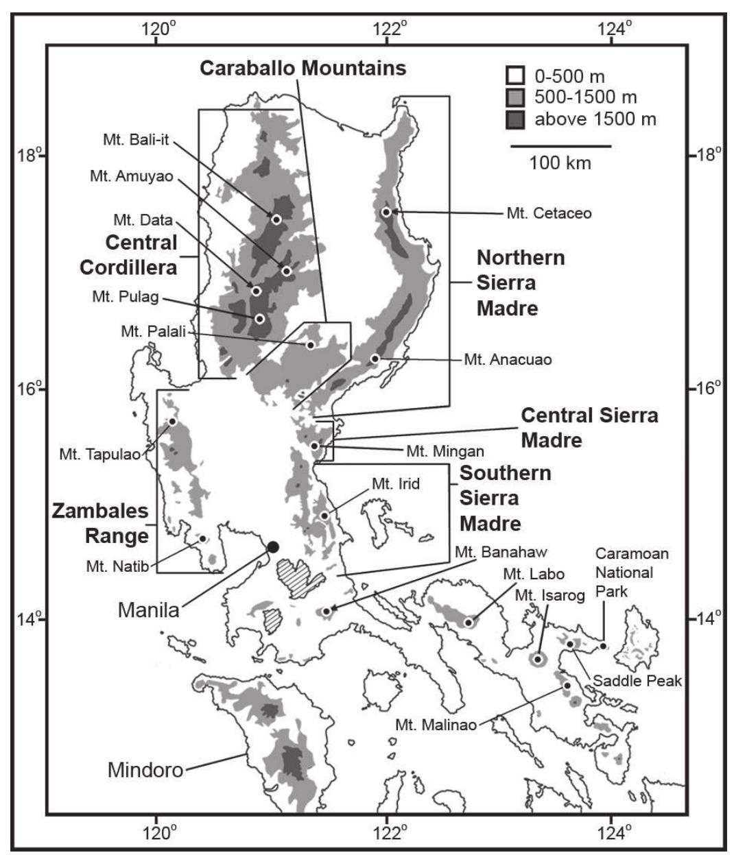 Field surveys of the mammal fauna of Mt. Natib, Bataan Province, conducted in 1996 and 2005 docum... more Field surveys of the mammal fauna of Mt. Natib, Bataan Province, conducted in 1996 and 2005 documented a total of 20 species including nine bats, five native non-volant small mammals, two non-native small mammals, and four native large mammals. Several additional species of bats and two additional large mammals that are known to occur elsewhere in southwestern Luzon also probably occur on Mt. Natib. One native species, Apomys zambalensis, is endemic to Mt. Natib and the nearby Zambales Mountains and was the most abundant small mammal present. Survey results for non-volant mammals were consistent with predicted diversity of native species for a mountain of relatively low elevation, and strengthened a general pattern of a positive correlation between local species richness and elevation on Luzon. The occurrence of non-native species was strongly associated with highly disturbed habitats. Native species occurred across a broad range of disturbance conditions and were numerically dominant over non-natives even in the most disturbed situations. Results suggest that the Natib mammal fauna is highly tolerant of anthropogenic disturbance, perhaps reflecting a legacy of coping with periods of severe volcanic disturbance.