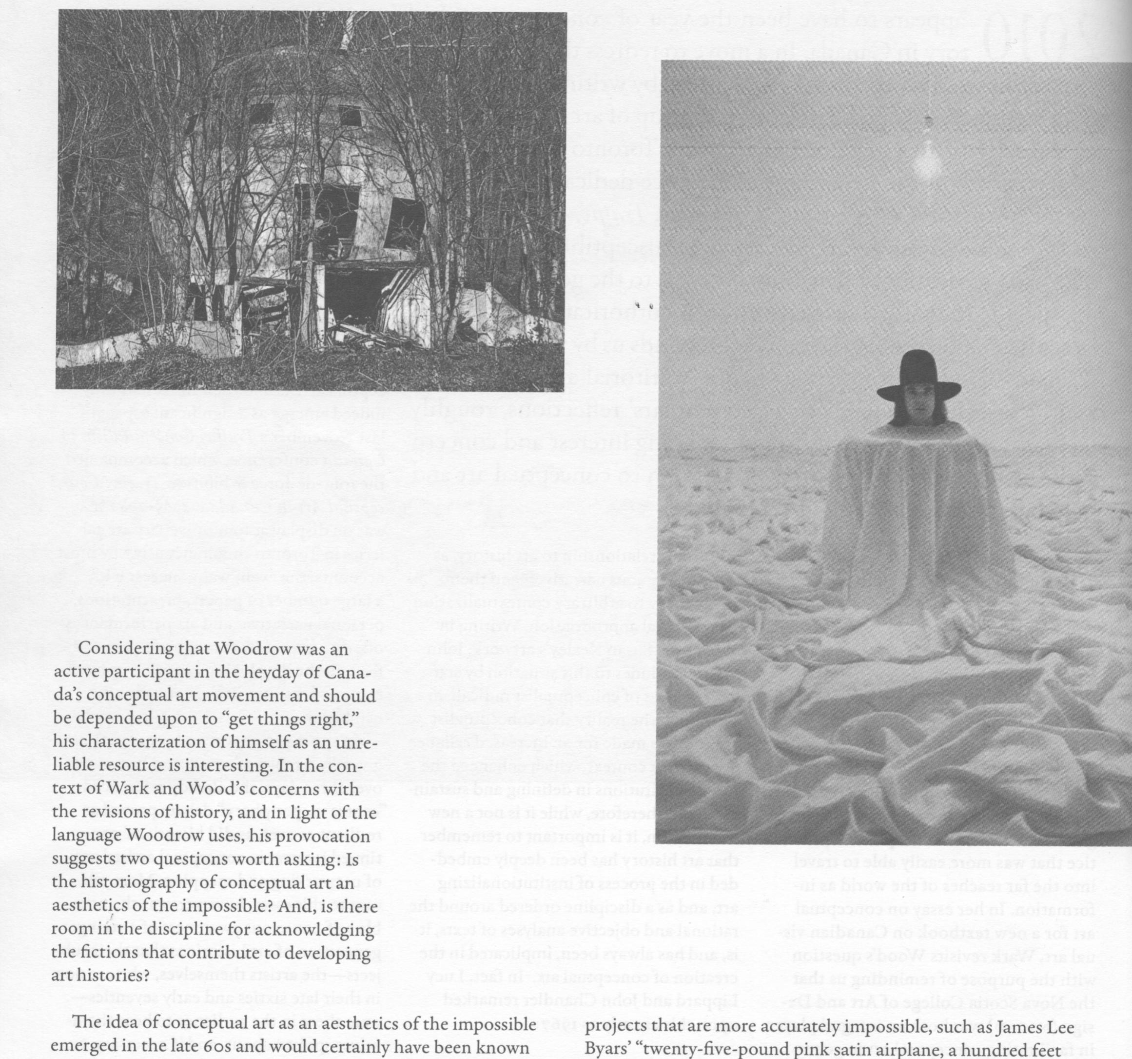 In the many papers and presentations given by a range of artists and historians over three days, ... more In the many papers and presentations given by a range of artists and historians over three days, the already referenced "centre vs. periphery" debate proved as resilient as ever, as did historians' continued interest in conceptual artists' use of networking and mapping. More relevant to this essay, however, was the notable self-conscious awareness of a younger generation of art historians that their subjects - the artists themselves, who are now in their late sixties and early seventies - were there in the audience to hear themselves spoken about, and if necessary, to offer an alternative version to those being proffered by their junior peers. That the latter was a subtext of the whole event is evident in the abstract of a talk given by artist Paul Woodrow, which addressed the ethical stakes of "getting things 'right'": "Writing about the past becomes an aesthetic of the impossible since representation inevitably fails to represent those who were present in the past." Woodrow went on to characterize his recollections of his participation in the 70s art scene of Calgary as those based on faulty memories and a privileged and biased point of view - recollections that thereby contribute to what he called "the creation of a fiction."