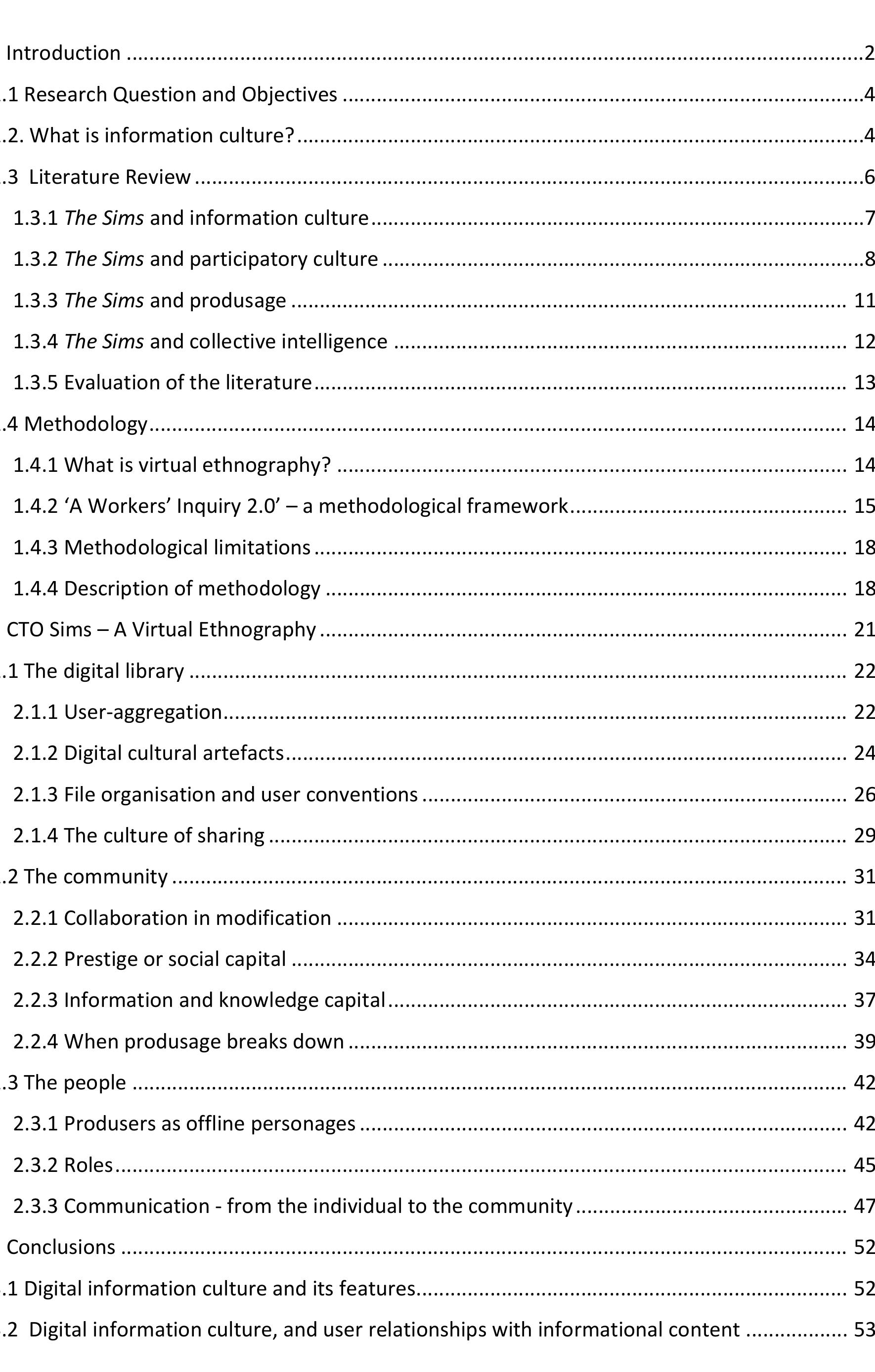 This study looks into the life of a virtual gaming community, CTO Sims – a small slice of a wider... more This study looks into the life of a virtual gaming community, CTO Sims – a small slice of a wider community that engages in what Bruns (2006) has termed produsage, remediating videogame assets and content from a PC game, The Sims (2000) into custom or user-generated content – a practice also called ‘modding’. Through a virtual ethnographic methodology, this study explores the digital library at the heart of CTO Sims, and the participatory culture (Jenkins, 1992; 2006) which has grown up around it. This paper presents a narrative of an online videogaming produsage community, and through a process of immersion uncovers and probes into the everyday practices of commodification and produsage as they take place in the virtual field. The study begins to develop a theory of information culture by observing and exploring the CTO Sims community, its members, and their roles in knowledge and information economies.