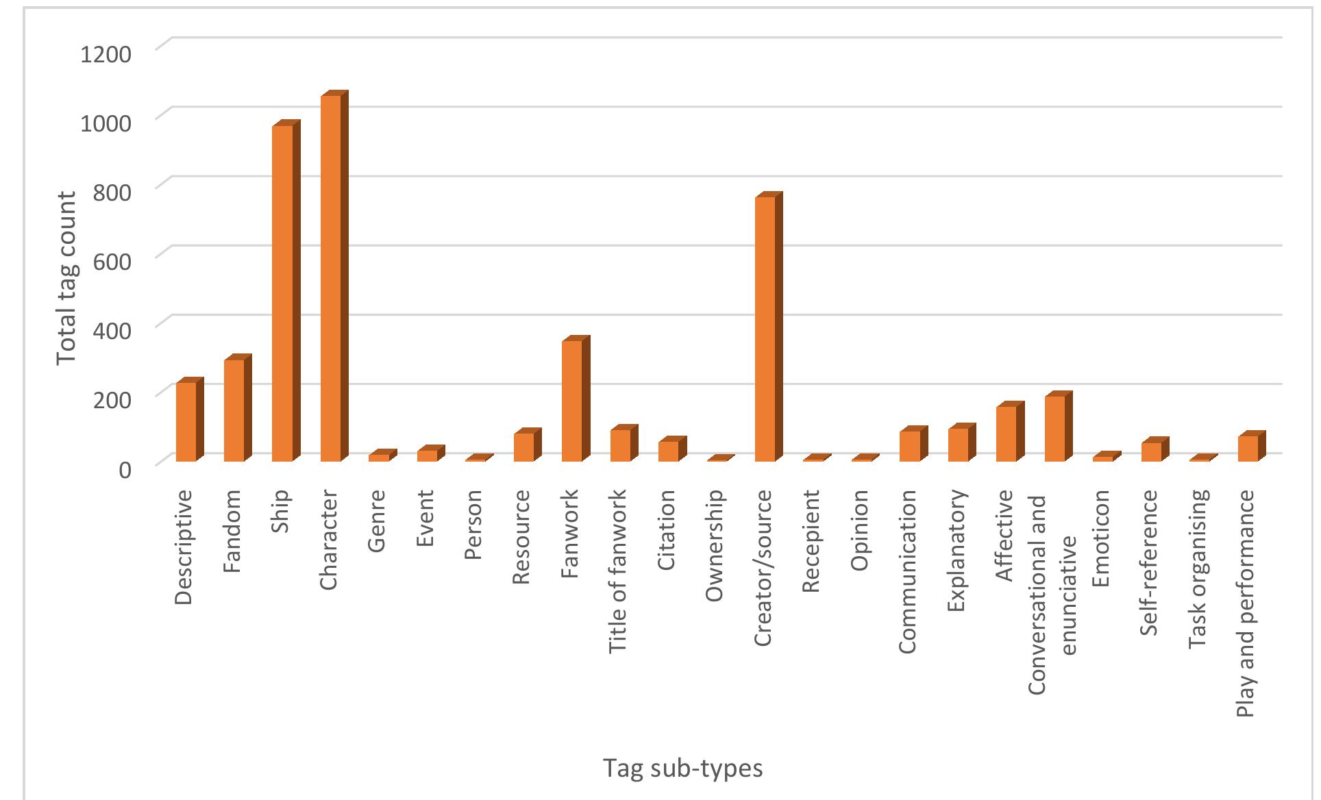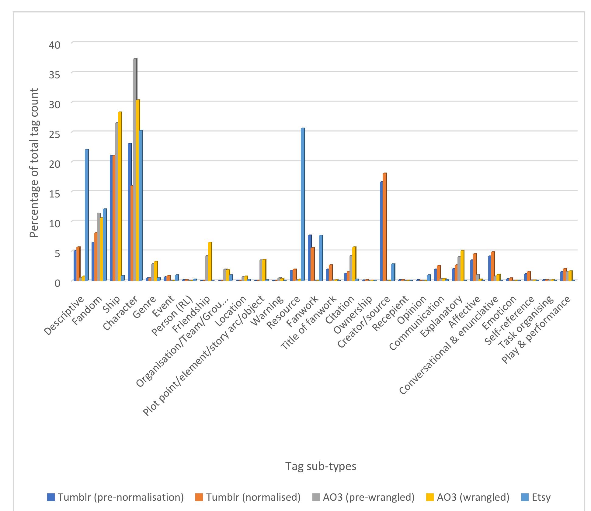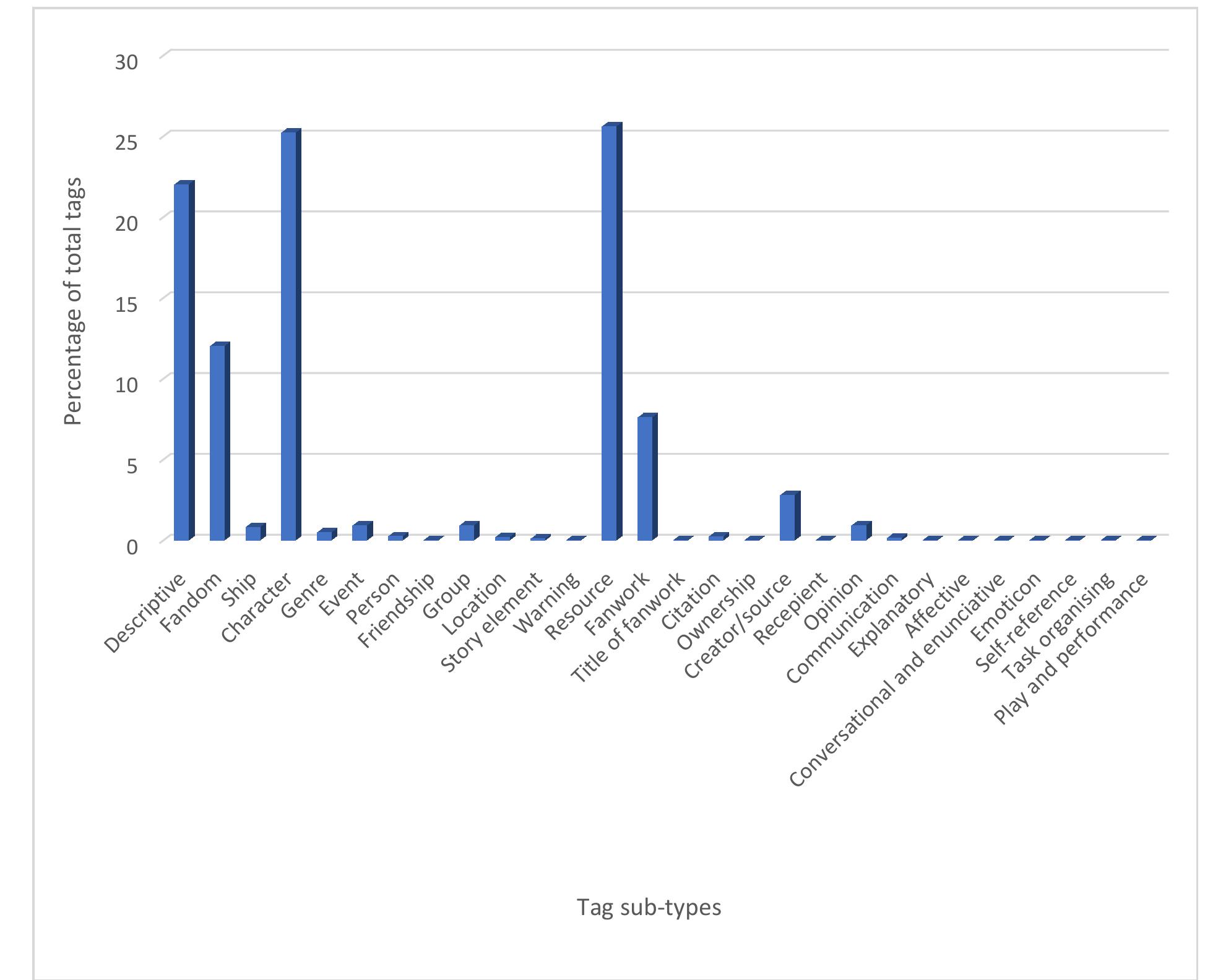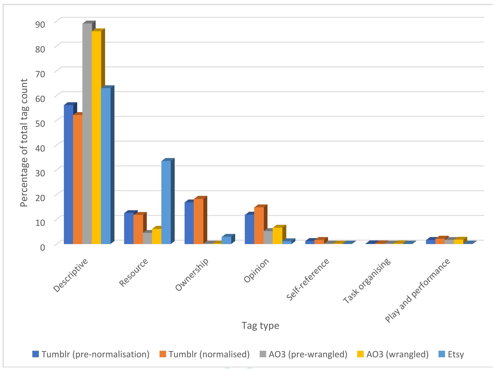 Findings: These showed that fans used tags in a variety of ways quite apart from classification purposes. These included tags being used on Tumblr as meta-commentary and a means of dialogue between users, as well as expressors of emotion and affect towards posts. On AO3 in particular, fans had developed a practice called “tag wrangling” to mitigate the inherent “messiness” of tagging. Evidence was also found of a “hybrid market economy” on Etsy fan stores. From the study findings, a taxonomy of fan-related tags was developed.
