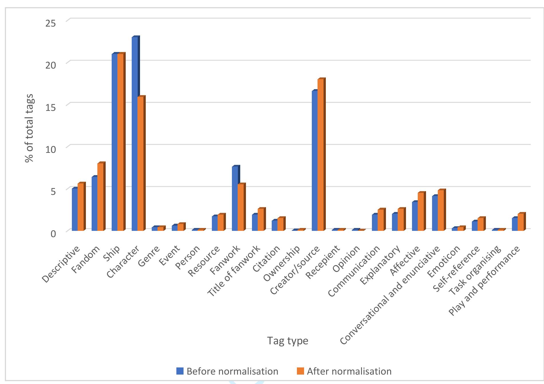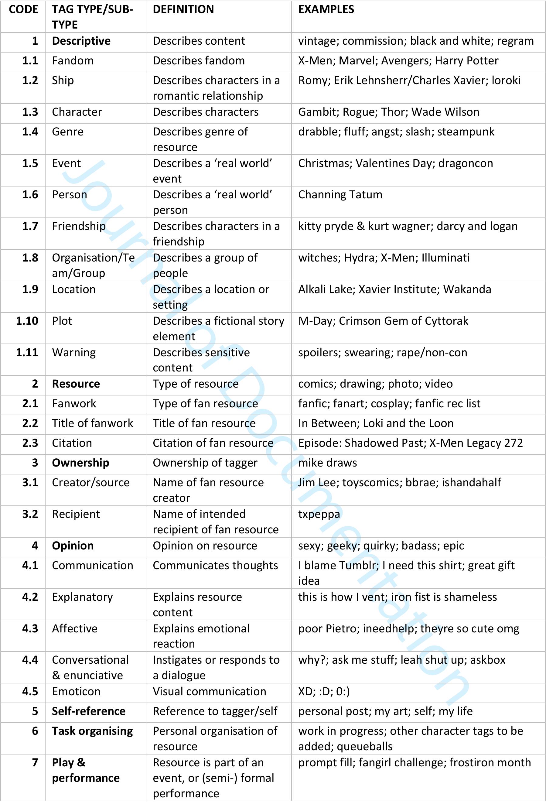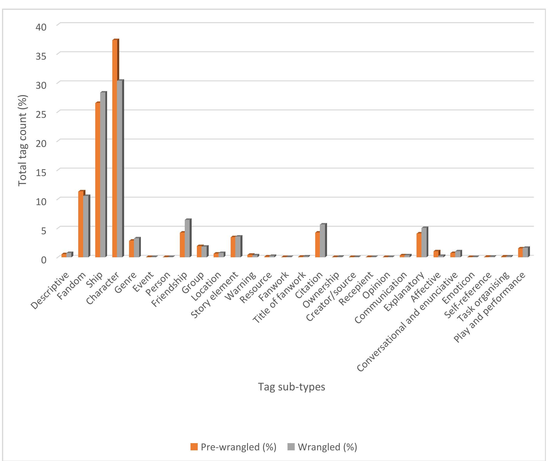 Findings: These showed that fans used tags in a variety of ways quite apart from classification purposes. These included tags being used on Tumblr as meta-commentary and a means of dialogue between users, as well as expressors of emotion and affect towards posts. On AO3 in particular, fans had developed a practice called “tag wrangling” to mitigate the inherent “messiness” of tagging. Evidence was also found of a “hybrid market economy” on Etsy fan stores. From the study findings, a taxonomy of fan-related tags was developed.