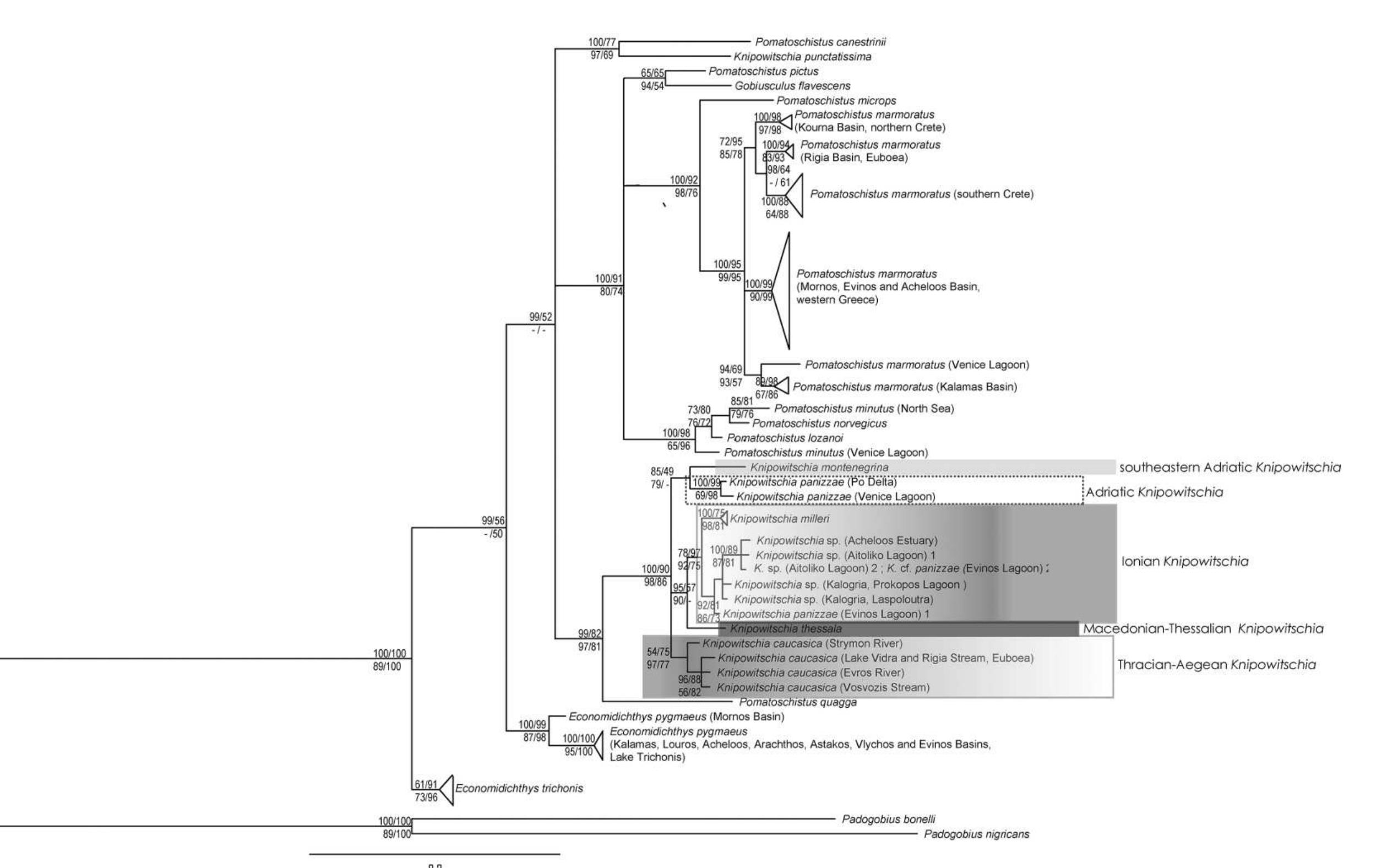 Within the Atlantic-Mediterranean region, the 'sand gobies' are abundant and widespread, and play... more Within the Atlantic-Mediterranean region, the 'sand gobies' are abundant and widespread, and play an important role in marine, brackish, and freshwater ecosystems. They include the smallest European freshwater fish, Economidichthys trichonis, which is threatened by habitat loss and pollution, as are several other sand gobies. Key to good conservation management is an accurate account of the number of evolutionary significant units. Nevertheless, many taxonomic and evolutionary questions remain unresolved within the clade, and molecular studies are lacking, especially in the Balkans. Using partial 12S and 16S mitochondrial ribosomal DNA sequences of 96 specimens of at least eight nominal species (both freshwater and marine populations), we assess species relationships and compare molecular and morphological data. The results obtained do not support the monophyly of Economidichthys, suggesting the perianal organ to be a shared adaptation to hole-brooding rather than a synapomorphy, and urge for a taxonomic revision of Knipowitschia. The recently described Knipowitschia montenegrina seems to belong to a separate South-East Adriatic lineage. Knipowitschia milleri, an alleged endemic of the Acheron River, and Knipowitschia cf. panizzae, are shown to be very closely related to other western Greek Knipowitschia populations, and appear conspecific. A distinct Macedonian-Thessalian lineage is formed by Knipowitschia thessala, whereas Knipowitschia caucasica appears as an eastern lineage, with populations in Thrace and the Aegean. The present study combines the phylogeny of a goby radiation with insights on the historical biogeography of the eastern Mediterranean, and identifies evolutionary units meriting conservation attention.