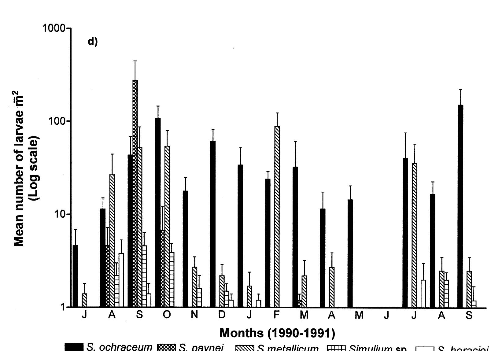Abstract. Simulium metallicum sibling species E was identified cytotaxonomically from an onchocer... more Abstract. Simulium metallicum sibling species E was identified cytotaxonomically from an onchocerciasis focus at Altamira in northern Venezuela. S. metallicum E larvae were sampled monthly from two small mountain streams over a 15-month period (July 1990 to September 1991) and eleven habitat variables were measured at two altitudes. One stream consistently harboured much higher densities of S. metallicum E larvae than the other, with three annual peaks of abundance: during the dry season and at the beginning and end of the rainy season. These peak densities were correlated with high rainfall 4 months previously. Larvae were most abundant on submerged rocks and fallen leaves, in small shallow areas characterized by slow water current, high conductivity and sparse terrestrial vegetation cover. Stream variables which best explained the temporal changes in abundance were water discharge and conductivity. The population dynamics of S. metallicum E appeared to be influenced primarily by interactions between stream discharge and substrate stability. Relevance of these results to vector control with larvicides is discussed.