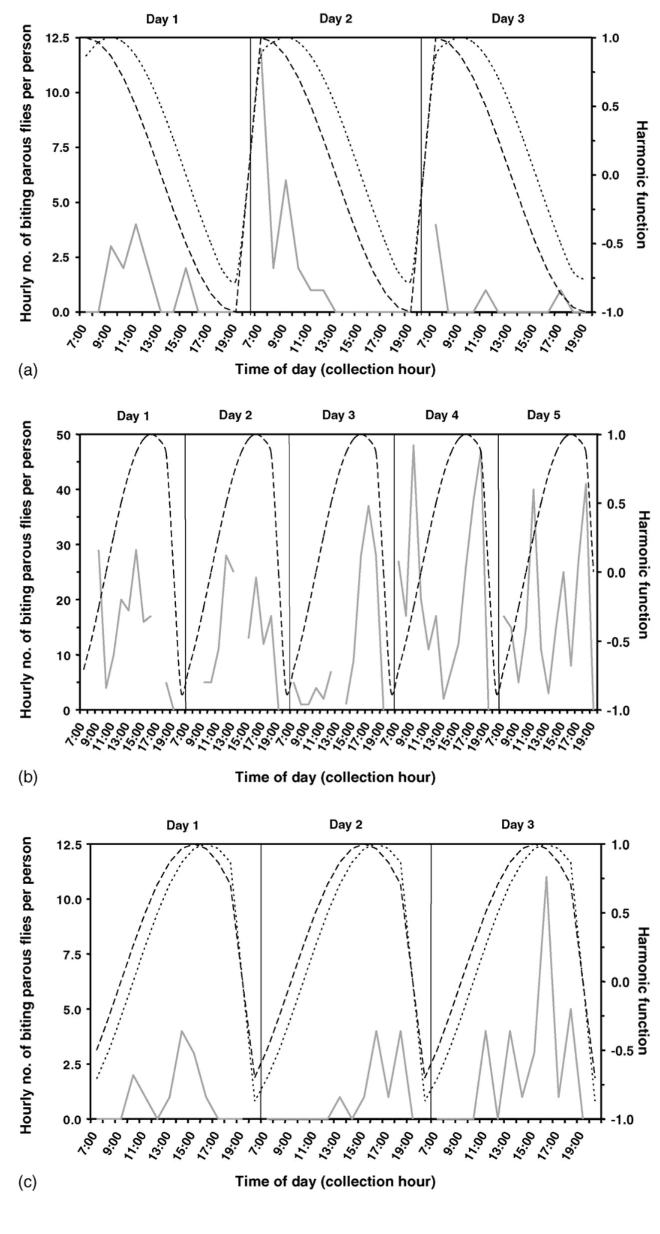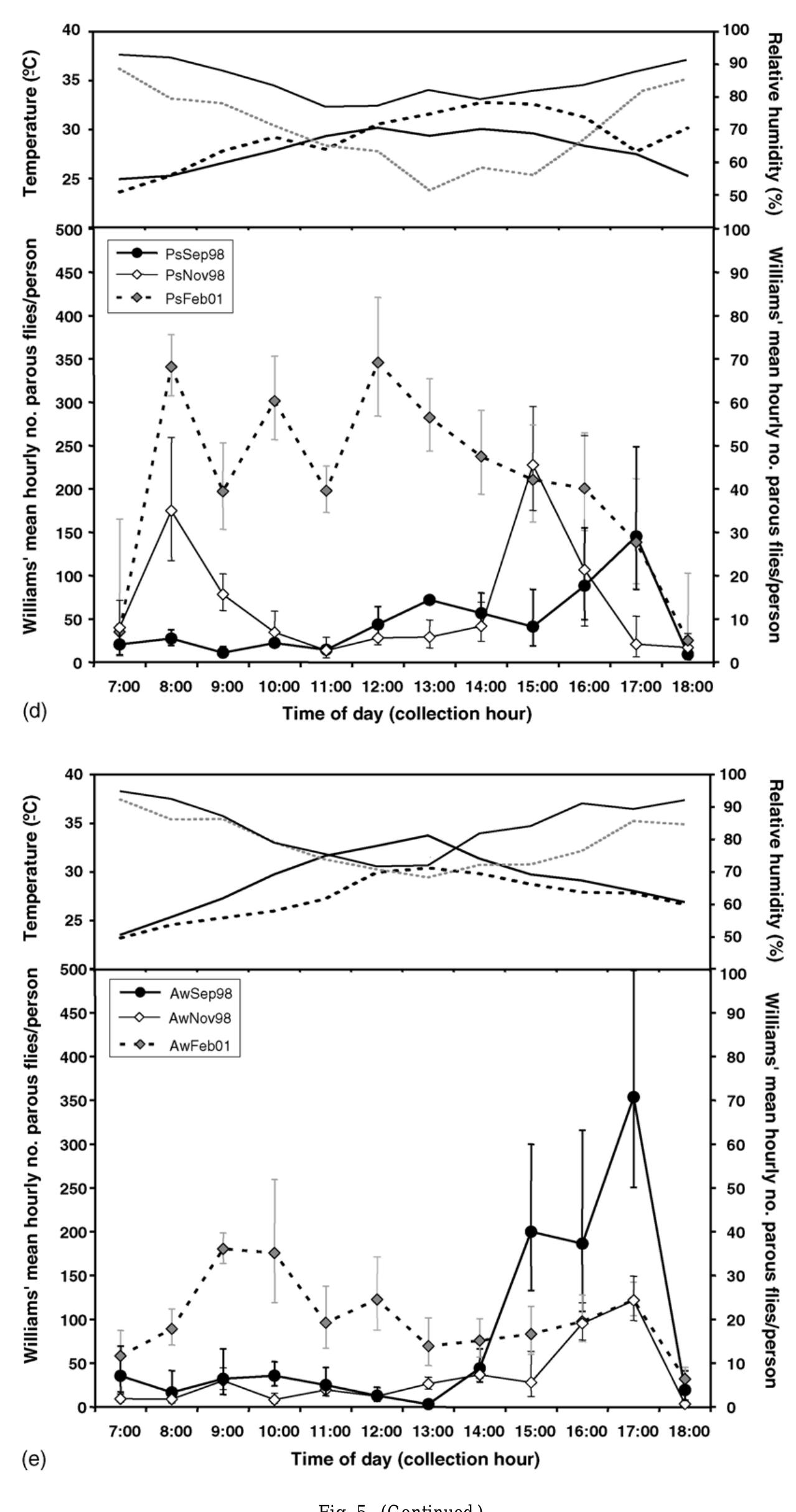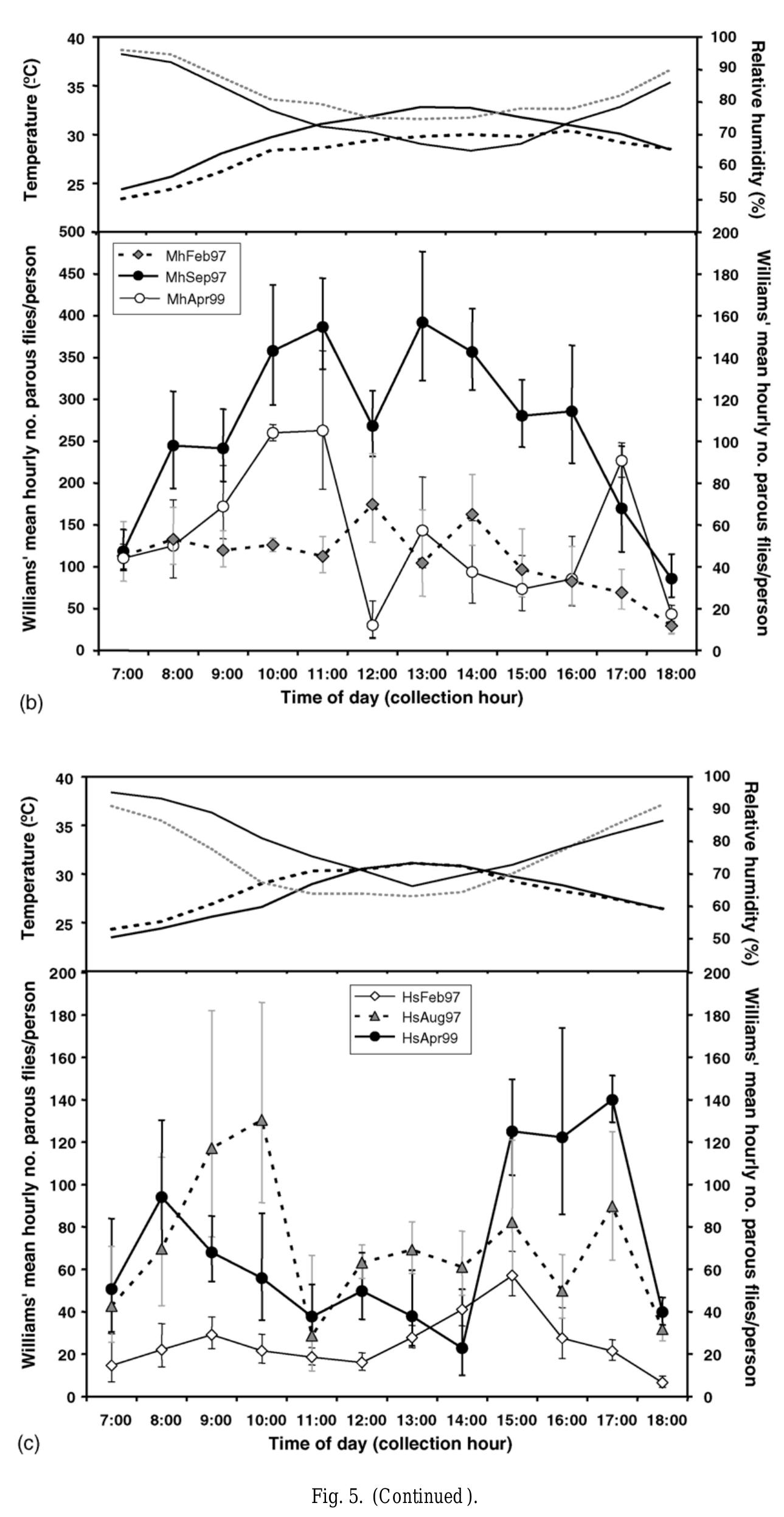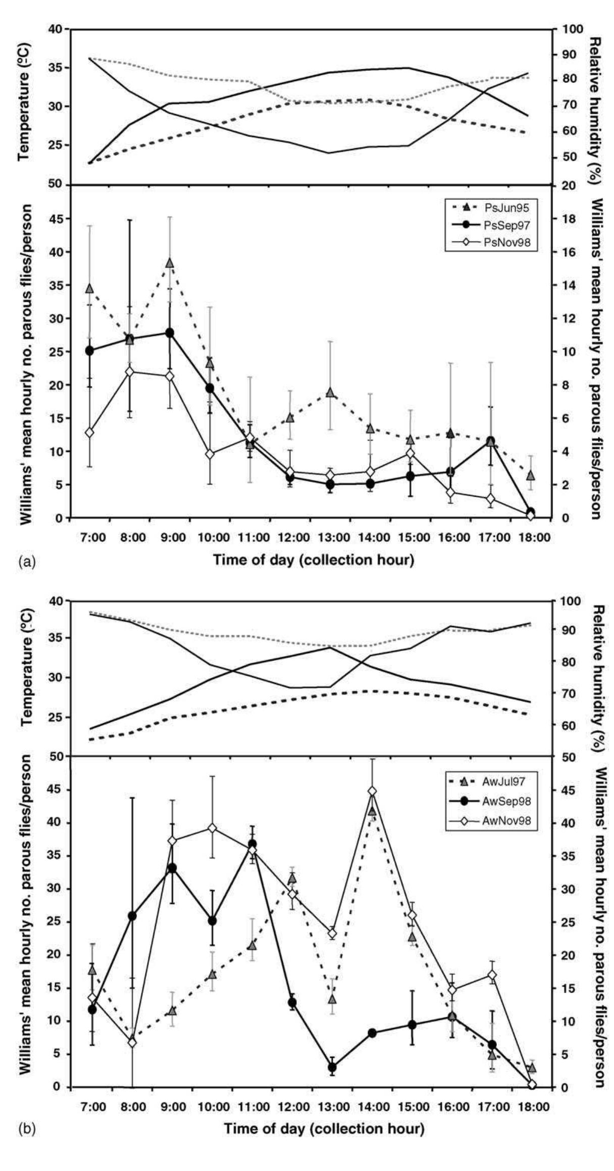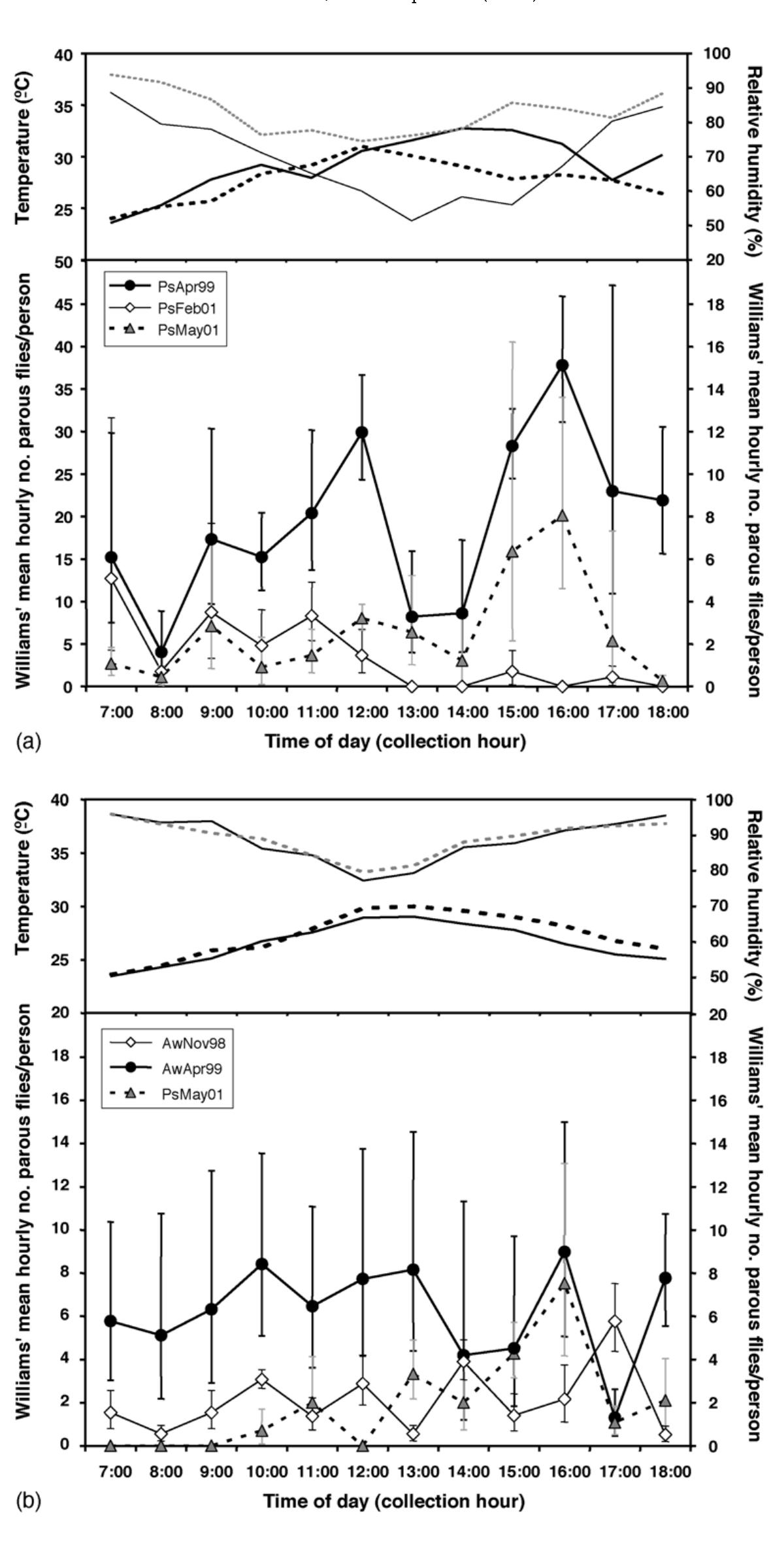 We describe the hourly patterns of parous biting activity of the three main simuliid vectors of h... more We describe the hourly patterns of parous biting activity of the three main simuliid vectors of human onchocerciasis in the Amazonian focus straddling between Venezuela and Brazil, namely, Simulium guianense s.l. Wise; S. incrustatum Lutz, and S. oyapockense s.l. Floch and Abonnenc. Time series of the hourly numbers of host-seeking parous flies caught in five Yanomami villages during dry, rainy, and their transition periods from 1995 to 2001 were investigated using harmonic analysis (assuming an underlying circadian rhythm) and periodic correlation (based on Spearman's r). Parous S guianense s.l. showed a bimodal activity pattern, with a minor peak in mid-morning and a major peak at 16:00 h. S. incrustatum exhibited mainly unimodal activity during either early morning or midday according to locality. S. oyapockense s.l. bit humans throughout the day mainly between 10:00 and 16:00 h but also showed bimodal periodicity in some localities. Superimposed on the endogenous, species-specific daily cycles, parous activity showed variation according to locality, season, air temperature and relative humidity, with biting being promoted by warmer and drier hours during wet seasons/periods and reduced during hotter times in dry seasons or transitions. The results are discussed in terms of their implications for blackfly biology and ecology as well as onchocerciasis epidemiology and control.